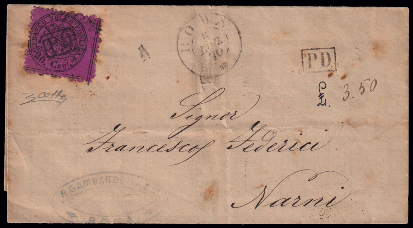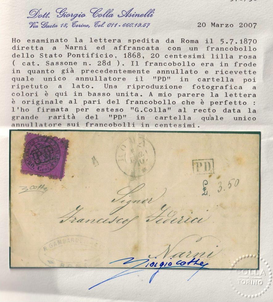 62 L imageIII EMISSIONE DENTELLATA. Lettera spedita da Roma per Narni il 5/7/1870 ed affrancata con un francobollo da 20 centesimi lilla rosa riutilizzato da altra affrancatura. Ricevette come unico annullatore il timbro PD riquadrato ripetuto anche sulla soprascritta (Sassone p. R1). Timbro di arrivo al retro. Dettagliato certificato G. Colla (2007). rarità storico postale dell'ultimo periodo pontificio. (Image) (ImageA) (ImageB)