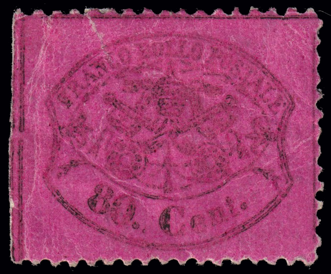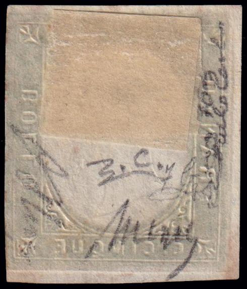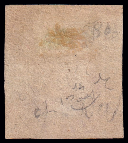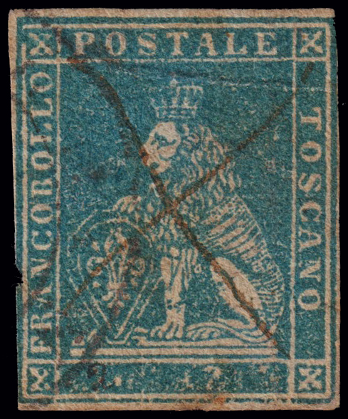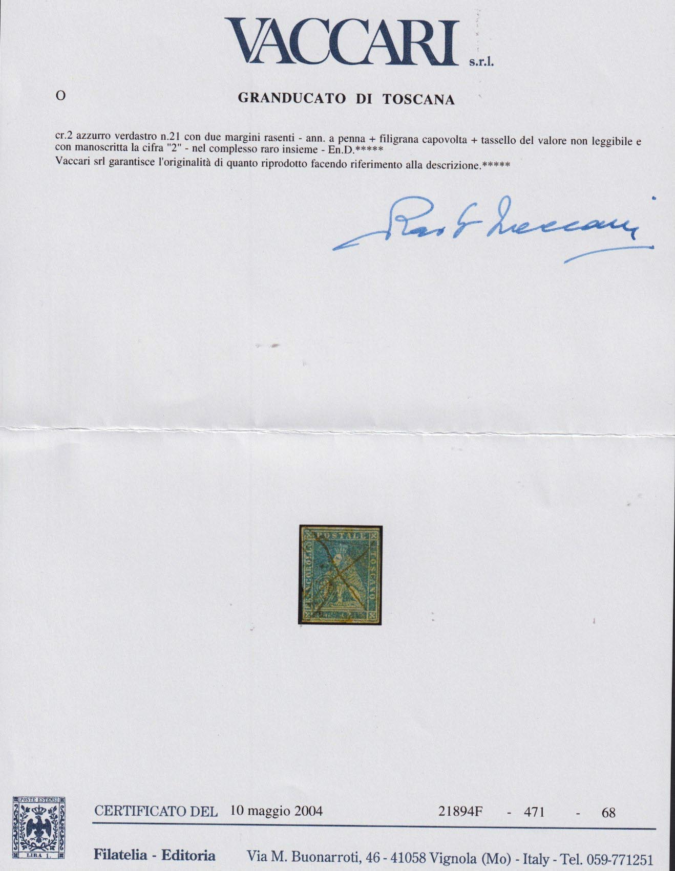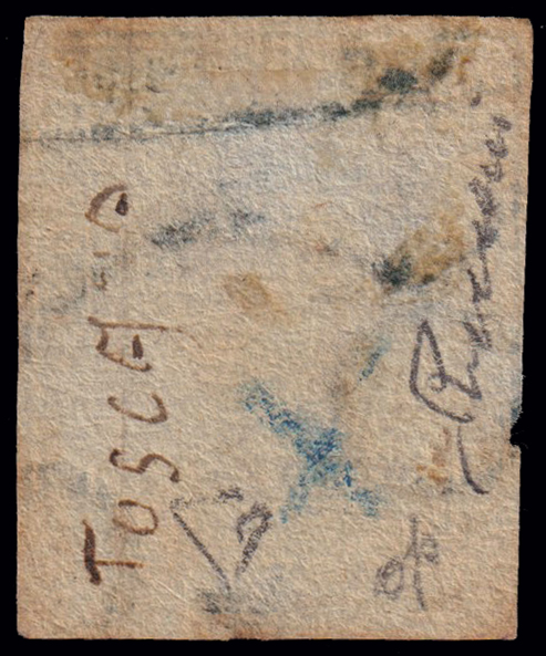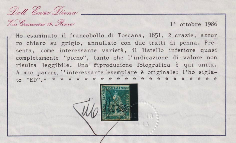 77 U imageTASSELLO INCHIOSTRATO E CIFRA DEL VALORE SCRITTA A PENNA. Esemplare da 2 crazie azzurro chiaro su grigio (Classici d'Italia TS5, Sassone 5) che presenta inchiostrazione anomala e assenza delle scritte nel cartiglio e cifra del valore "2" scritta con inchiostro nero. Filigrana ben visibile "capovolta", annullo a tratti incrociati a penna. Alcuni difetti nulla tolgono alla rarità dell'insieme probabilmente unico con tali caratteristiche. Dettagliati certificati "storico" E. Diena (1986) e Vaccari (2004). (Image) (ImageA) (ImageB) (ImageC)