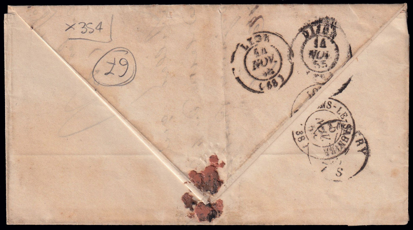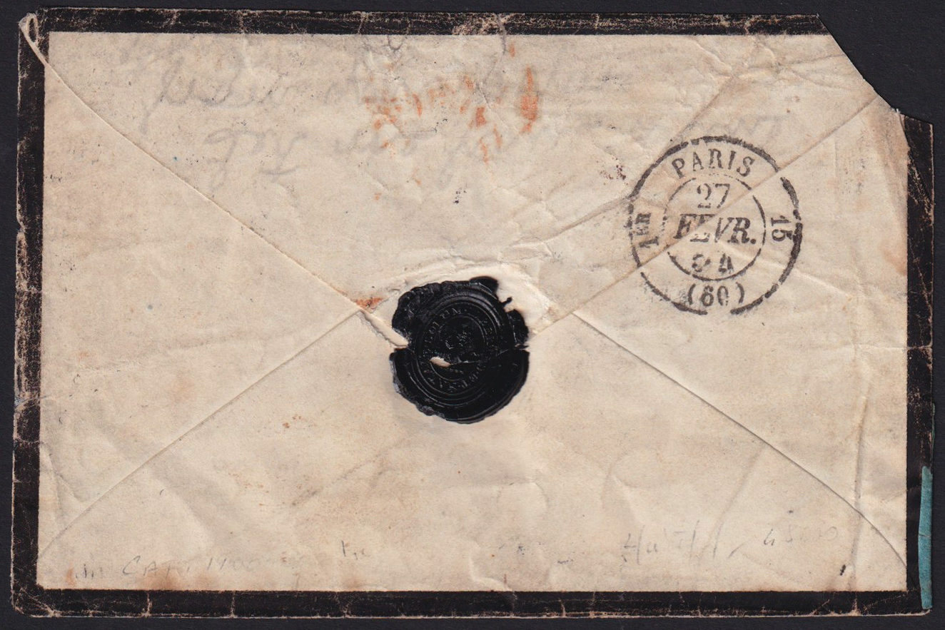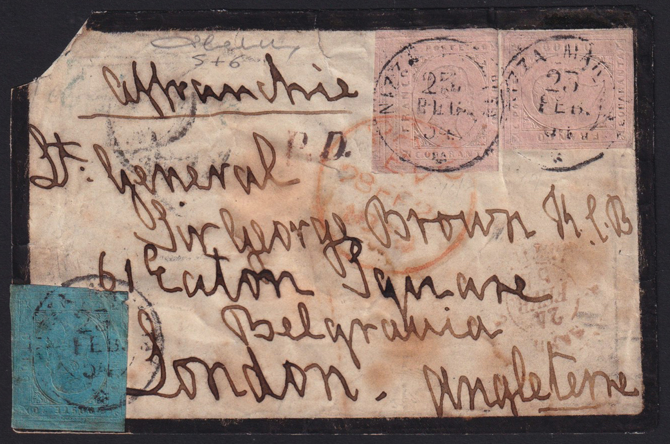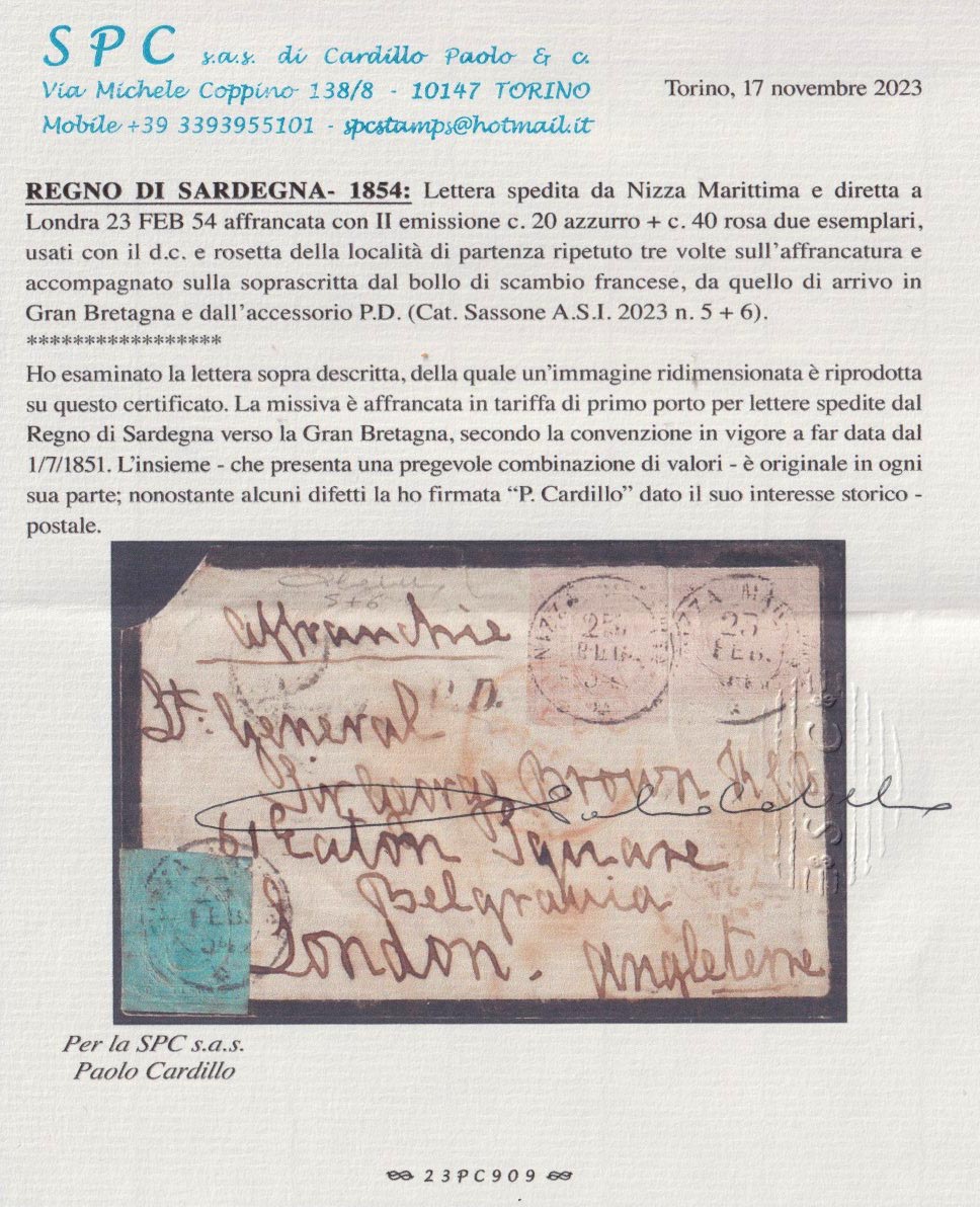 64 L image1853 IMPRESSIONE A RILIEVO SU CARTA COLORATA. Lettera spedita da Nizza Marittima per Londra il 23/2/1854 ed affrancata in tariffa primo porto 1 lira con due francobolli da 40 centesimi ed un esemplare da 20 centesimi (Classici d'Italia SS13+14, Sassone 5+6)annullati con il timbro doppio cerchio e rosetta. Timbri di transito e arrivo. Dettagliato certificato Cardillo (2023). Alcuni difetti nulla tolgono alla rarità dell'affrancatura. (Image) (ImageA) (ImageB)