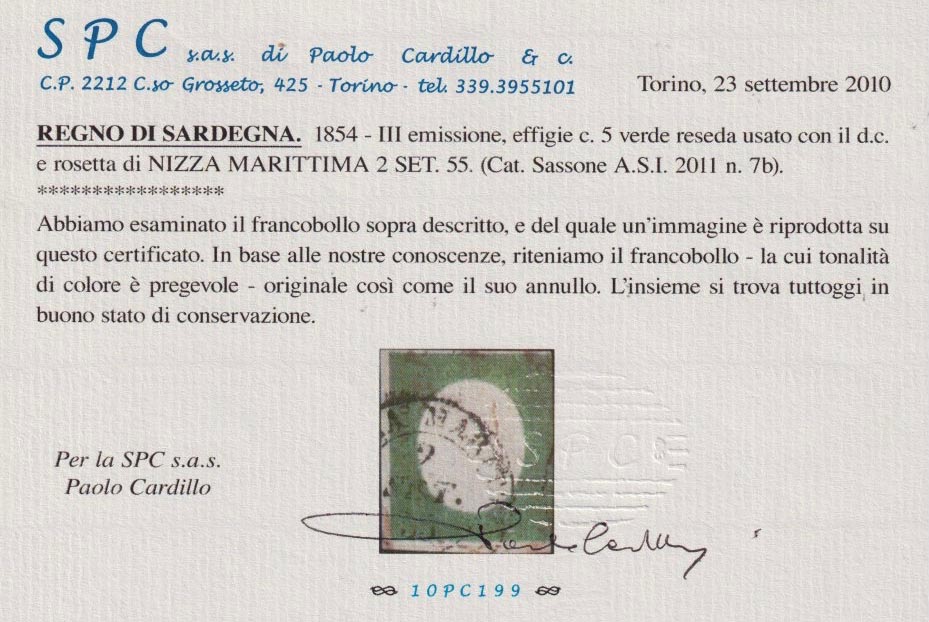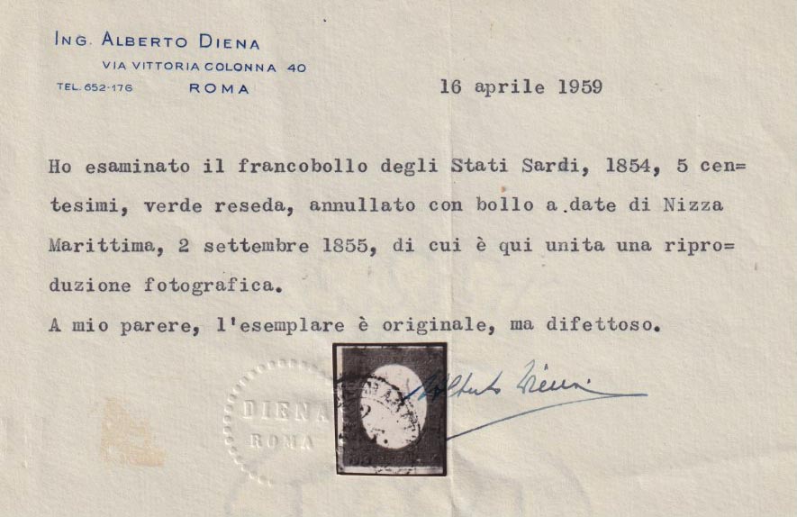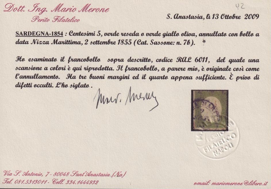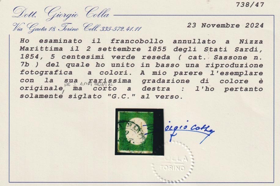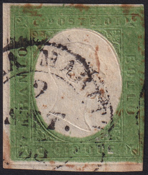 65 U image1854 EFFIGIE A RILIEVO SU CORNICE A FONDO PIENO. Francobollo da 5 centesimi della rarissima tonalità VERDE RESEDA (Sassone 7b), annullato con 3 ampi margini e toccato a destra. Dettagliati certificati di garanzia Colla (2024), "sorico" A. Diena (1959). La tonalità di colore più rara delle prime emissioni sarde (Image) (ImageA) (ImageB) (ImageC) (ImageD) (ImageE)
