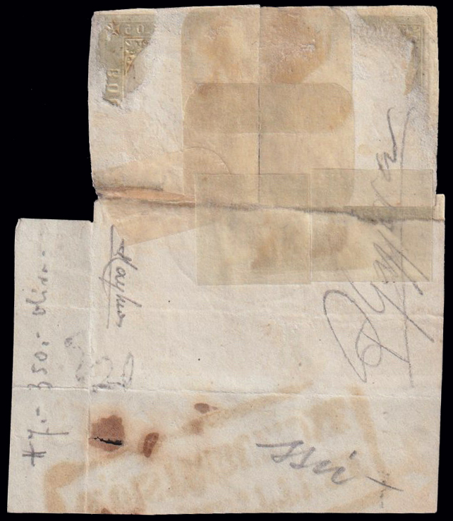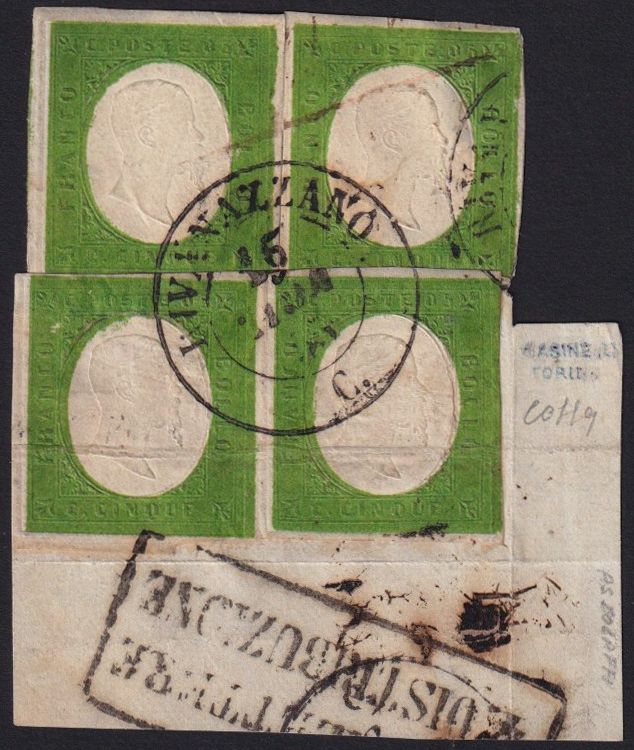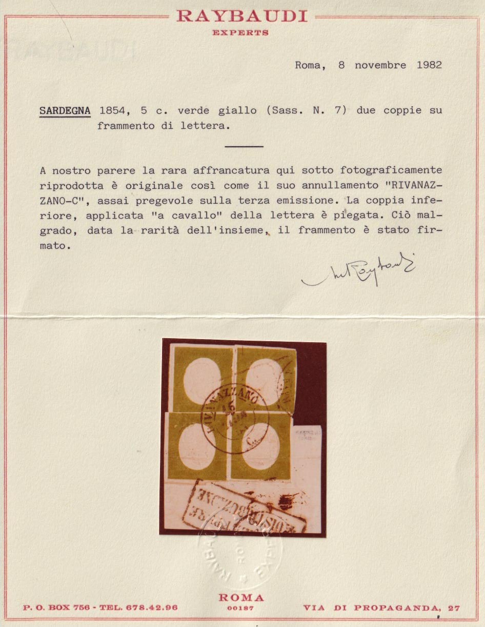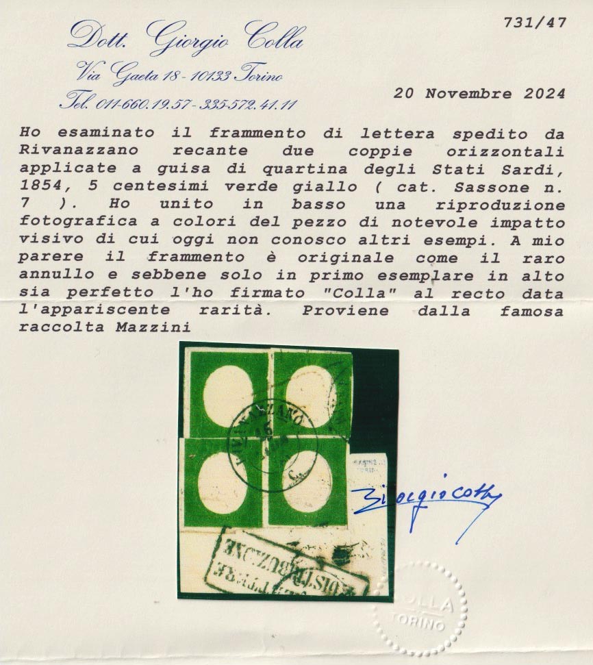 66 F image1854 EFFIGIE A RILIEVO SU CORNICE A FONDO PIENO. Grande frammento di lettera affrancato con due rare coppie orizzontali a guisa di quartina del francobollo da 5 centesimi (Classici d'Italia SS15, Sassone 7) annullati con il timbro a doppio cerchio "RIVANAZZANO - C". Dettagliati certificati Raybaudi (1982) e G.Colla (2024). Appartenuto alla famosa collezione Mazzini presenta alcuni difetti che nulla tolgono alla estrema rarità dell'insieme. (Image) (ImageA) (ImageB) (ImageC)