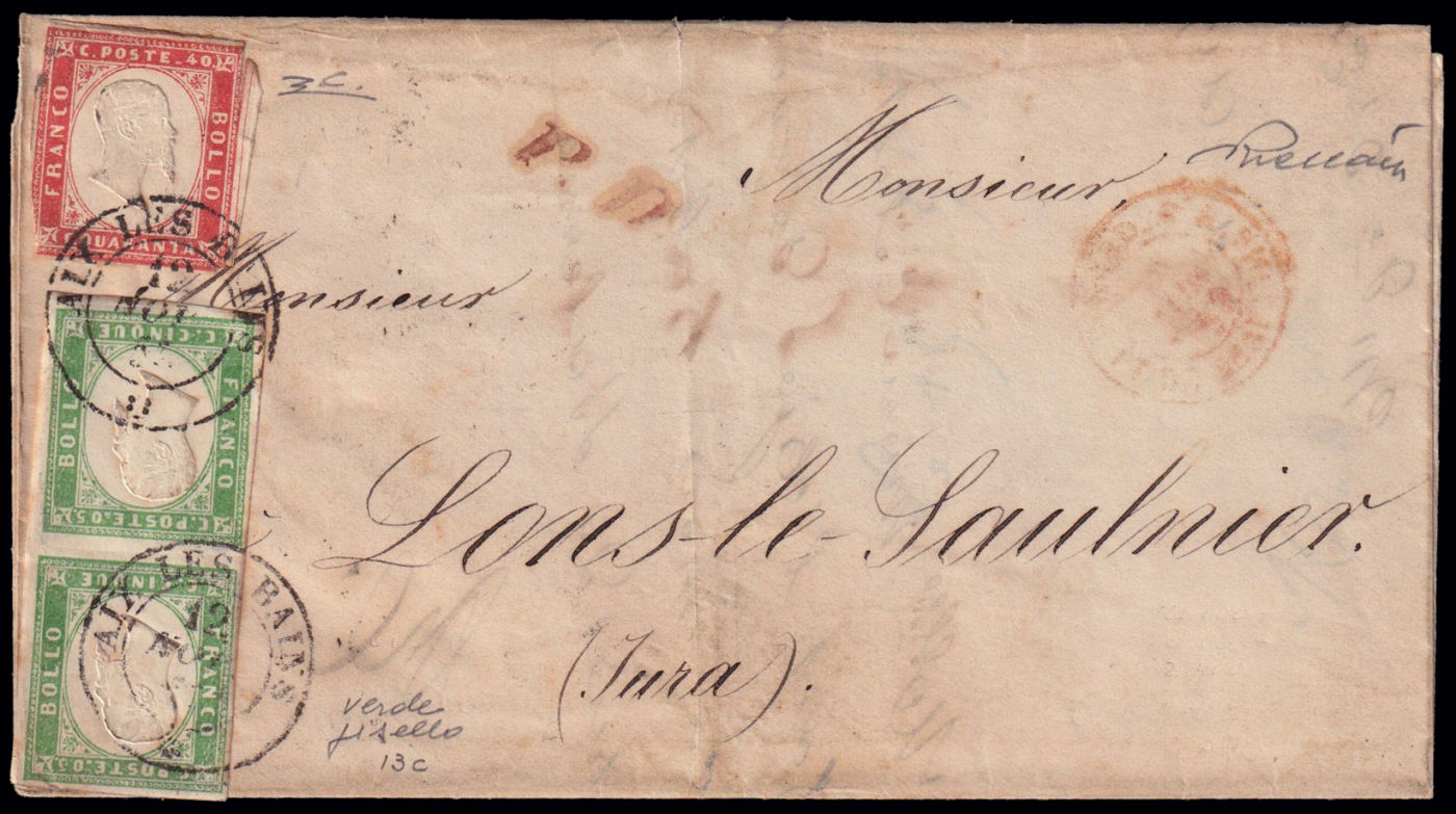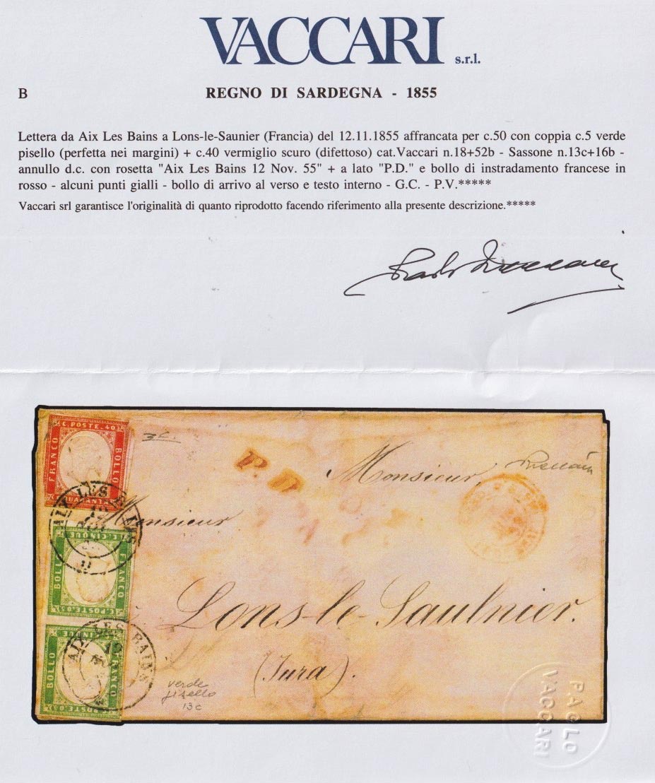 67 L imageIV EMISSIONE. Soprascritta piegata come una lettera, completa del testo, spedita da Aix Les Bains per Lons Le Saunier in data 12/11/1855 ed affrancata in tariffa 50 centesimi con un francobollo da 40 centesimi vermiglio scuro (difettoso) e rarissima coppia verticale ben marginata del 5 centesimi VERDE PISELLO (Classici d'Italia SS18a, Sassone 13c). Timbri di transito e arrivo. Dettagliato certificato di perizia e garanzia Vaccari (2014). (Image) (ImageA) (ImageB)