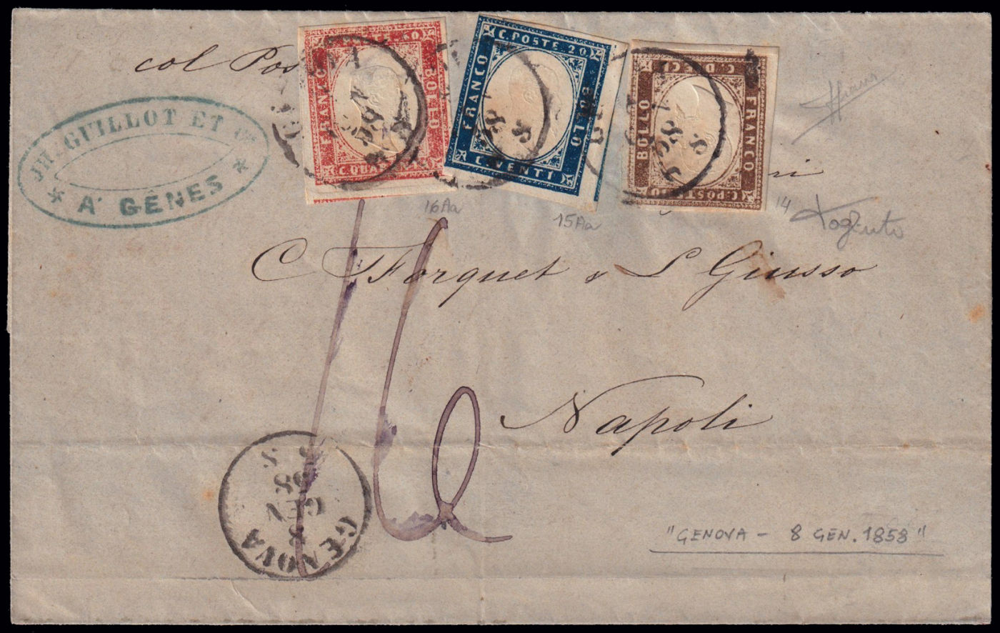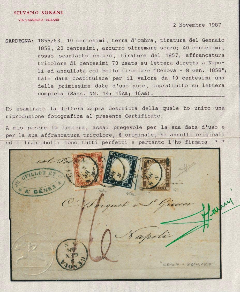 68 L imageIV EMISSIONE - PRIMI GIORNI D'USO DEL 10 CENTESIMI. Lettera completa del testo spedita da Genova per Napoli in data 8/1/1858 ed affrancata con combinazione composta da tre francobolli per complessivi 70 centesimi rispettivamente da 40 centesimi rosso scarlatto chiaro, 20 centesimi azzurro oltremare scuro e un 10 centesimi terra d'ombra, tutti ben marginati. Tassazione "16" grana sulla soprascritta. Dettagliato certificato "storico" Sorani (1987). (Image) (ImageA) (ImageB)