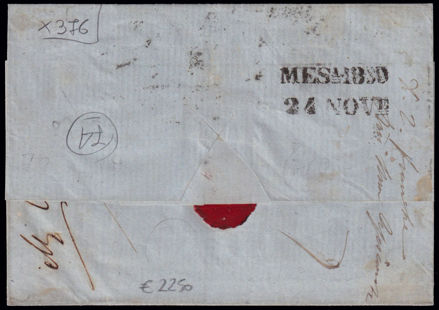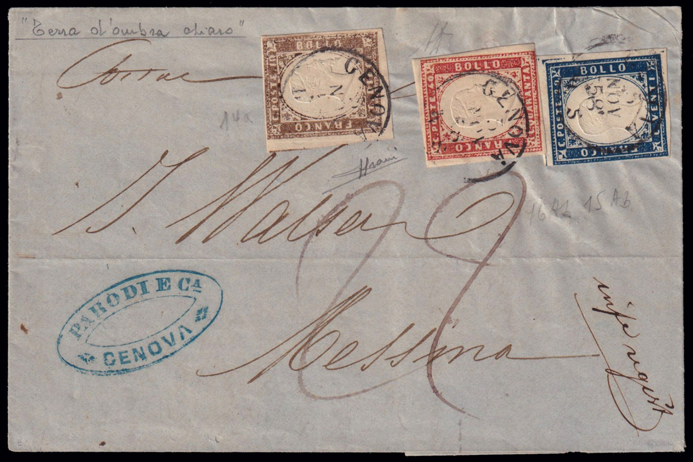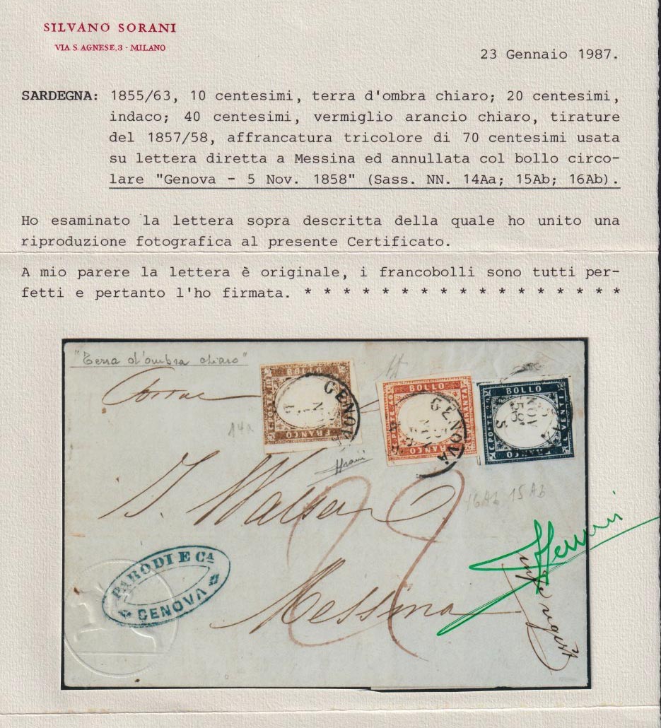 69 imageIV EMISSIONE - PRIMI GIORNI D'USO DEL 10 CENTESIMI. Lettera completa del testo spedita da Genova per Messina in data 5/11/1858 ed affrancata con combinazione composta da tre francobolli per complessivi 70 centesimi rispettivamente da 40 centesimi vermiglio arancio chiaro, 20 centesimi indaco e un 10 centesimi terra d'ombra chiaro con margini regolari. Tassazione "22" grana sulla soprascritta. e timbro di arrivo al retro. Dettagliato certificato "storico" Sorani (1987). (Image) (ImageA) (ImageB)