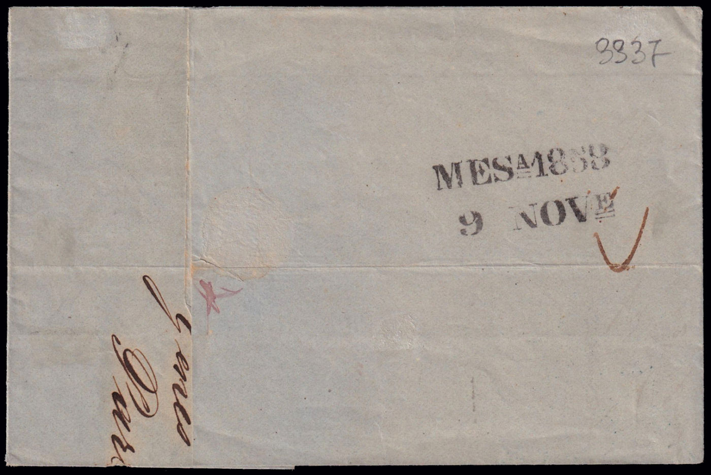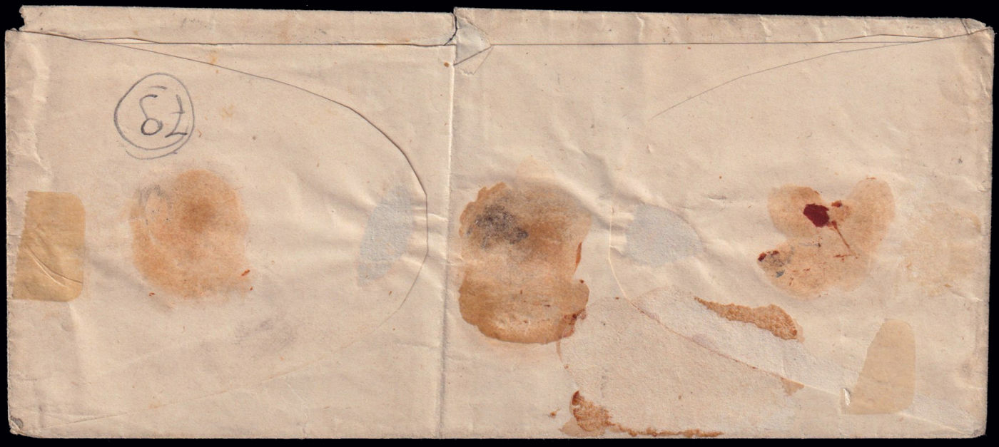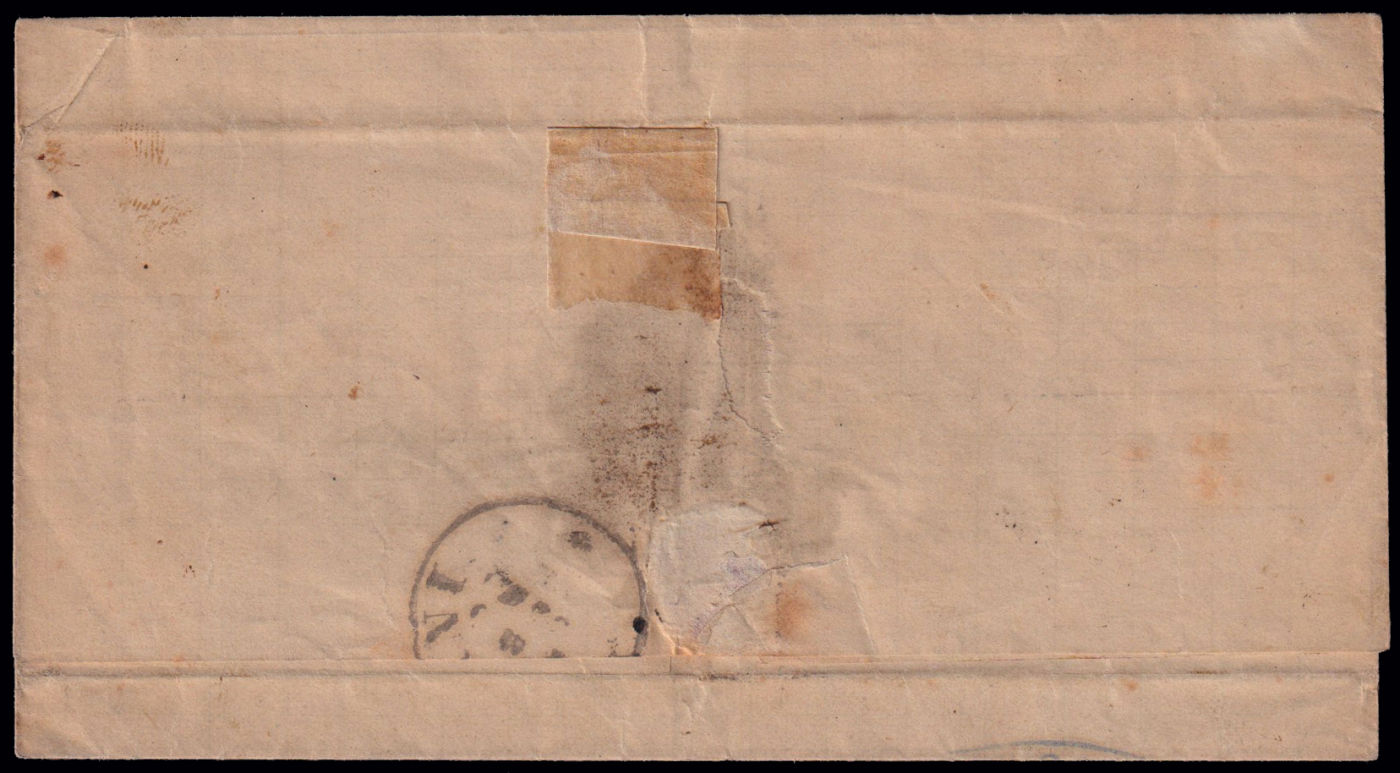 69 imageIV EMISSIONE - PRIMI GIORNI D'USO DEL 10 CENTESIMI. Lettera completa del testo spedita da Genova per Messina in data 5/11/1858 ed affrancata con combinazione composta da tre francobolli per complessivi 70 centesimi rispettivamente da 40 centesimi vermiglio arancio chiaro, 20 centesimi indaco e un 10 centesimi terra d'ombra chiaro con margini regolari. Tassazione "22" grana sulla soprascritta. e timbro di arrivo al retro. Dettagliato certificato "storico" Sorani (1987). (Image) (ImageA) (ImageB)