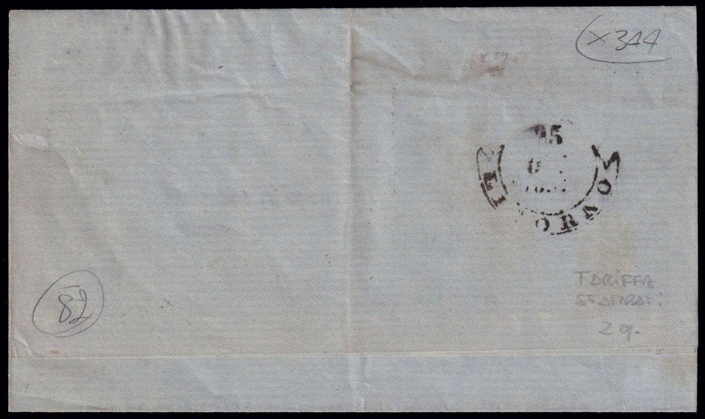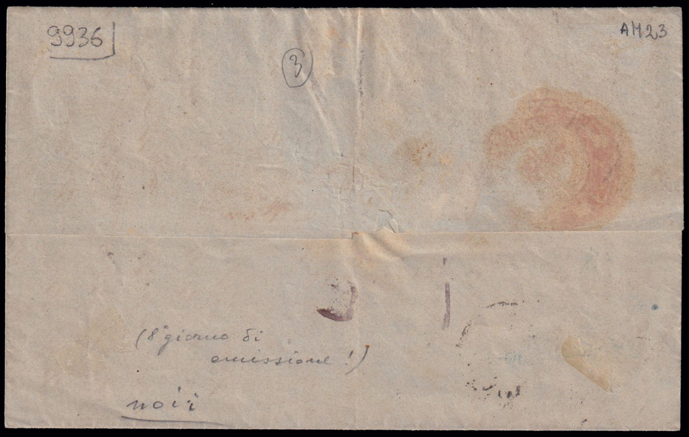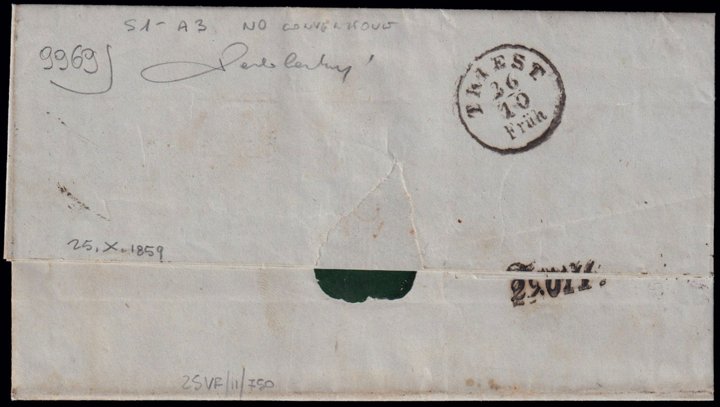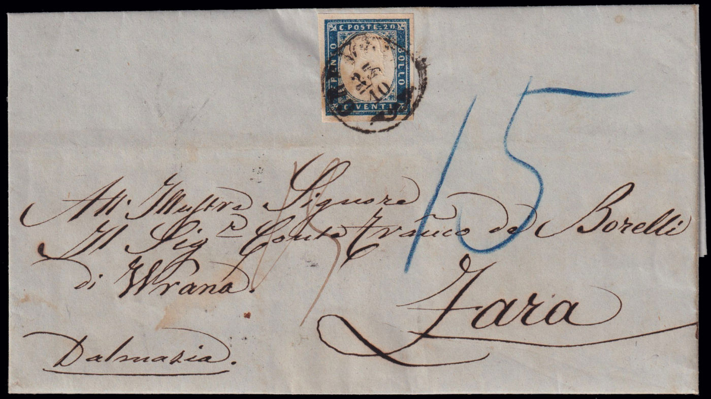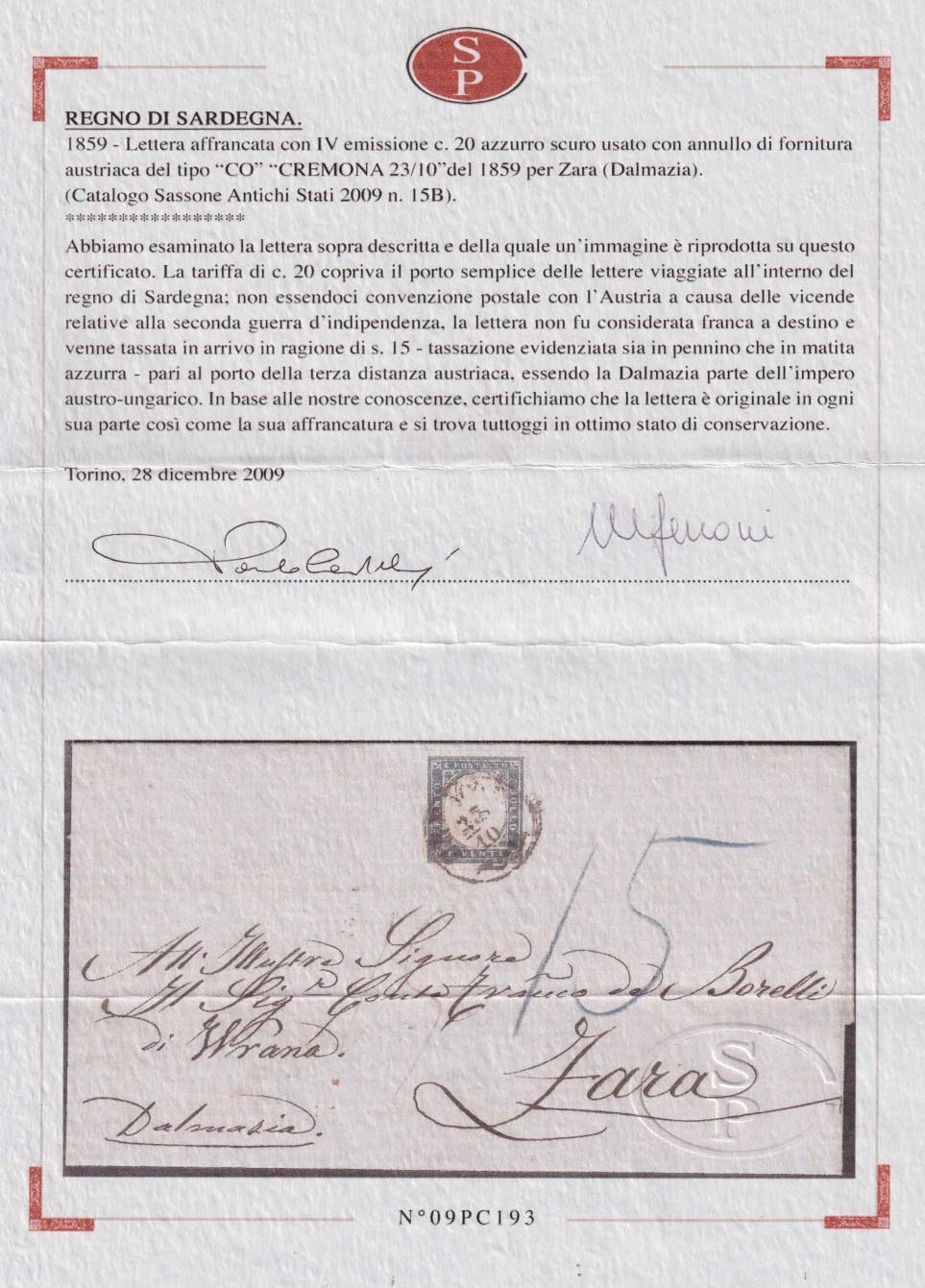 70 L imageRAPPORTI POSTALI FRA STATI. Lettera completa del testo spedita nel 1859 da Cremona per Zara (impero austroungarico) ed affrancata con un francobolli da 20 centesimi (ben marginato) per coprire il porto sardo, annullato col timbro di foggia austriaca "Cremona 23/10". La lettera venne tassata in arrivo "15" perchè interrotta la convenzione postale fra i due stati a causa delle vicende belliche. Timbri di transito e arrivo. (Image) (ImageA) (ImageB)