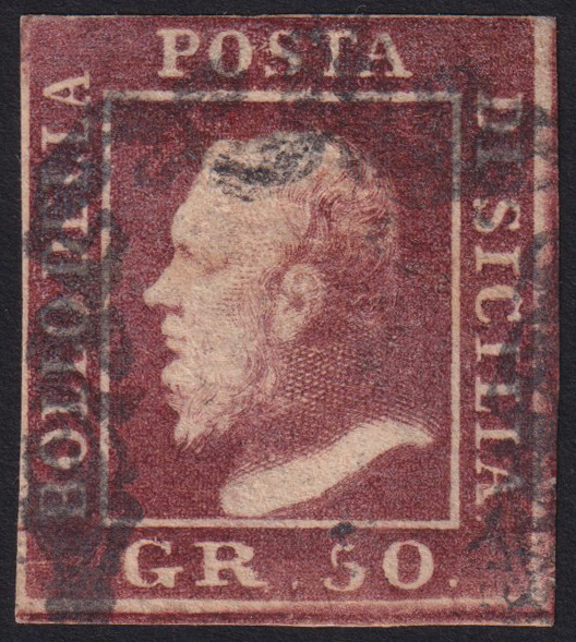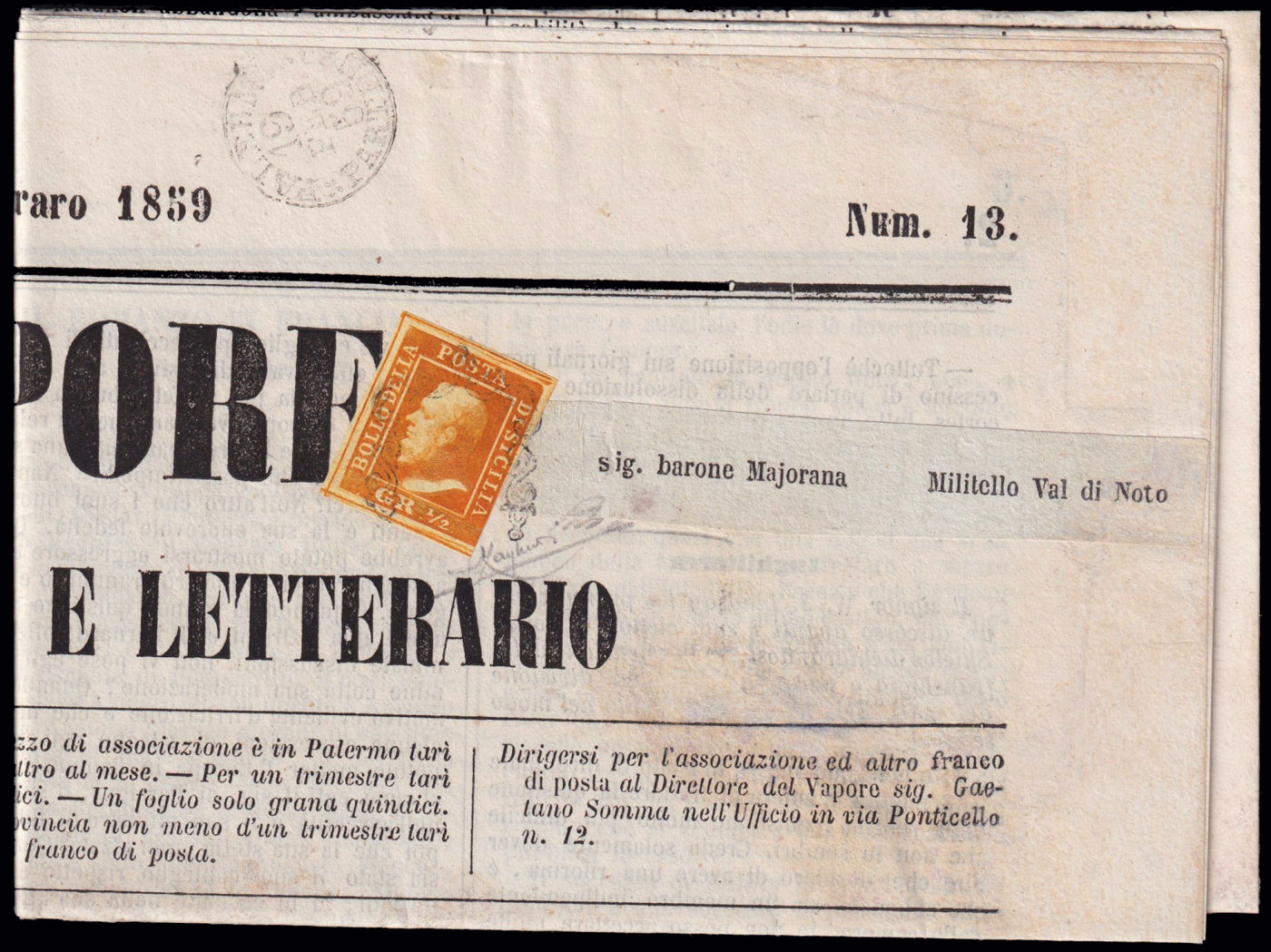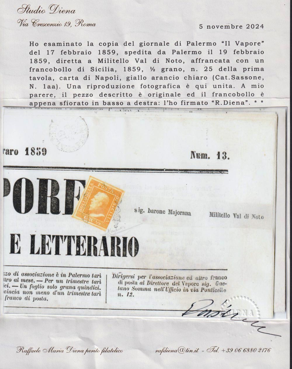 71 L imageGIORNALE IL VAPORE. Copia datata 17/2/1959 spedita da Palermo per Militello val di Noto il 19/2/1859 ed affrancata con il francobollo da 1/2 grano caratteristico della posizione 25 della I tavola, carta di Napoli giallo arancio chiaro con 3 margini giganti e appena sfiorato in basso a destra (Sassone 1aa, Classici d'Italia SC 1), annullato col timbro a "ferro di cavallo". Dettagliato certificato Oro Diena (2024). (Image) (ImageA)