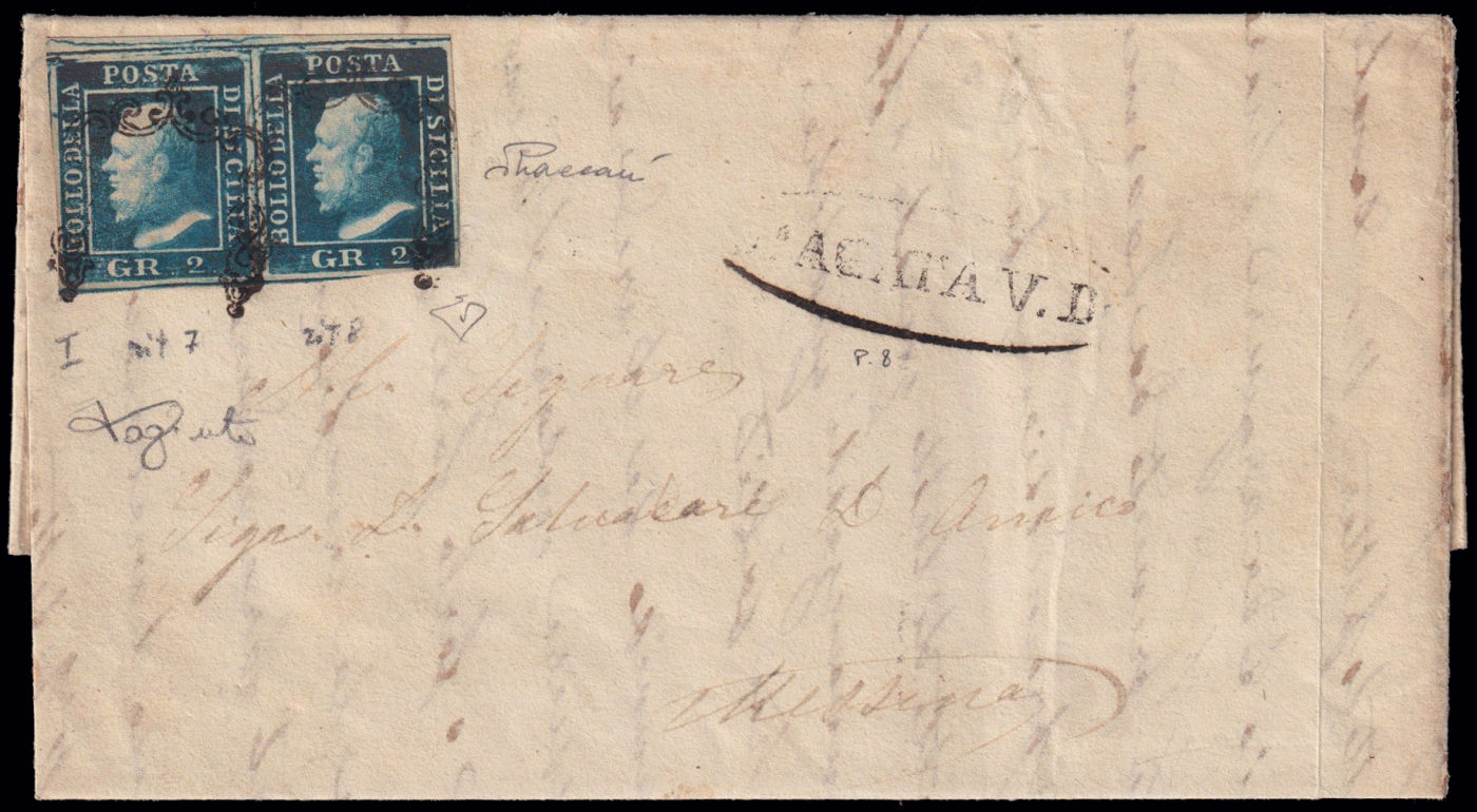 72 L imageCOPPIA DI FRANCOBOLLI RITOCCATI. Coppia orizzontale di francobolli da 2 grana I tavola carta di Napoli (Classici d'Italia SC3, Sassone n.6f, posizioni 7-8) che presentano i caratteristici ritocchi, su lettera spedita da S. Agata Val Demone per Messina in data 10 febbraio 1859. Insieme di pregio firmato E.Diena e Vaccari. (Image) (ImageA)