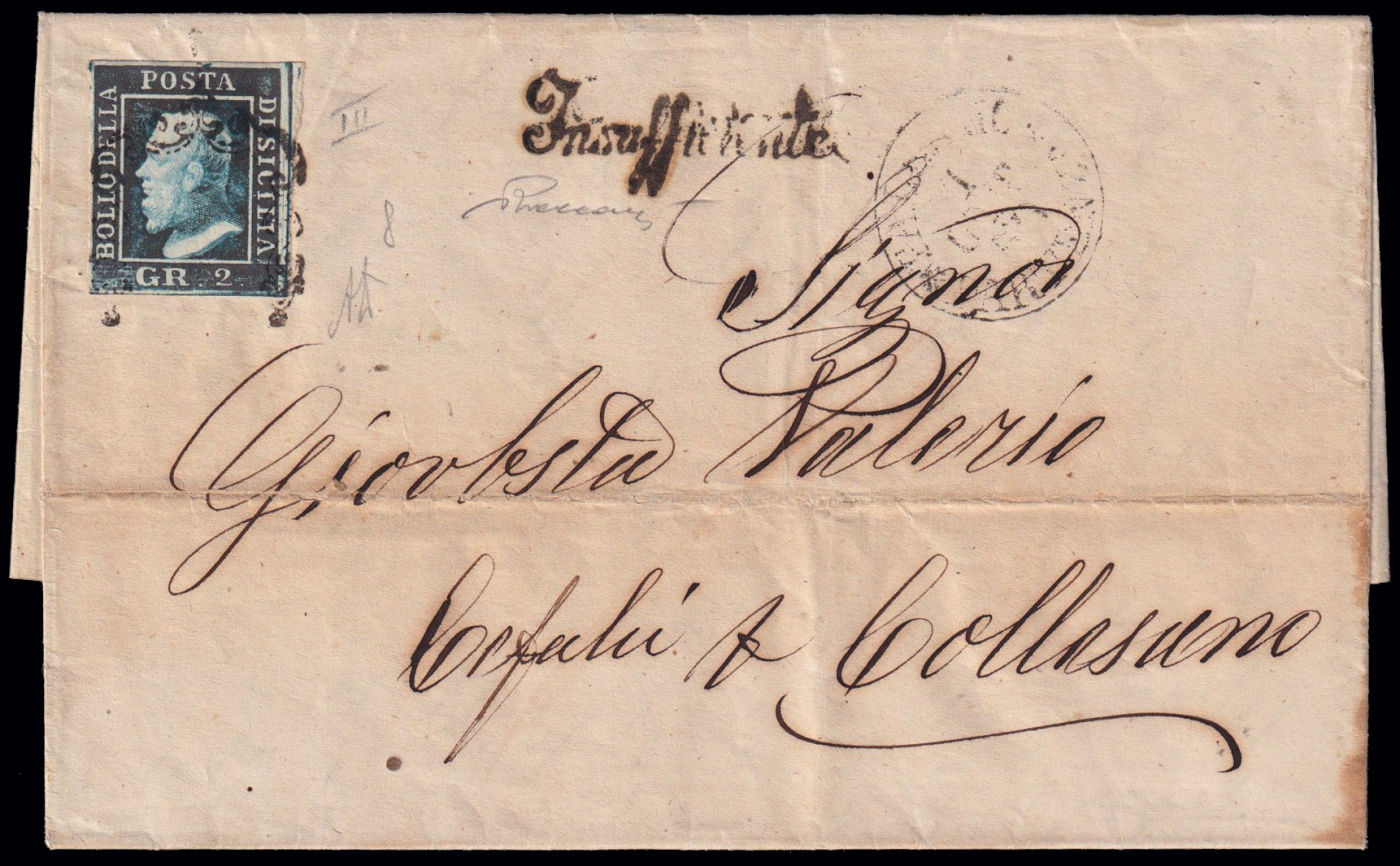 73 L imageINSUFFICIENTE. Lettera affrancata con francobollo da 2 grana color azzurro chiaro carta di Palermo (n.8) spedita da Palermo per Collesano il 1 ottobre 1859. Timbro "INSUFFICIENTE" e firme Vaccari e A.Diena. (Image) (ImageA)