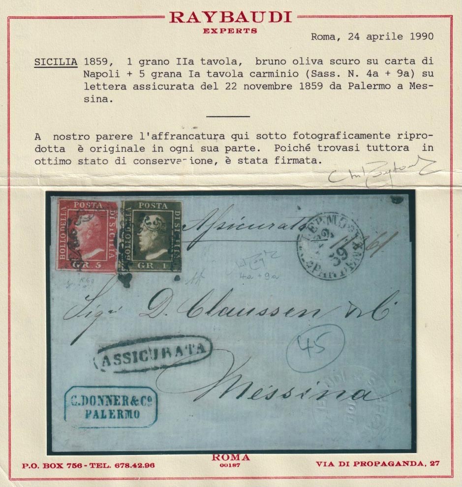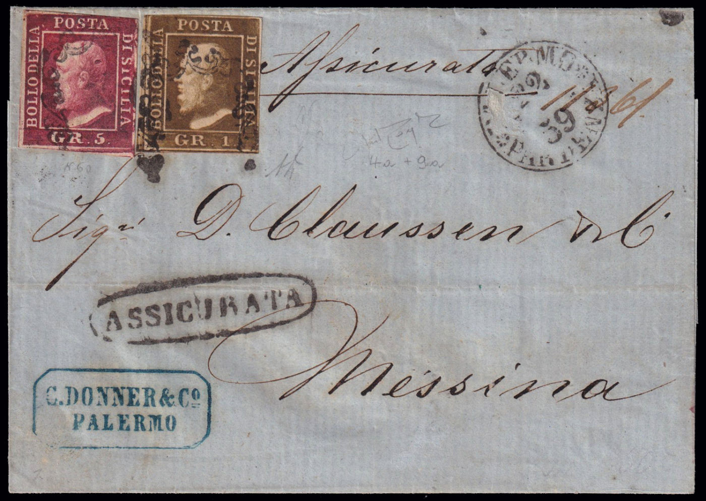 74 L image5 GRANA CARMINIO. Lettera assicurata spedita da Palermo per Messina il 22/11/1859 ed affrancata per 6 grana complessivi con combinazione composta da 1 grano bruno oliva scuro (NA) e un francobollo da 5 grana I tavola (Classici d'Italia SC2A+SC4A; Sassone nn.4a+9a). Timbro di arrivo. Dettagliato certificato Raybaudi e firma di garanzia A.Diena. (Image) (ImageA) (ImageB)