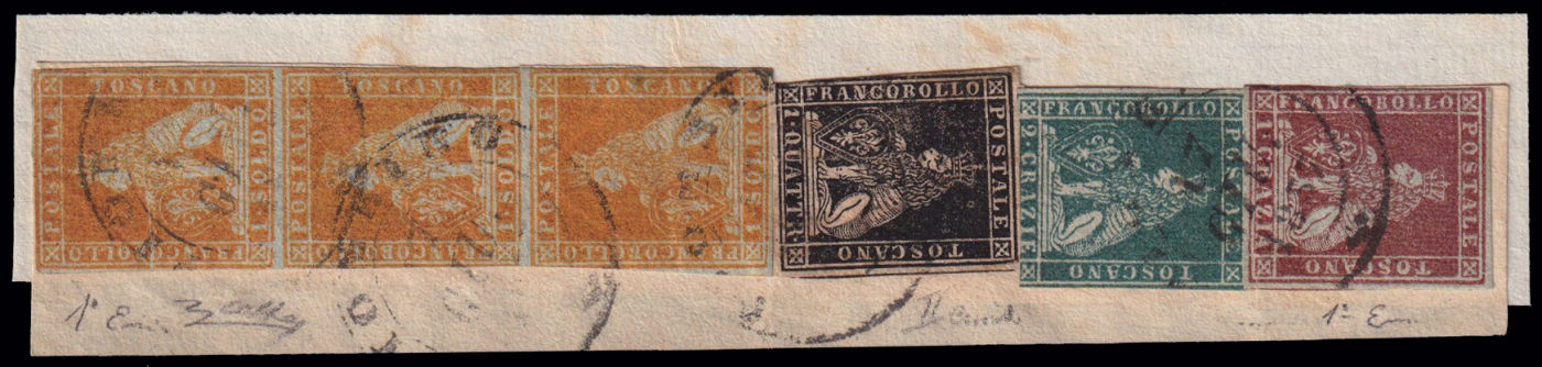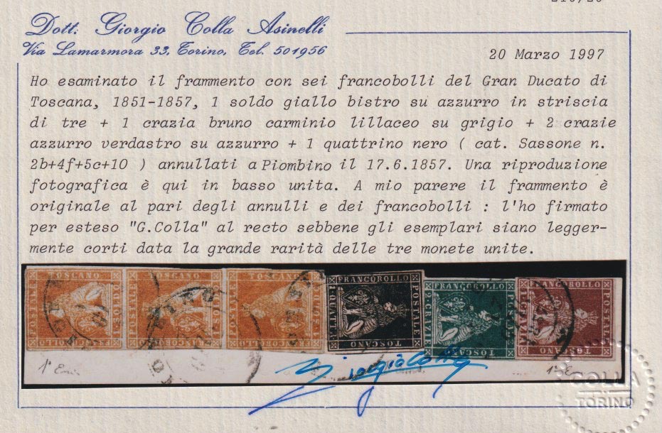 76 F imageSOLDI, QUATTRINI e CRAZIE. Frammento di lettera affrancato con eccezionale combinazione quadricolore mista composta da striscia verticale di 3 francobolli da 1 soldi giallo bistro su azzurro, 1 crazia bruno carminio lillaceo su grigio e francobollo da 2 crazie azzurro verdastro su azzurro della I emissione unitamente a francobollo da 1 q. nero della II emissione (Sassone 2b+4f+5c+10, Classici d'Italia TS2a+TS3+TS5a+TS10), tutti annullati con il timbro di Piombino in data 17/6/1857 (prima settimana d'uso del francobollo da 1q. con filigrana a linee ondulate). Alcuni difetti nelle marginature dei francobolli nulla tolgono alla grande rarità dell'insieme. Dettagliato certificato di garanzia G. Colla (1997) e firma per esteso. (Image) (ImageA)