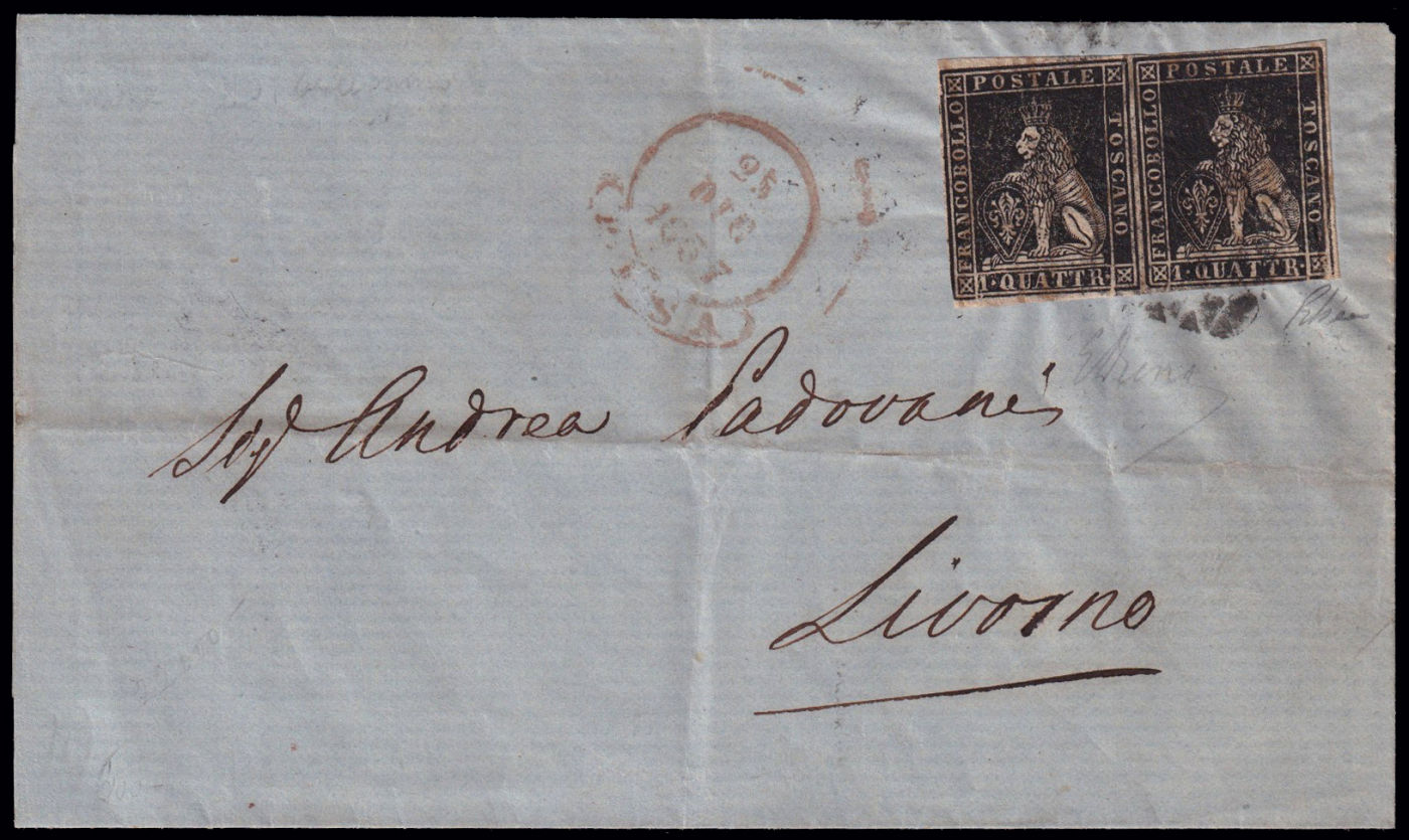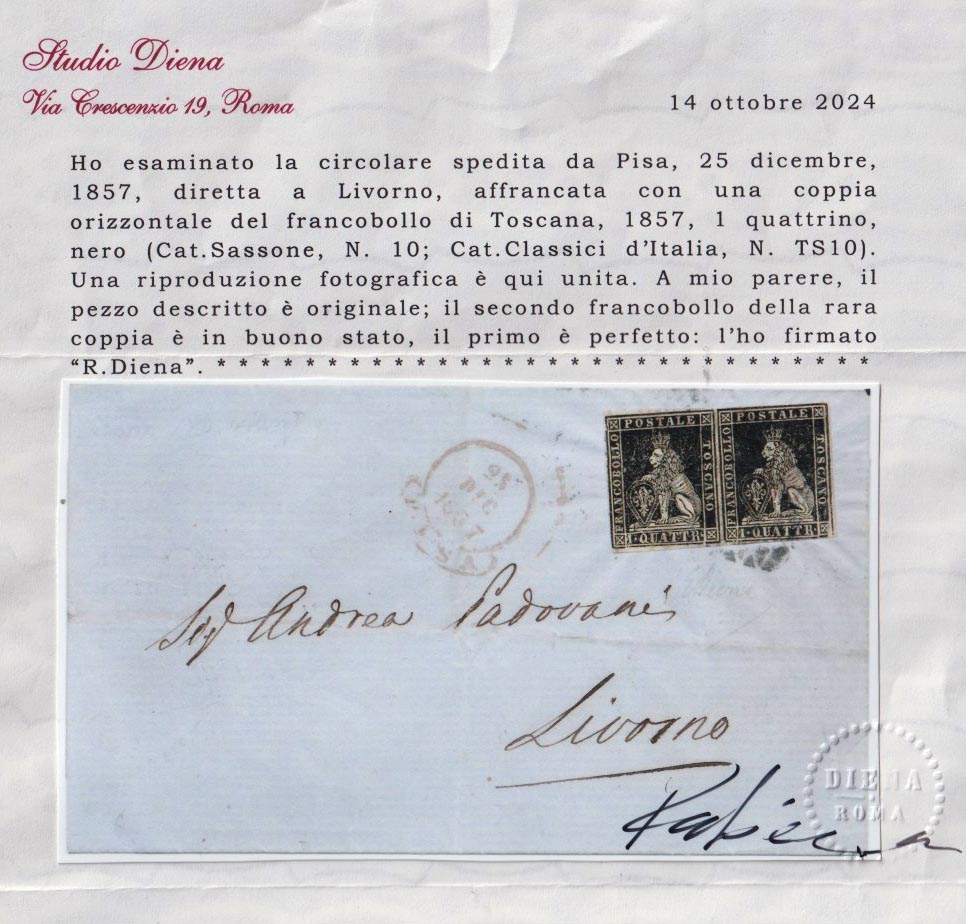 78 L imageII EMISSIONE. Stampato spedito da Pisa per Livorno il 25 dicembre 1857 (Natale) ed affrancata con coppia orizzontale del francobollo da 1 q. nero (Classici d'Italia TS10, Sassone 10), annullati col bollo muto. Timbro di arrivo al retro. Dettagliato certificato Diena e firma di garanzia Em.Diena. Insieme non perfetto ma raro. (Image) (ImageA) (ImageB)