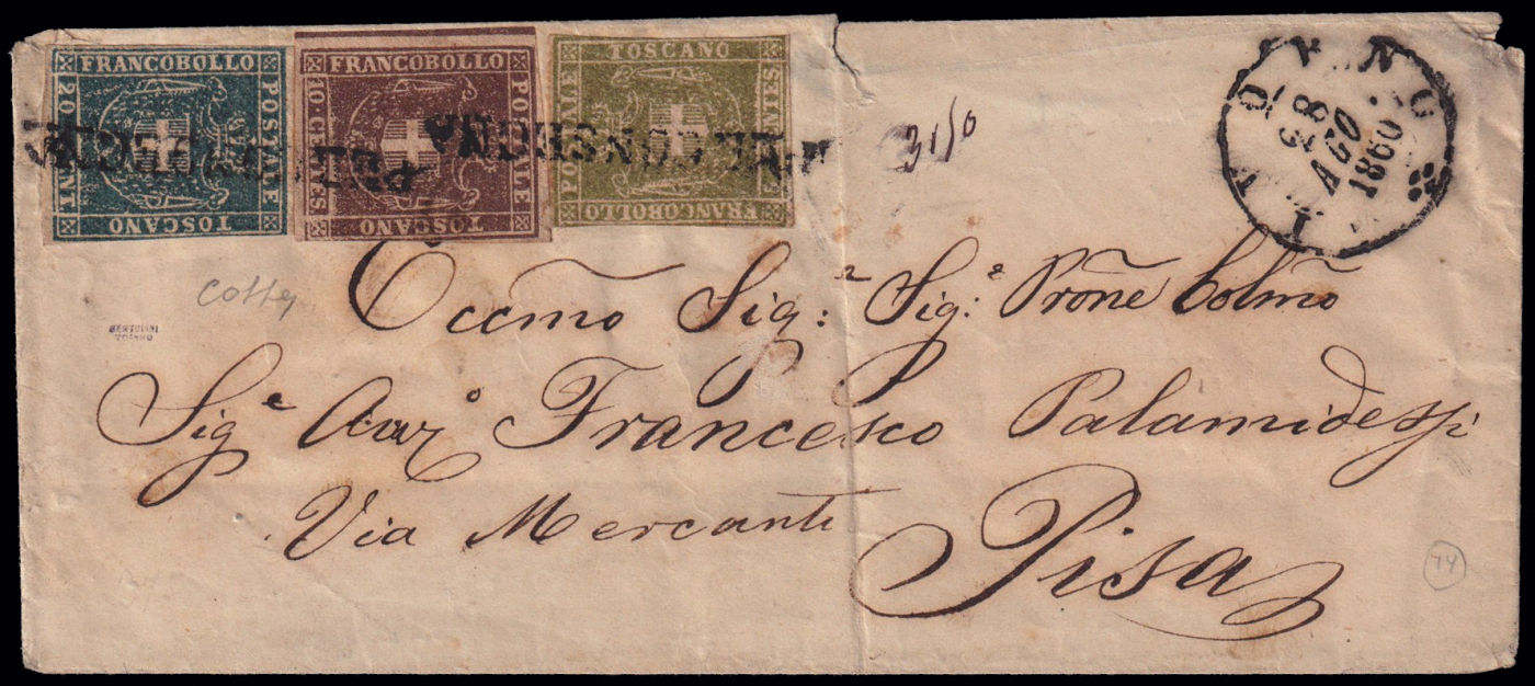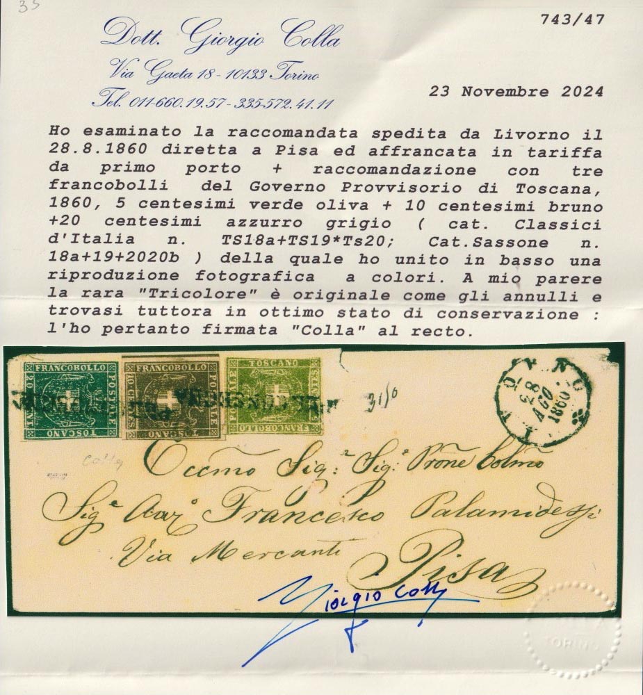 79 L imageGOVERNO PROVVISORIO. Raccomandata spedita da Livorno per Pisa il 28/8/1860 affrancata per 35 centesimi con rara combinazione tricolore composta da un francobollo da 5 centesimi verde oliva, un 20 centesimi azzurro grigio ed un 10 centesimi bruno con "linea di riquadro laterale sinistra" (Classici d'Italia TS18+TS19+TS20, Sassone 18a+19+20b), tutti annullati con il lineare "PER CONSEGNA" (Image) (ImageA) (ImageB)