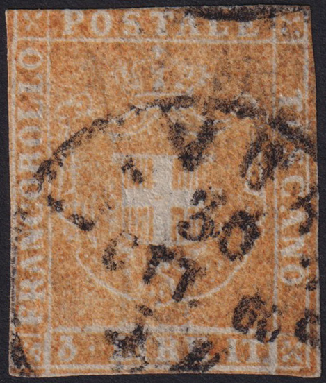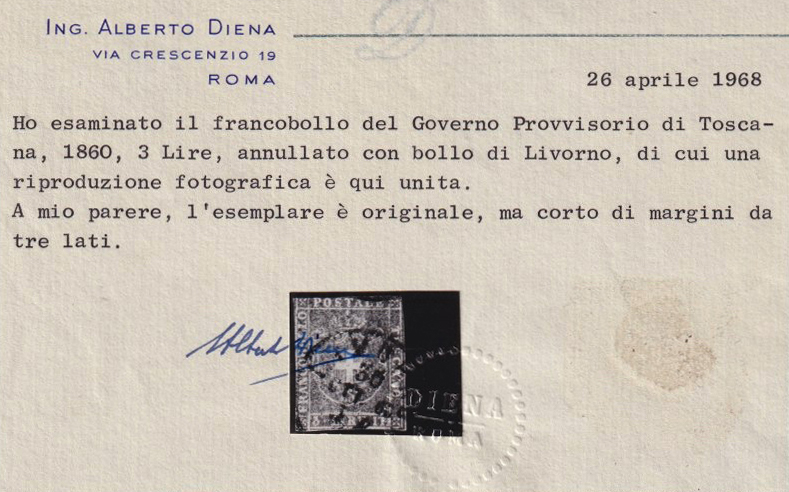 80 U imageGOVERNO PROVVISORIO. Il rarissimo francobollo da 3 lire (Classici d'Italia TS23, Sassone 23), annullato con il timbro di Livorno in data 30/10/1860. Margini regolari ma toccati. Dettagliato certificato "storico" A. Diena (1968). (Image) (ImageA) (ImageB)