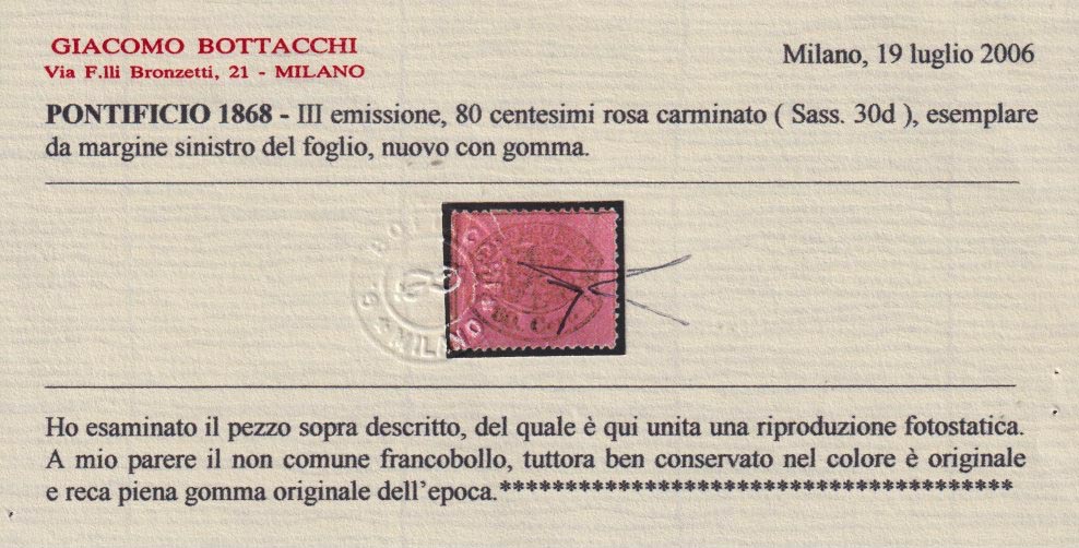 63 Z imageIII EMISSIONE DENTELLATA. Il caratteristico 80 centesimi rosa carminato "fragolone" (Classici d'Italia SP25a, Sassone 30d), nuovo con gomma originale e margine sinistro del foglio. Dettagliato certificato Bottacchi (2006) e Cardillo (2016). (Image) (ImageA) (ImageB) (ImageC)
