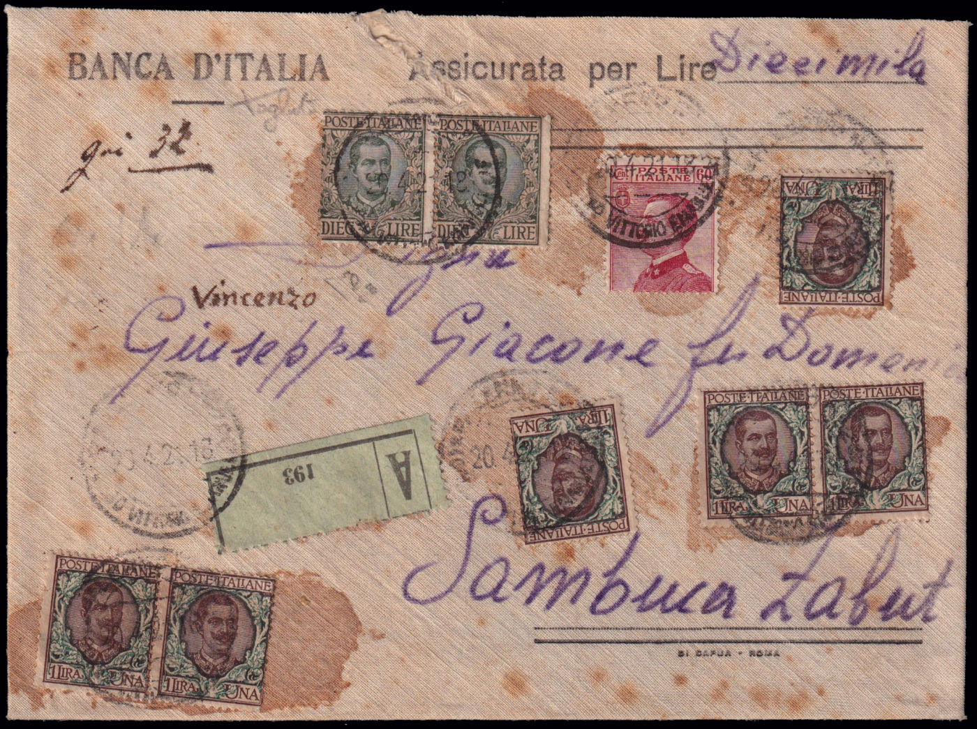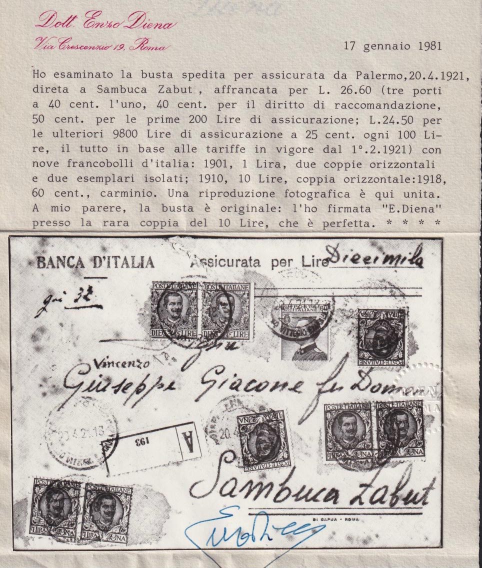 101 L imageFLOREALE ASSICURATA 10.000 LIRE. Busta telata della Banca d'Italia spedita da Palermo per Sambuca Zabut il 20.4.1921 ed affrancata in tariffa per complessive lire 26,60 con combinazione composta da un francobollo Michetti da 60 centesimi, 6 francobolli da 1 lira Floreale e rara coppia orizzontale dell'alto valore da 10 lire. Dettagliato certificato di garanzia E.Diena (1981). Rara nel primo periodo del cambio tariffario del 1° febbraio 1921. (Image) (ImageA) (ImageB)