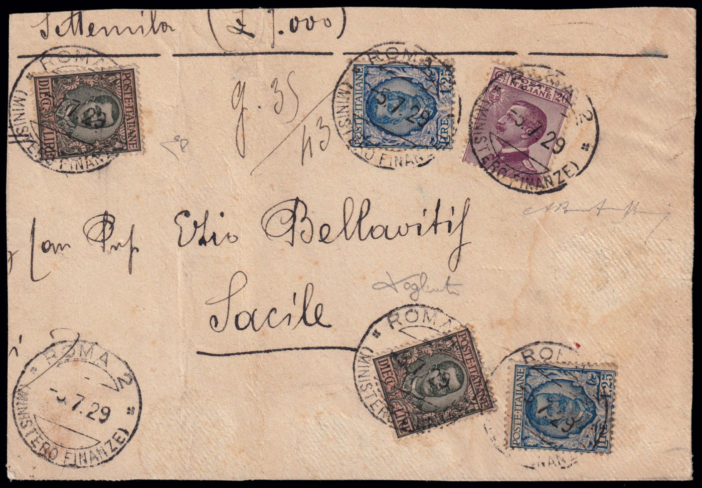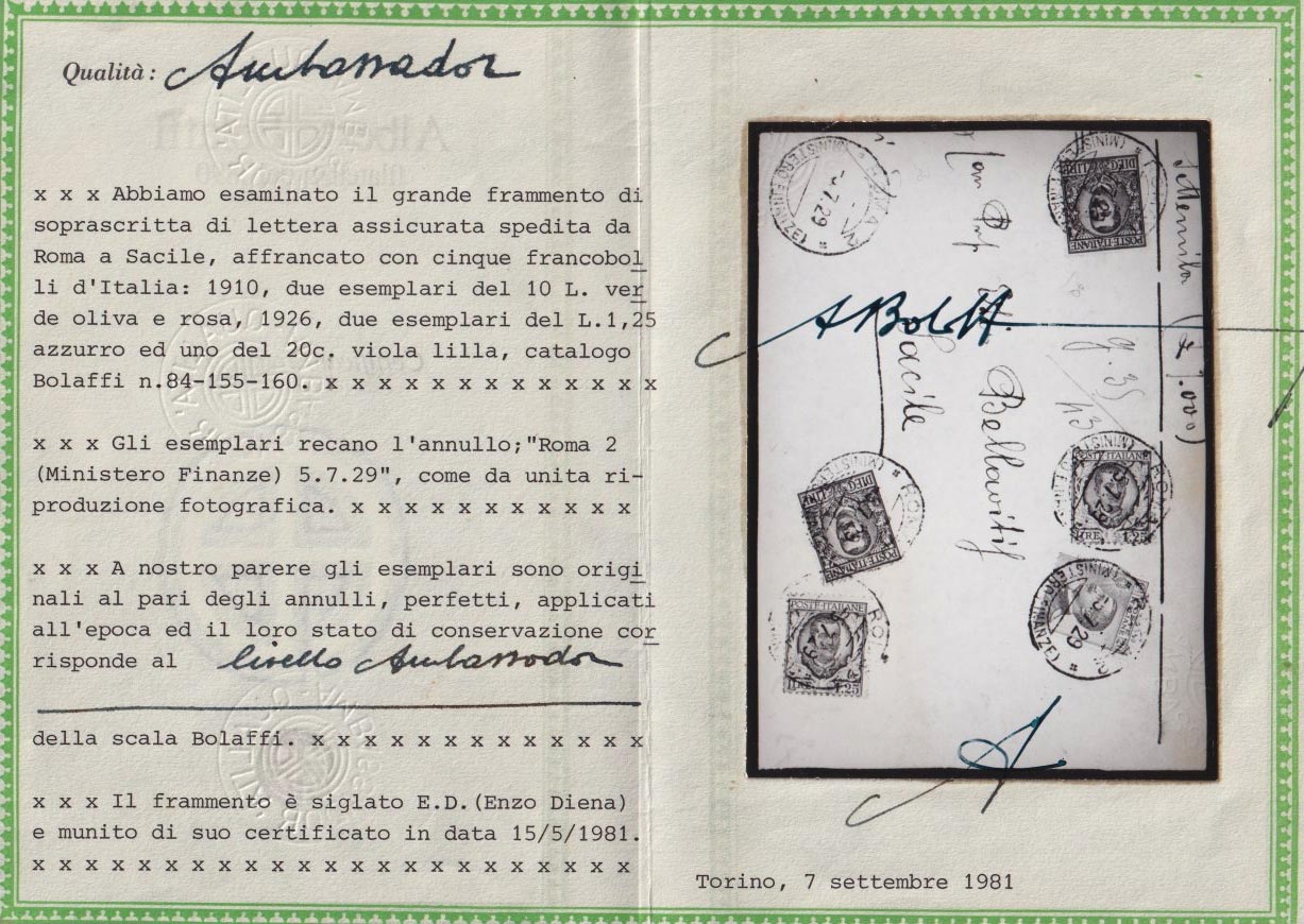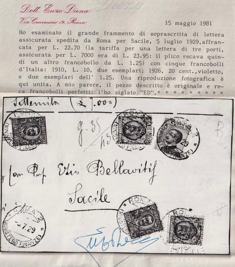 102 F imageFLOREALE ASSICURATA 7.000 LIRE. Frontespizio di pacco assicurato spedito da Roma per Sacile il 5/7/1929 ed affrancato in tariffa 22,70 lire con combinazione tricolore composta da Michetti 20 centesimi, Floreale 1,25 lire (2 esemplari) e due alti valori da 10 lire. Dettagliato certificato "storico" E. Diena (1981) e A. Bolaffi (1981). (Image) (ImageA) (ImageB)