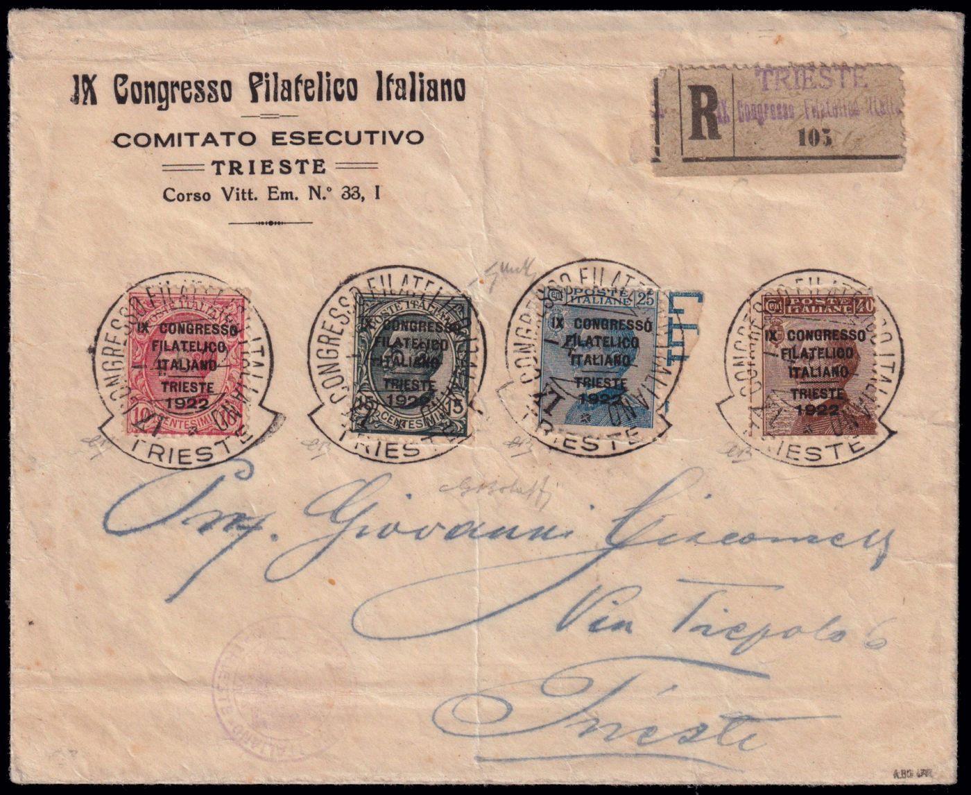 105 L image9° CONGRESSO FILATELICO ITALIANO. Lettera raccomandata spedita nel giorno di emissione della serie di 4 valori soprastampati. Qualche difetto ma insieme raro con firme di garanzia G. Bolaffi. (Image) (ImageA)