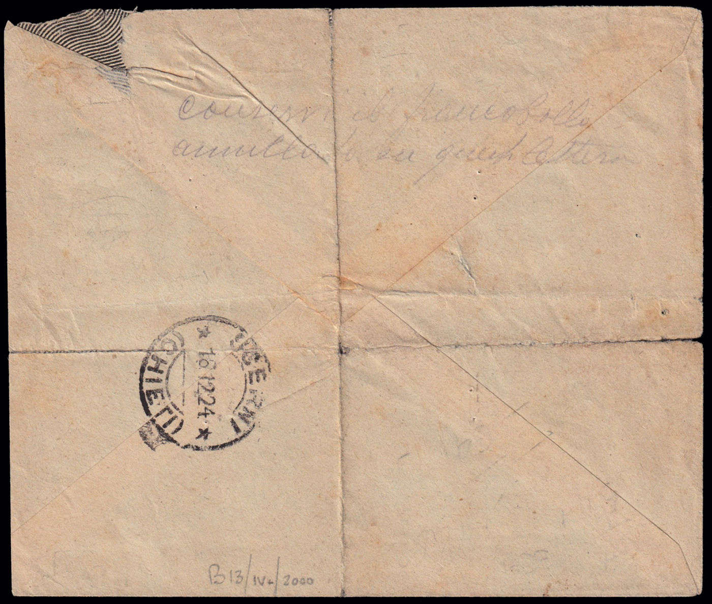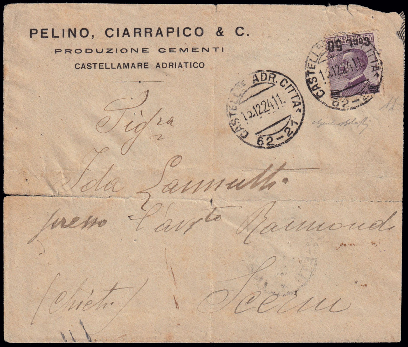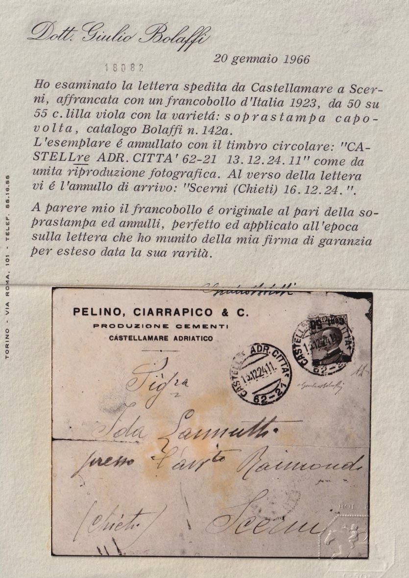 106 L image1923 MICHETTI SOPRASTAMPATI. Lettera spedita da Castellammare Adriatico per Scerni il 13/12/24 ed affrancata con l'unico esemplare noto su busta completa, passato per posta, del francobollo da 50c. su 55c. (Classici d'Italia 271f, Sassone 142a). Timbro di arrivo. Dettagliato certificato "storico" G. Bolaffi (1966). Busta non perfetta ma da annoverare fra le massime rarità della posta ordinaria del Regno di V. Emanuele III e (Image) (ImageA) (ImageB)