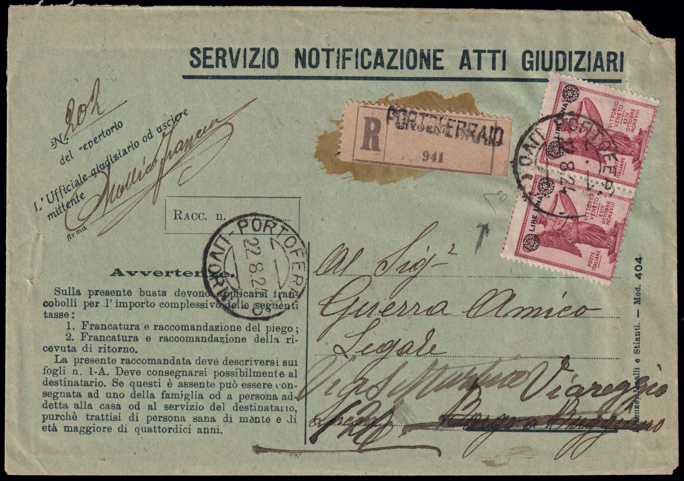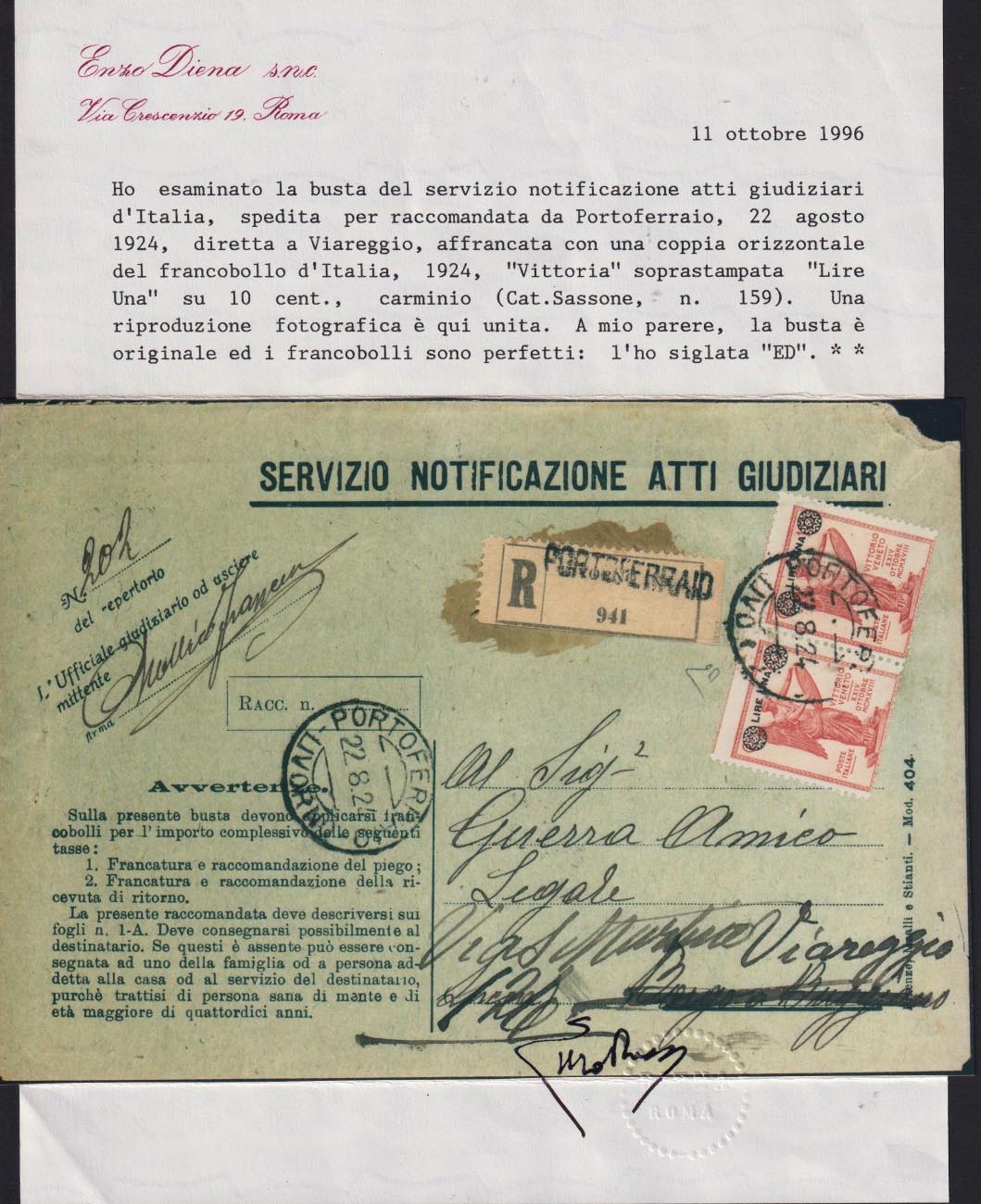 107 L imageVITTORIA SOPRASTAMPATI. Coppia del valore da 1 lira su 10 centesimi carminio (Classici d'Italia 301, Sassone 159) che affranca atti giudiziari raccomandati spediti da Portoferrario per Viareggio il 22/8/1924. Dettagliato certificato Diena. Rari in coppia. (Image) (ImageA) (ImageB)