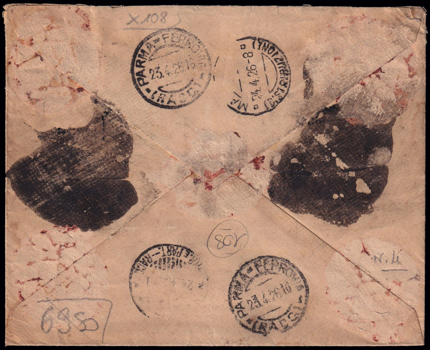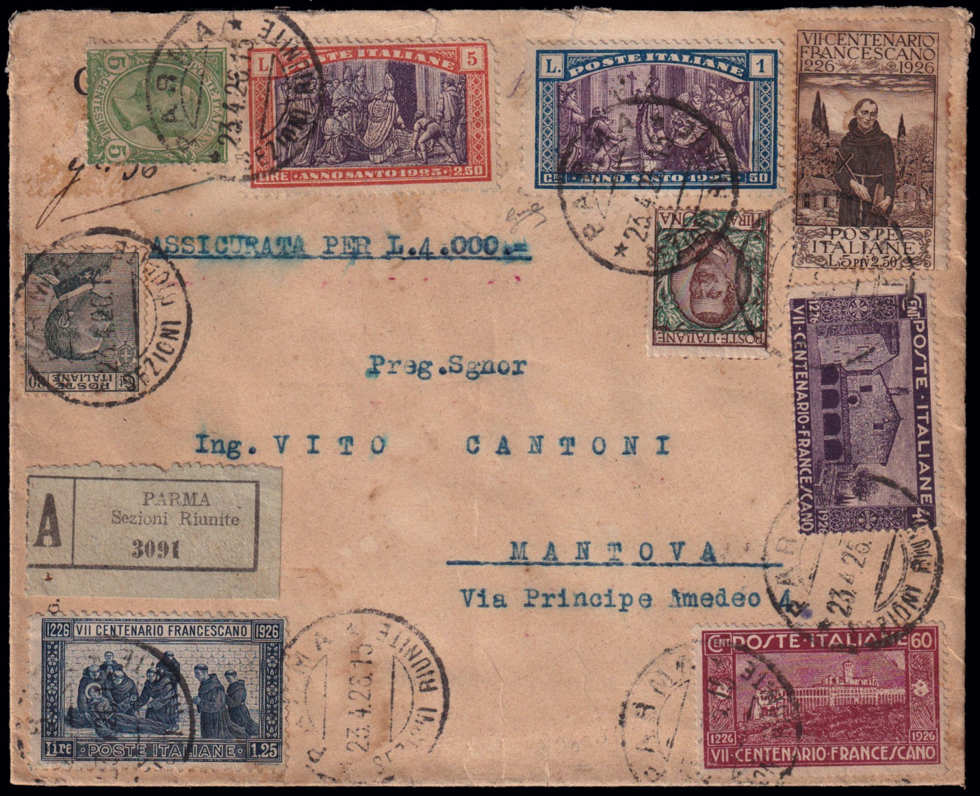 108 L imageASSICURATA ALTI VALORI. Lettera triplo porto assicurata 4.000 lire spedita da Parma per Mantova il 23/4/26 ed affrancata in tariffa esatta 14,60 lire con combinazione pluricolore con i due valori "gemelli" da 5 lire Anno Santo e S.Francesco. Timbri di arrivo e trandito e sigilli. Rara. (Image) (ImageA)