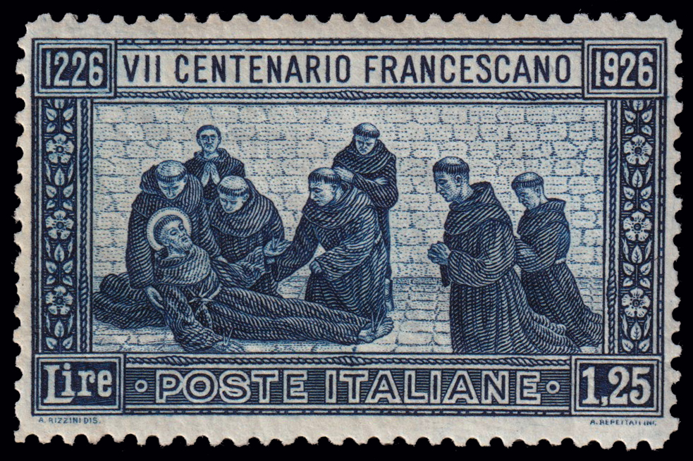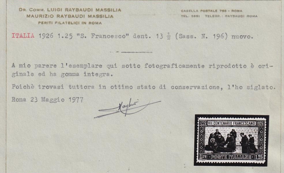 109 G image1926 S. FRANCESCO. Francobollo da 1,25 lire con dentellatura 13 1/2 perfetta su tutti i lati e ottimamente centrato, gomma originale integra. Dettagliato certificato "storico" L. Raybaudi (1977). (Image) (ImageA) (ImageB)