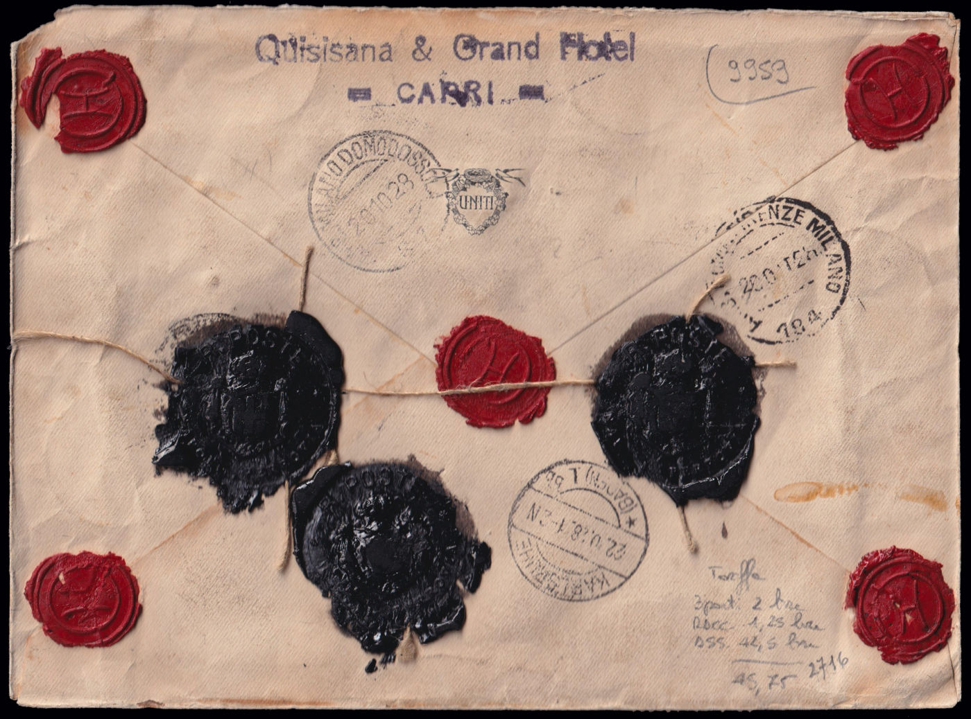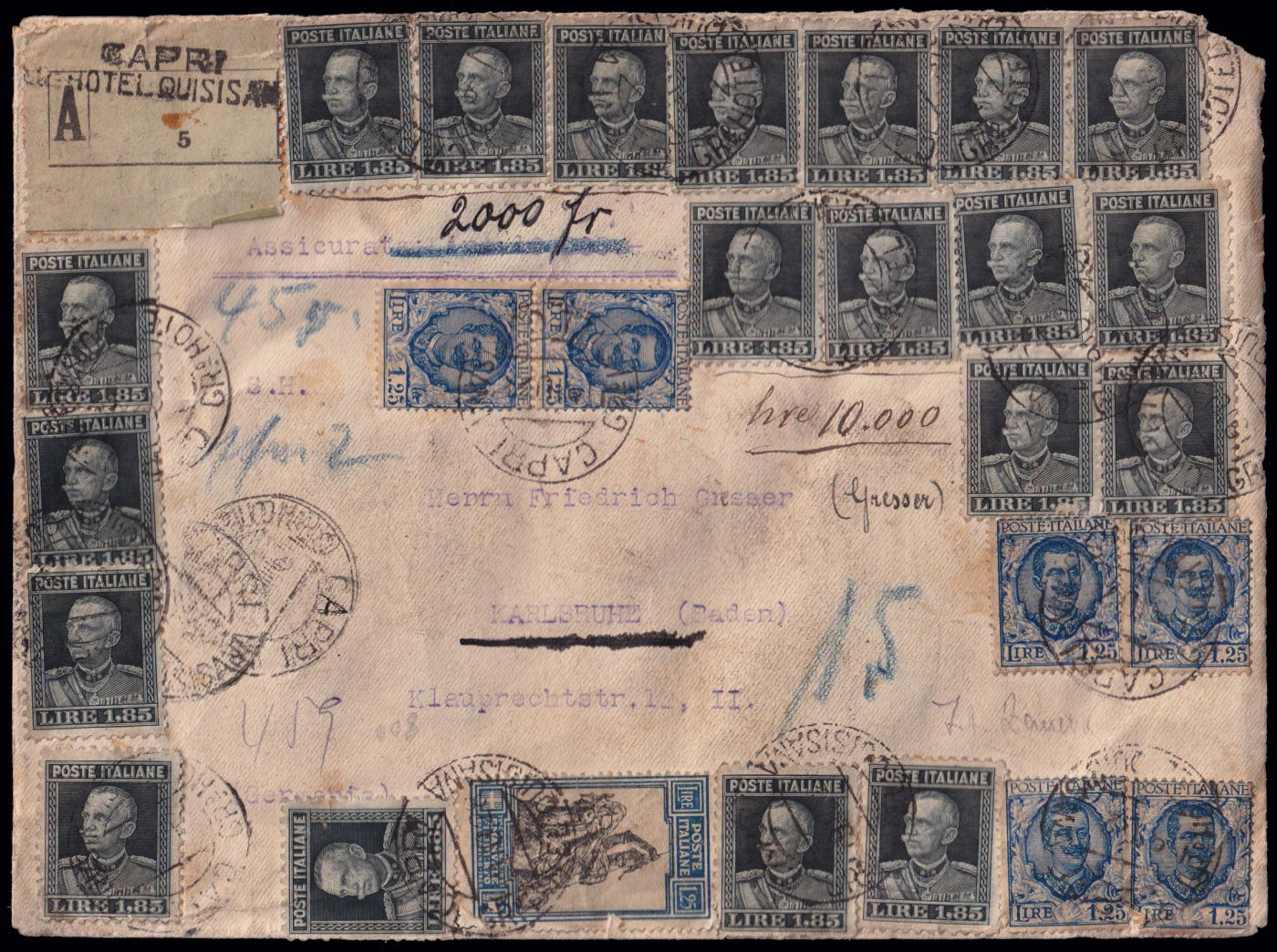 111 L imagePARMEGGIANI - GRANDI AFFRANCATURE. Busta assicurata per lire 10.000 (2.000 franchi) spedita dal Gr. Hotel Quisisana di Capri per Karlsruhe (Baden) il 27/10/1928 affrancata per complessive 45,75 lire. Timbri di transito e arrivo e sigilli di ceralacca. Firma di garanzia F. Zanetti. Alcuni difetti nelle dentellature dei 27 francobolli che compongono la spettacolare affrancatura ma probabile massimo multiplo del francobollo da 1,85 lire Parmeggiani (Classici d'Italia n.379, Sassone 215). (Image) (ImageA)