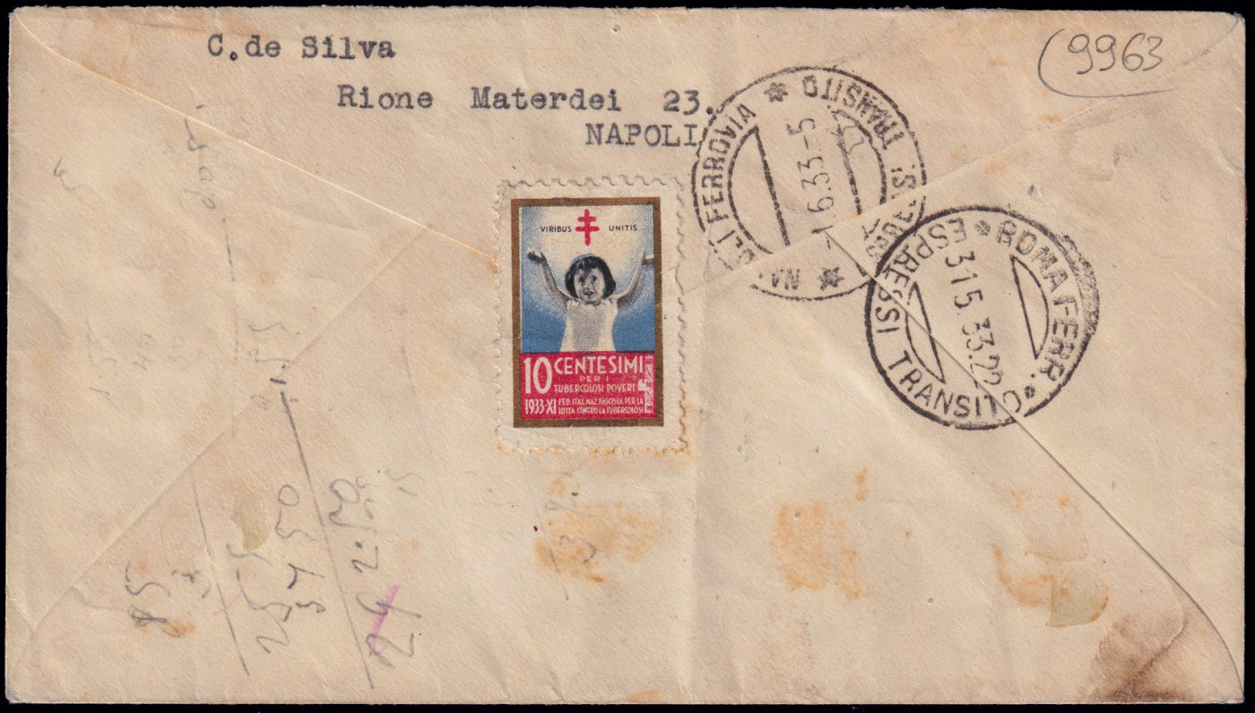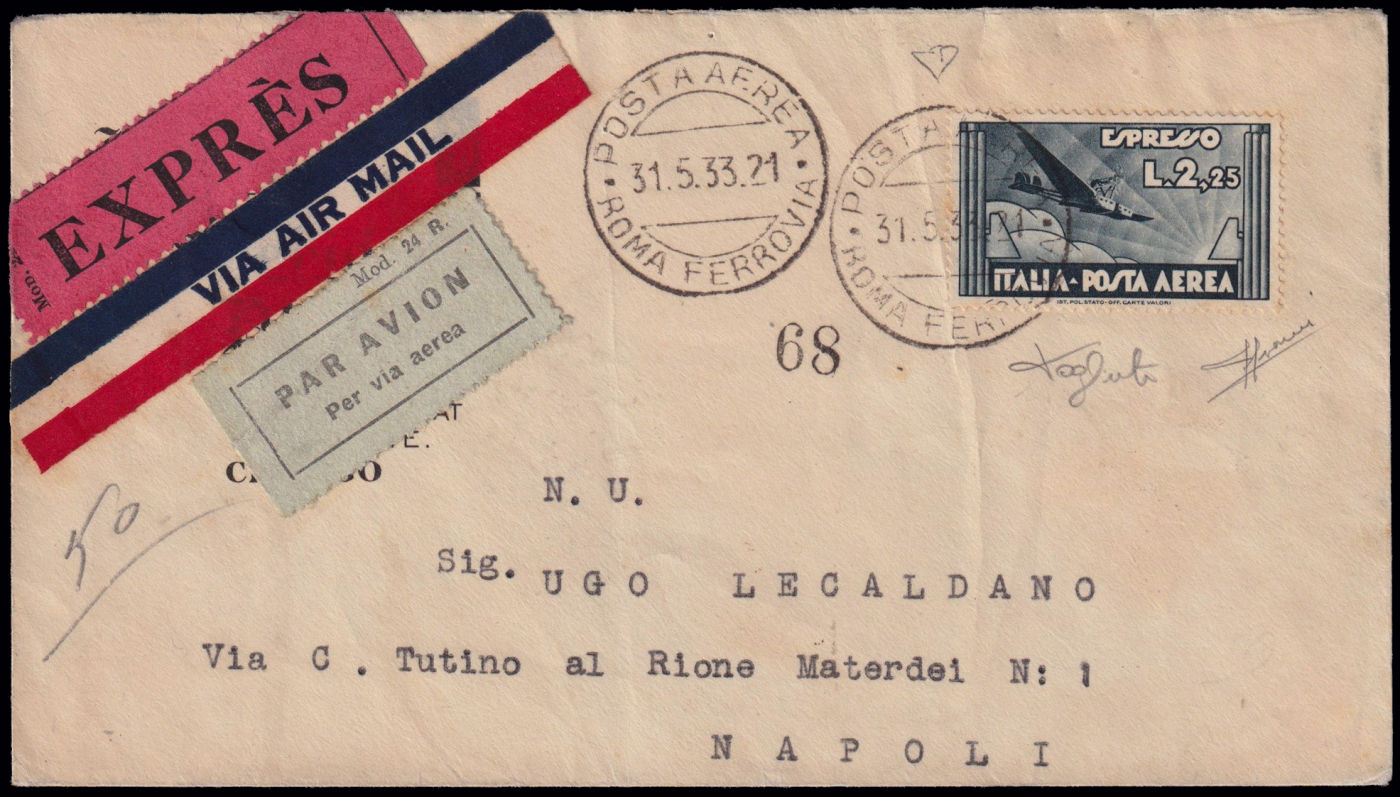 112 L image1932 AEROESPRESSO. Lettera diretta a Napoli affrancata con il francobollo da 2,25 lire (Classici d'Italia 553, Sassone 44) isolato per assolvere alla tariffa primo porto espresso aereo, annullato in data 31/5/33. Timbri di transito e arrivo. Firme di garanzia E. Diena e Sorani. Raro. (Image) (ImageA)