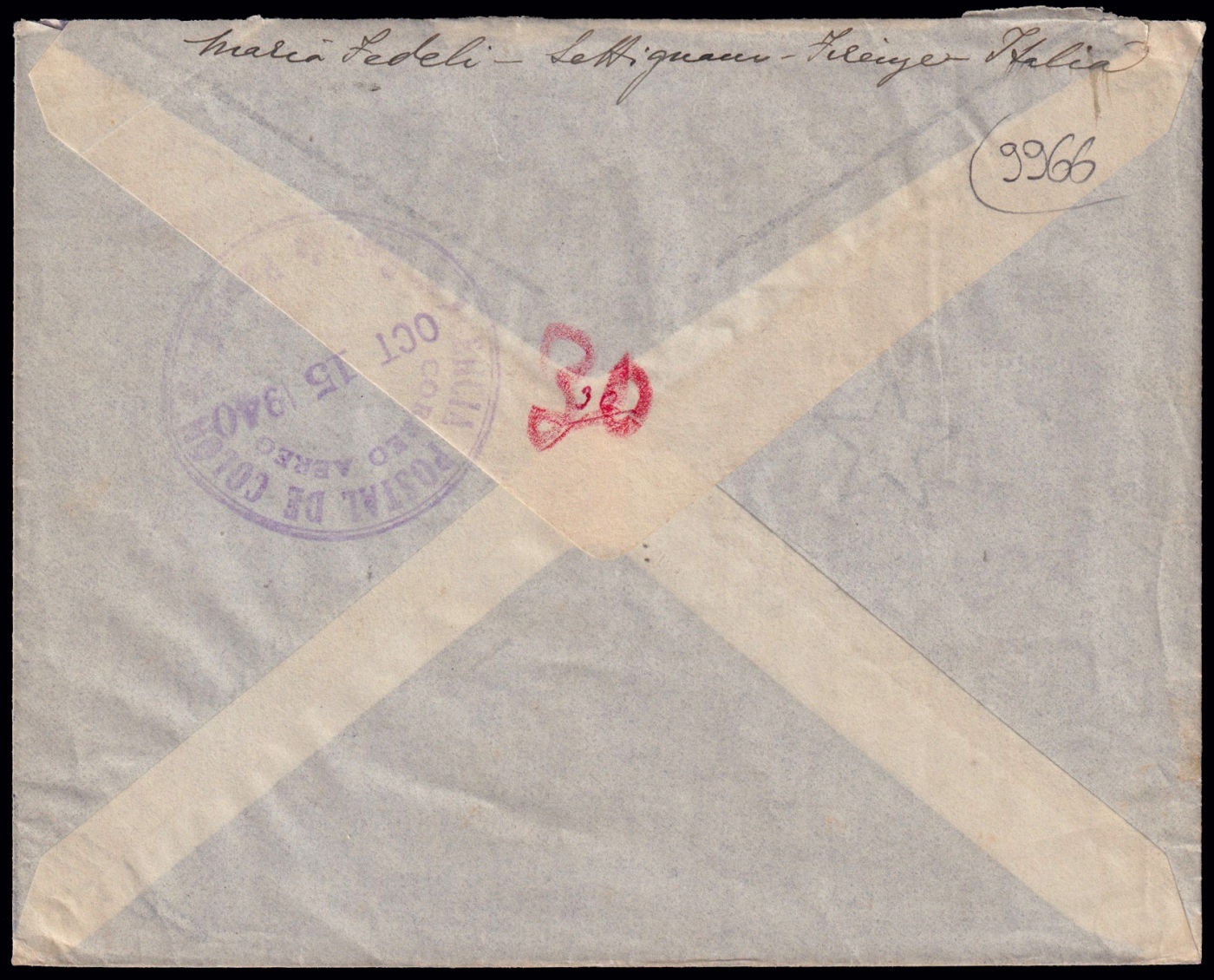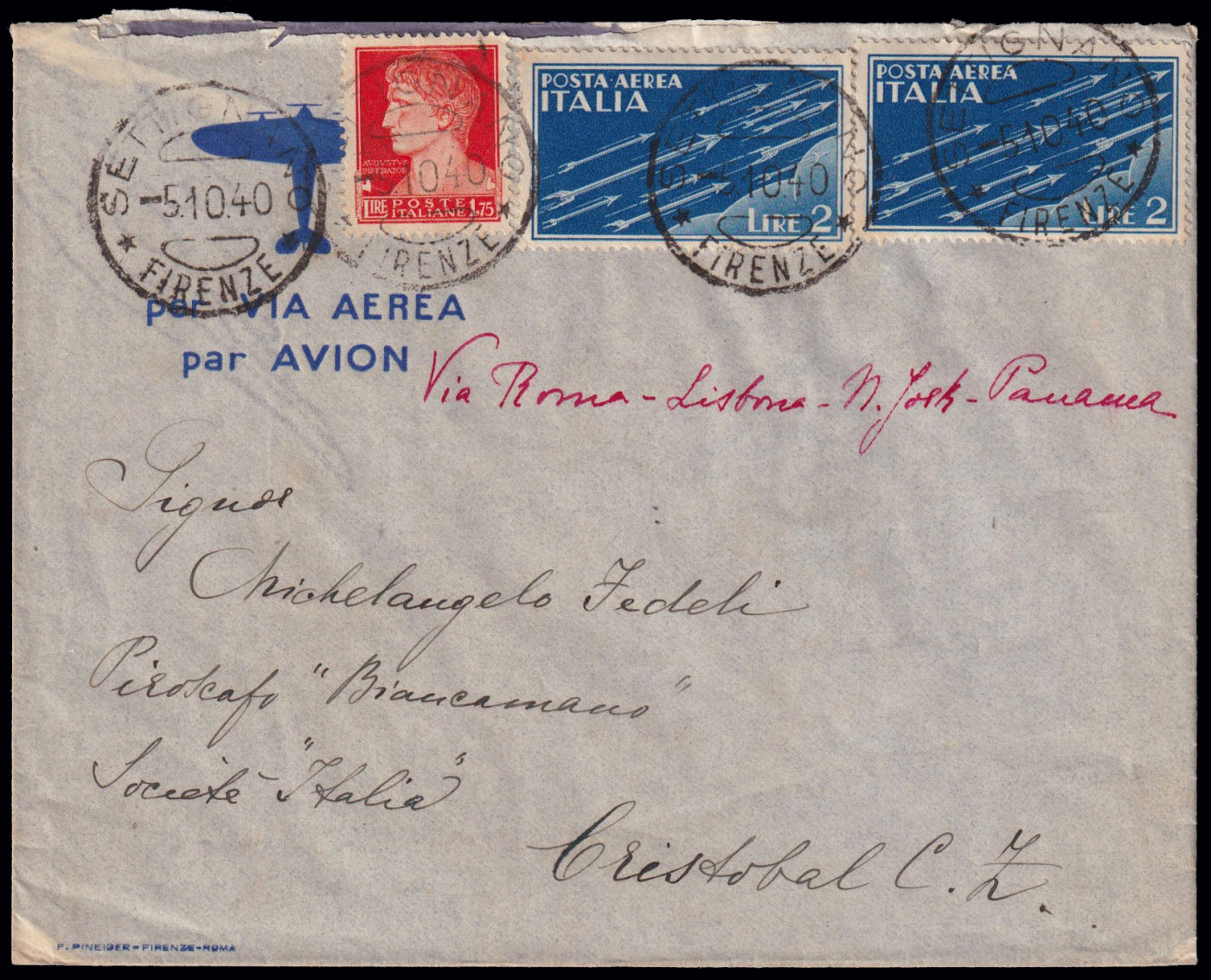 113 L imageVIA AEREA ROMA - LISBONA - NEW YORK - PANAMA. Aerogramma spedito da Roma a Canal Zone affrancato per complessive lire 5,75 ed annullato in data 5/10/40, diretto a marinaio del Piroscafo "Biancamano". Timbro di arrivo al retro. (Image) (ImageA)