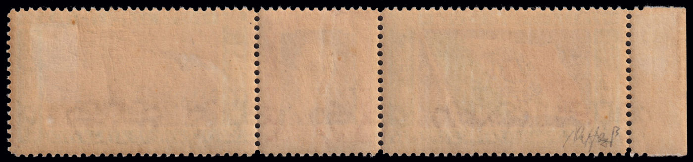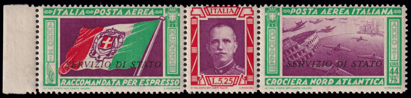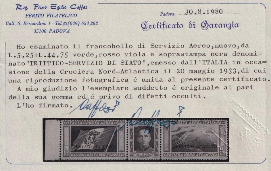 114 Z image1933 CROCIERA NORD - ATLANTICA. Trittico da 50 lire soprastampato SERVIZIO DI STATO (Classici d'Italia 592, Sassone 1), bordo di foglio laterale sinistro. Dettagliato certificato "storico" Caffaz (1980). Brunitura al retro. (Image) (ImageA) (ImageB)