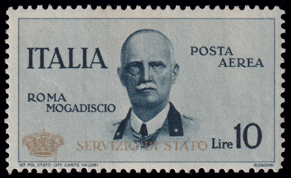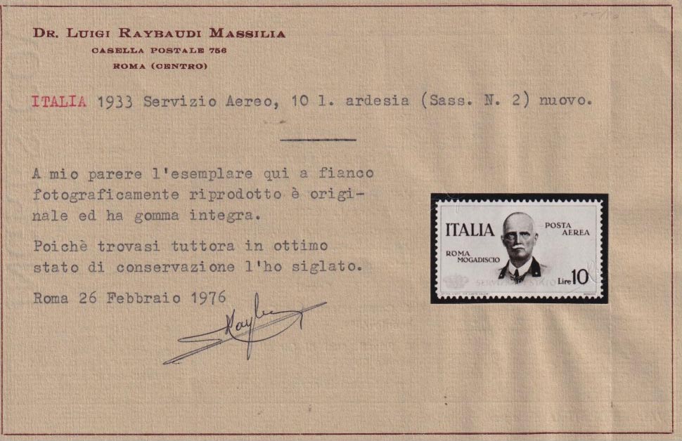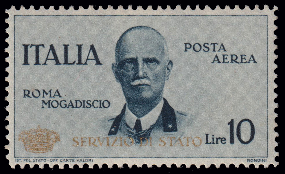 115 G image1934 VOLO ROMA - MOGADISCIO. Francobollo da 10 lire soprastampato SERVIZIO DI STATO e "Coroncina" (Classici d'Italia 681, Sassone 2), perfettamente centrato. Certificato di garanzia "storico" L. Raybaudi (1976). (Image) (ImageA) (ImageB)