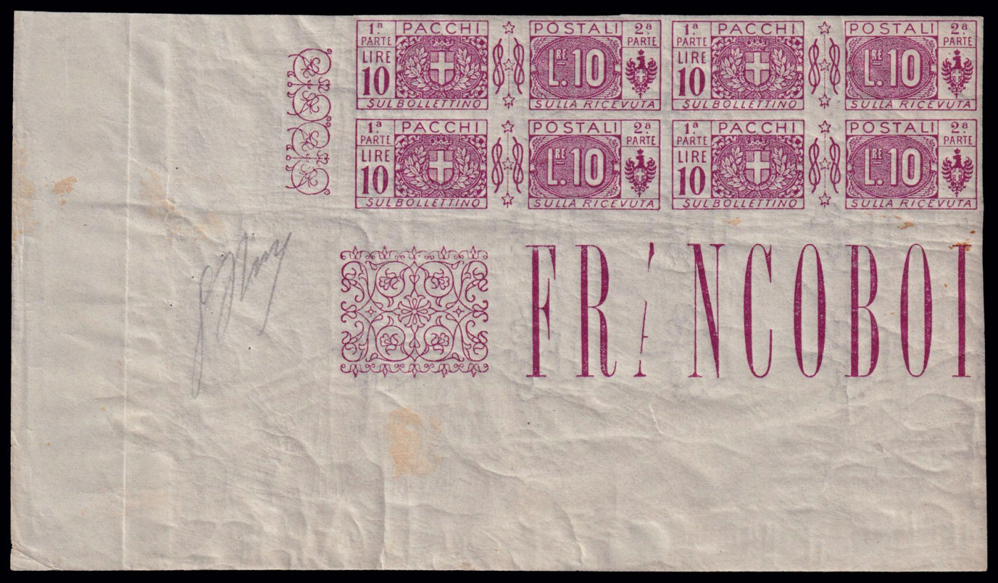 117 G image1914 NODO DI SAVOIA. Quartina angolo di foglio completo del pacco postale da 10 lire lilla NON DENTELLATO (Classici d'Italia P40k, Sassone 16f). Raro con firma di garanzia G. Oliva. (Image) (ImageA)