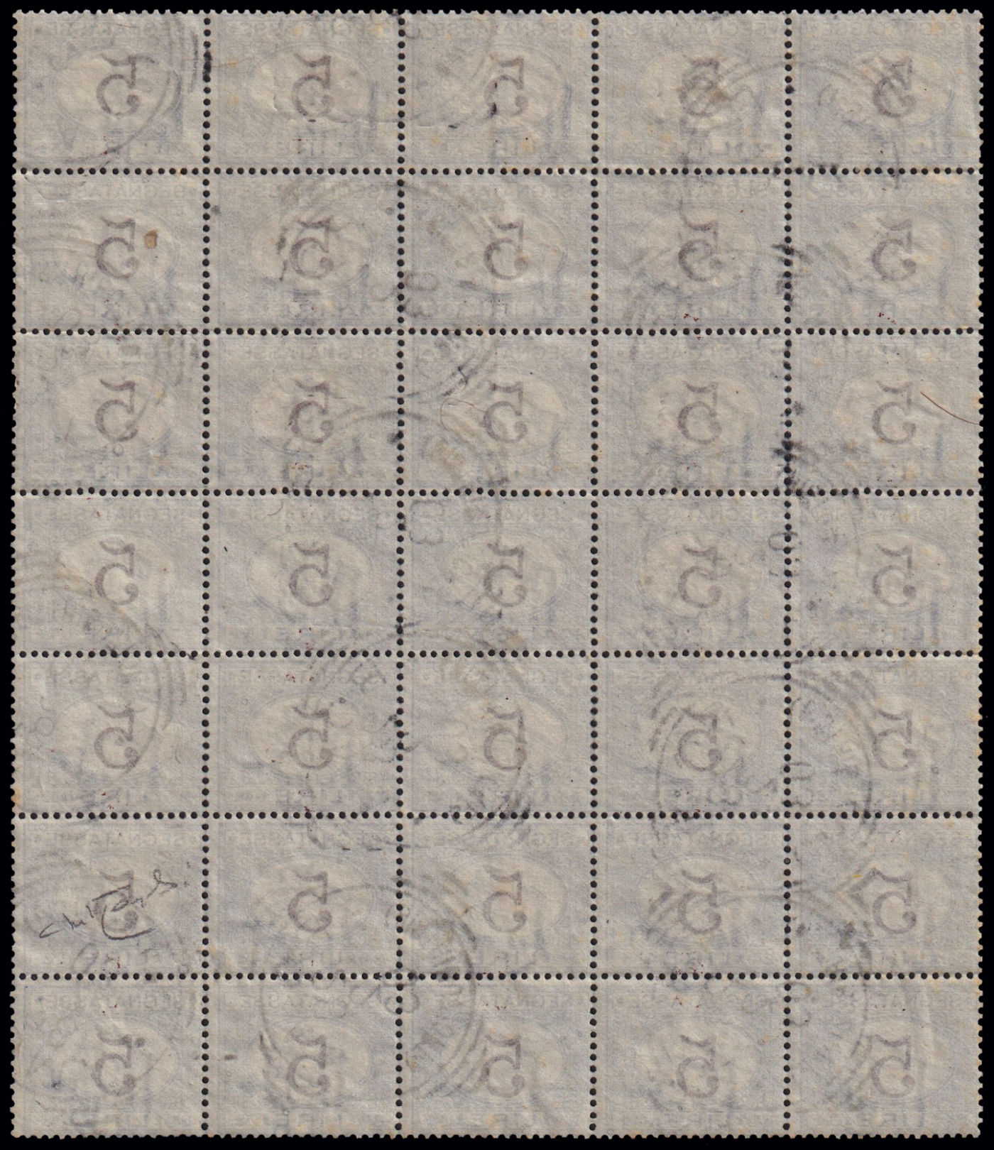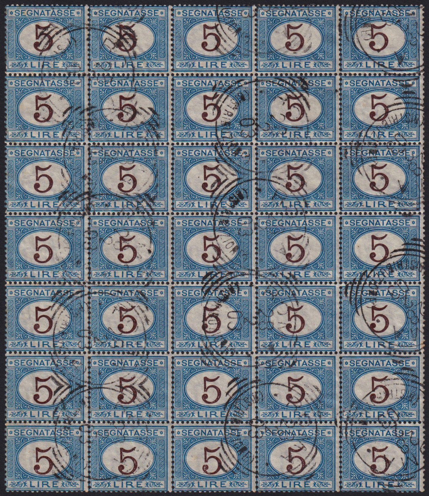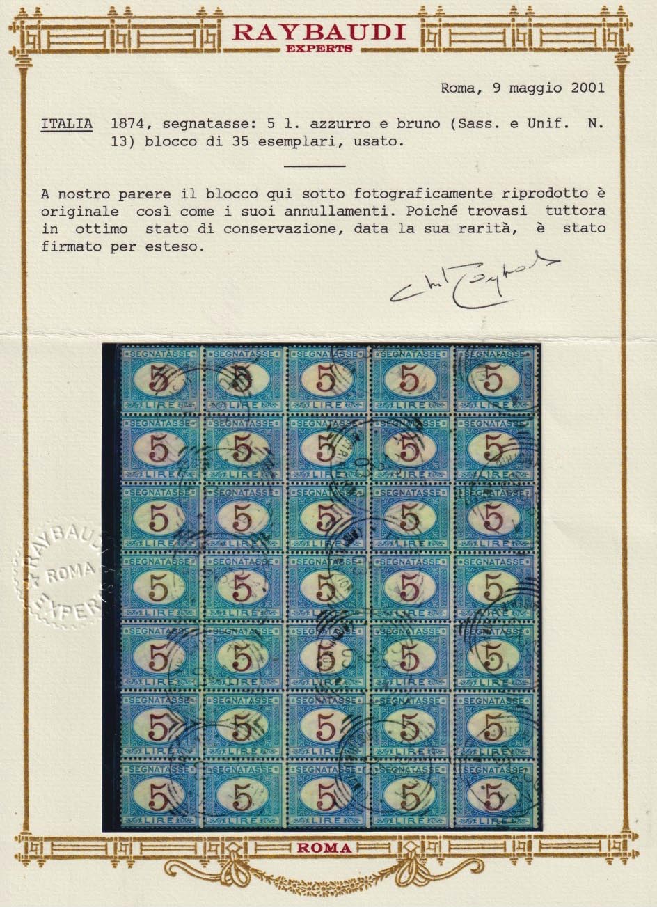 118 U image1874 CIFRA BRUNA - ALTI VALORI. Blocco di 35 esemplari da 5 lire azzurro e bruno, annullati "Roma 28/2/1903". Dettagliato certificato Raybaudi. (Image) (ImageA) (ImageB)