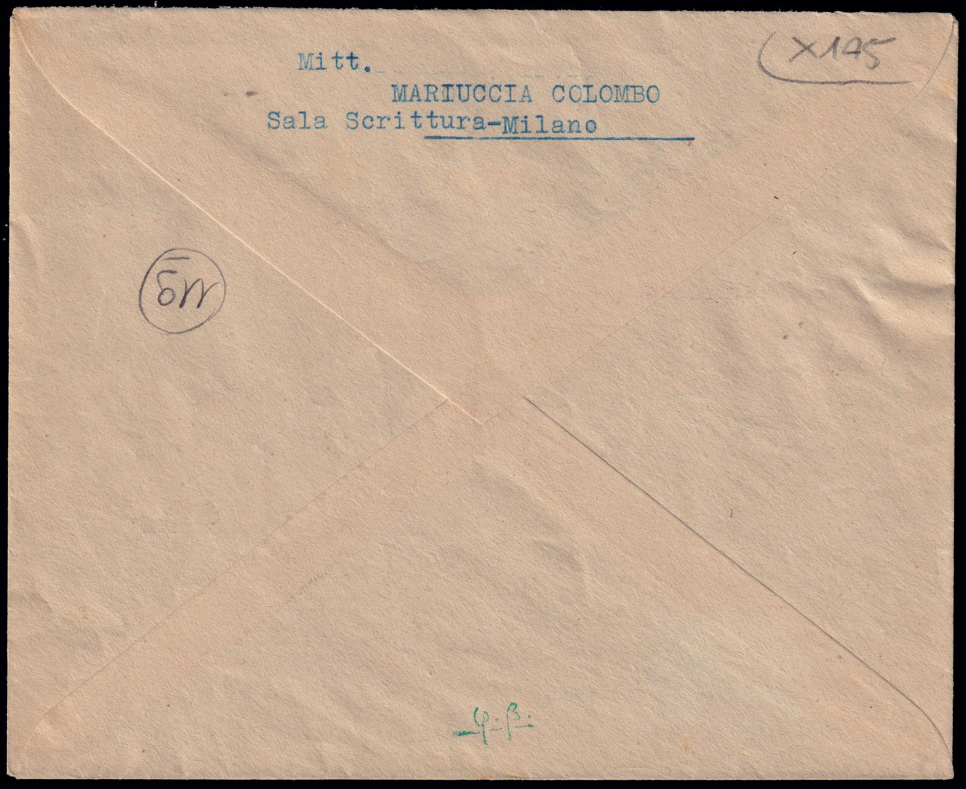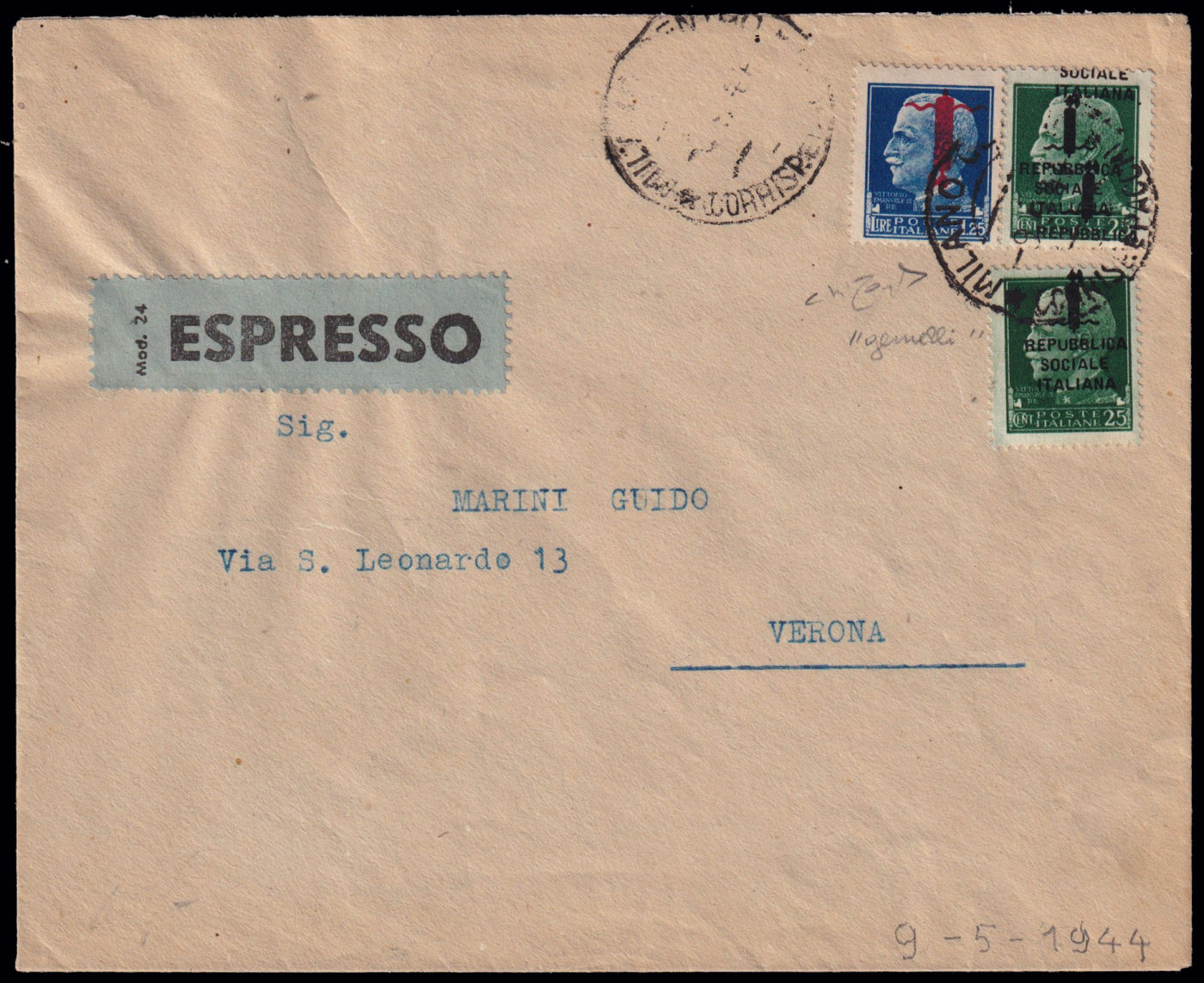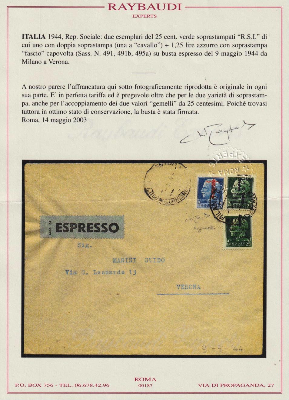 119 L imageSOPRASTAMPA CAPOVOLTA. Lettera espresso spedita da Milano per Verona il 9/5/44 ed affrancata in tariffa con due francobolli "gemelli" da 25 centesimi dei quali uno con DOPPIA SOPRASTAMPA di cui una a "cavallo" della dentellatura orizzontale ed un francobollo da 1,25 lire con SOPRASTAMPA CAPOVOLTA. Dettagliato certificato Raybaudi (2003). (Image) (ImageA) (ImageB)