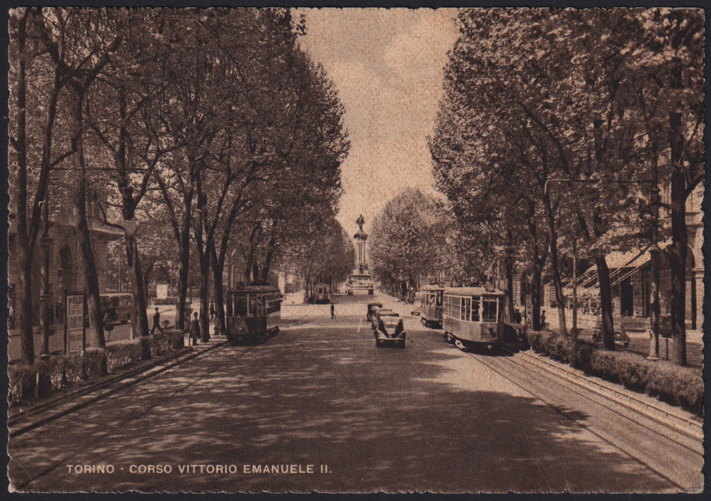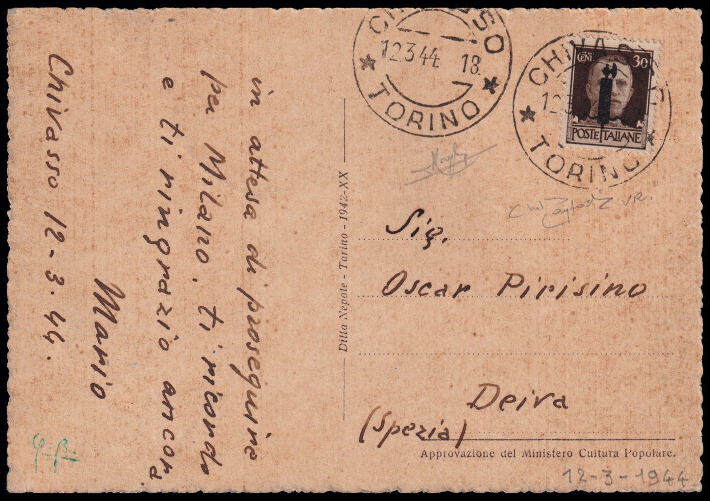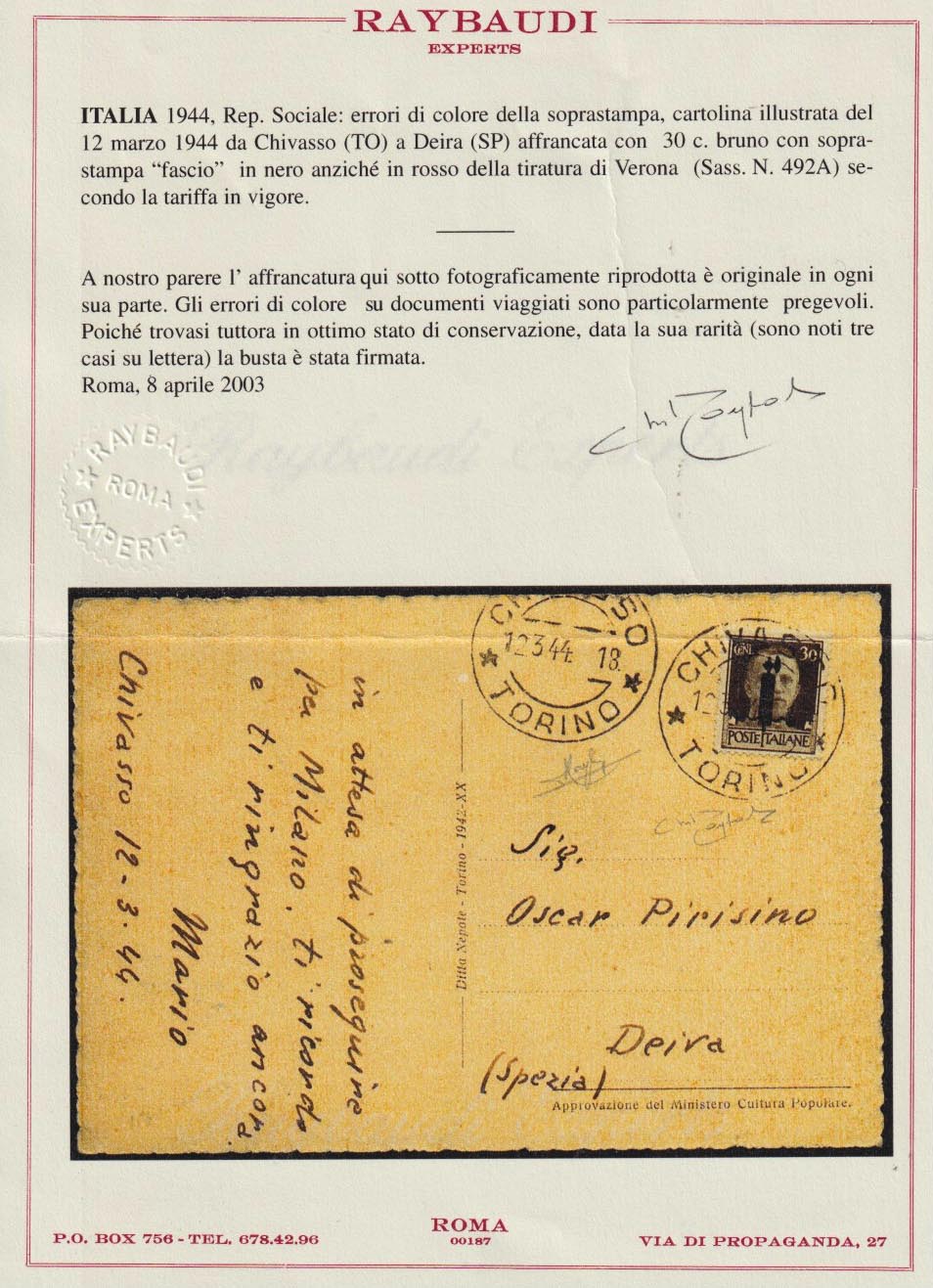 120 L imageERRORE DI COLORE DELLA SOPRASTAMPA. Cartolina con tram e macchine spedita da Chivasso per Deiva il 12/3/44 ed affrancata con un francobollo da 30 centesimi con la rara varietà della tiratura di Verona (Sassone 492A): Dettagliato certificato Raybaudi (2003) e firma di garanzia L. Raybaudi. Noti solamente 3 casi su corrispondenza viaggiata. (Image) (ImageA) (ImageB)