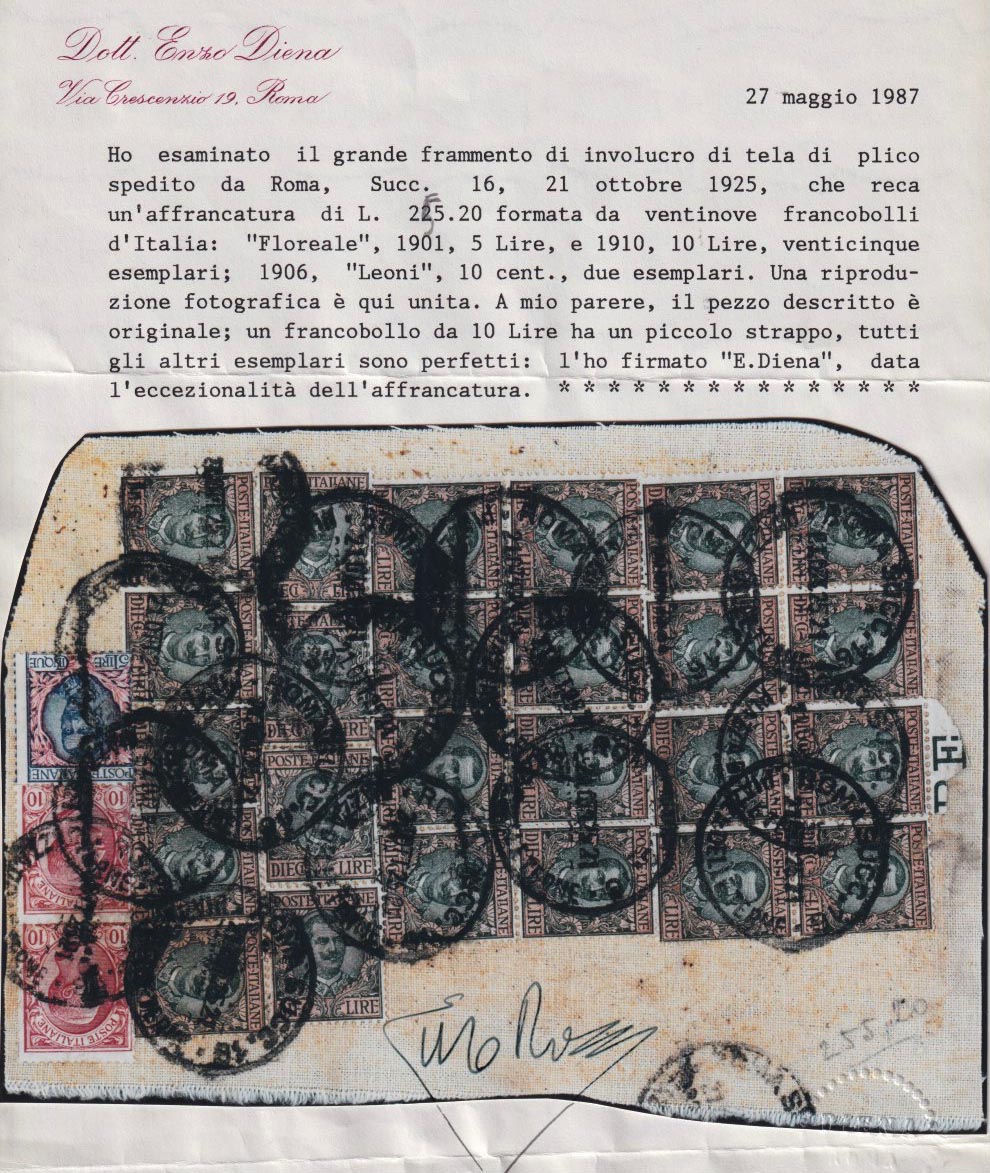 103 F imageFLOREALE ALTI VALORI. Frammento di plico telato affrancato con 31 francobolli da 10 lire e un 5 lire unitamente a coppia da 10 centesimi, tutti annullati "Roma 21 ottobre 1925". Dettagliato certificato E.Diena (1987). (Image) (ImageA)