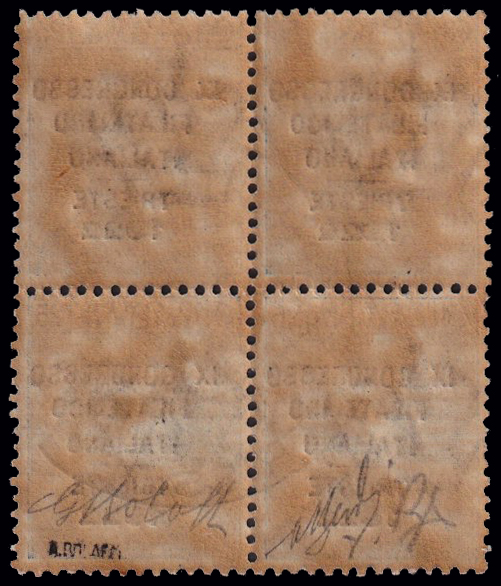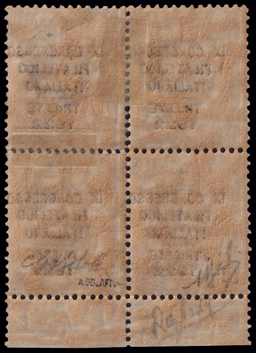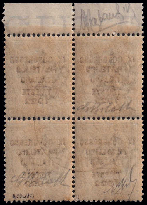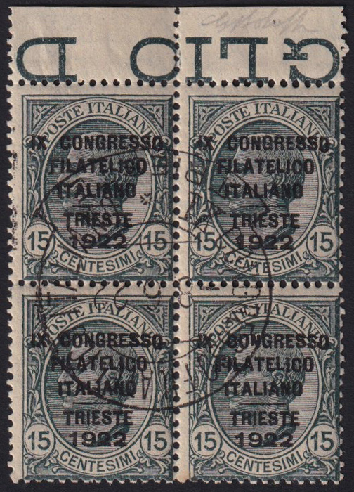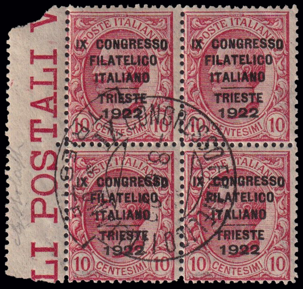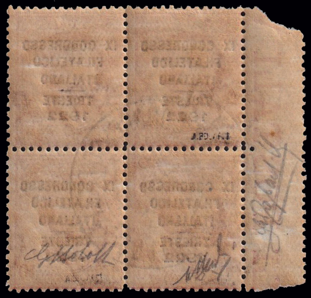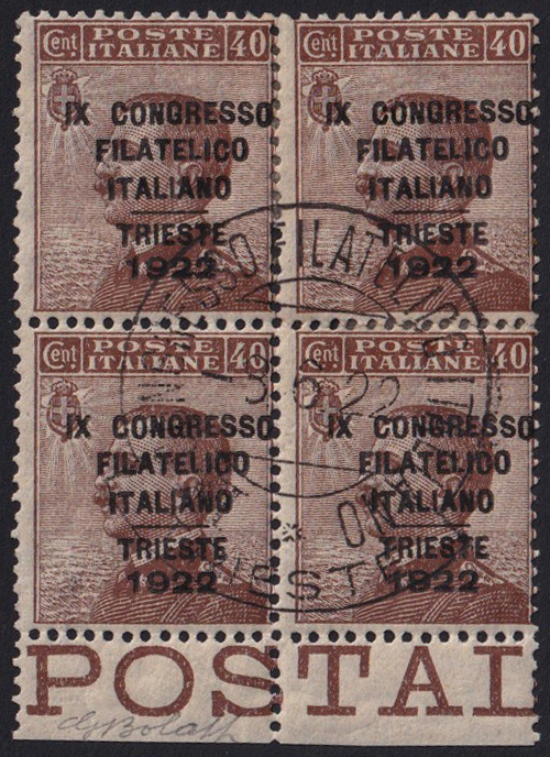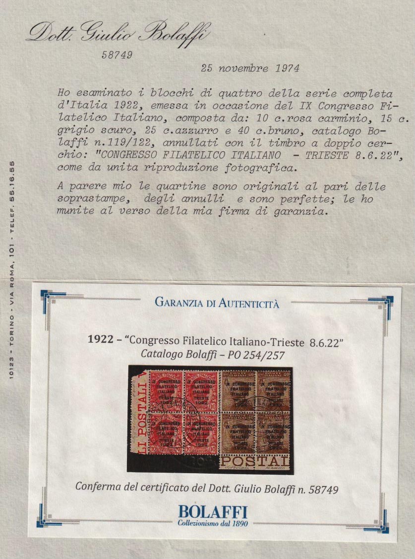 104 U image9° CONGRESSO FILATELICO ITALIANO. La serie di 4 valori soprastampati in quartine con gomma originale ed annullate con il timbro ufficiale della manifestazione in data 8/6/1922 (Classici d'Italia 261/264, Sassone 123/126). Firme di garanzia G. Bolaffi e certificato di garanzia. (Image) (ImageA) (ImageB) (ImageC) (ImageD) (ImageE) (ImageF) (ImageG) (ImageH)