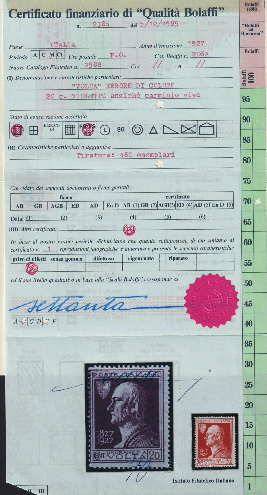 110 G image1927 VOLTA VIOLETTO. Esemplare da 20 centesimi allestito per le Colonie e non soprastampato (Classici d'Italia 374g, Sassone 210A), certificato finanziario Bolaffi (70%). Cartoncino di vendita Bolaffi anche con l'esemplare carminio vivo (1985). Raro, stampato in soli 480 esemplari (8 fogli da 60 francobolli). (Image) (ImageA) (ImageB) (ImageC) (ImageD)