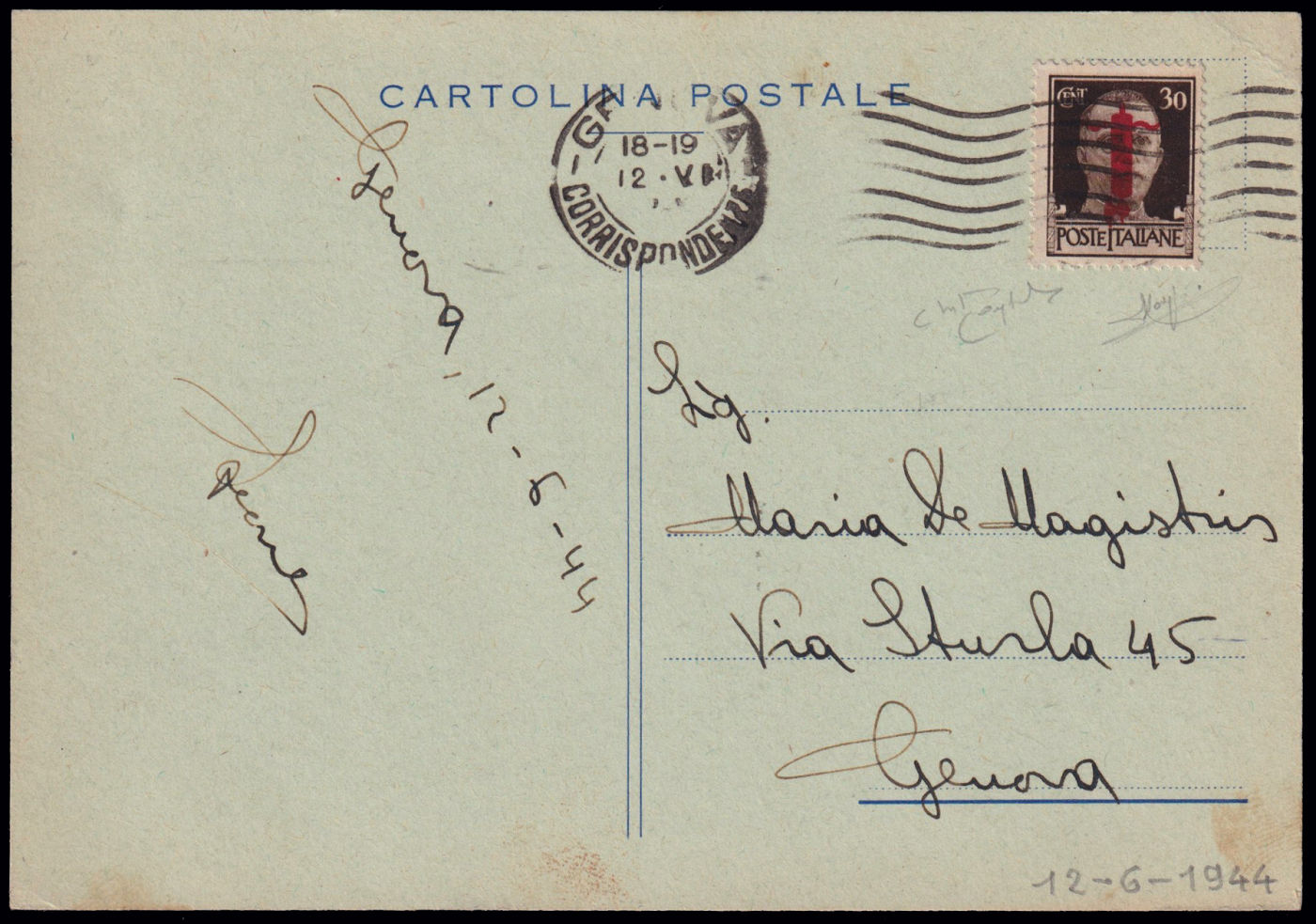 121 L imageSOPRASTAMPA CAPOVOLTA. Cartolina postale spedita da Genova per città il 12/6/44 affrancata con un francobollo da 30 centesimi con soprastampa capovolta. Firme di garanzia L. Raybaudi e M. Raybaudi. (Image) (ImageA)