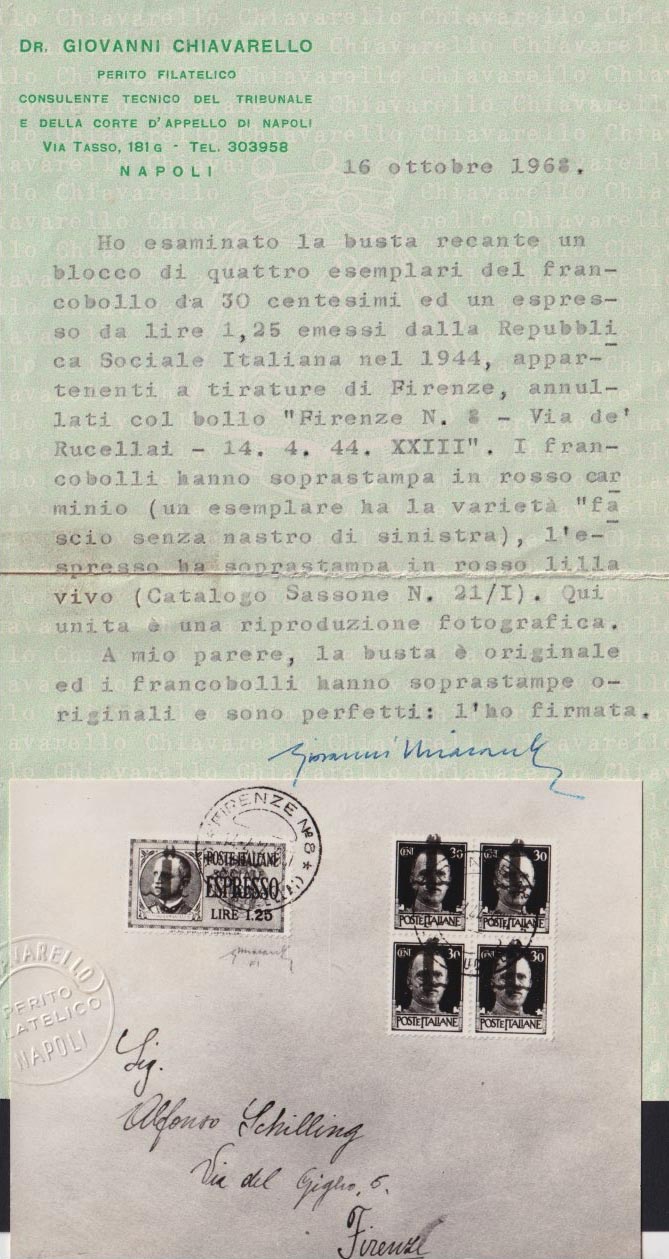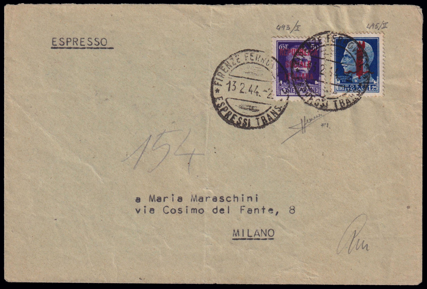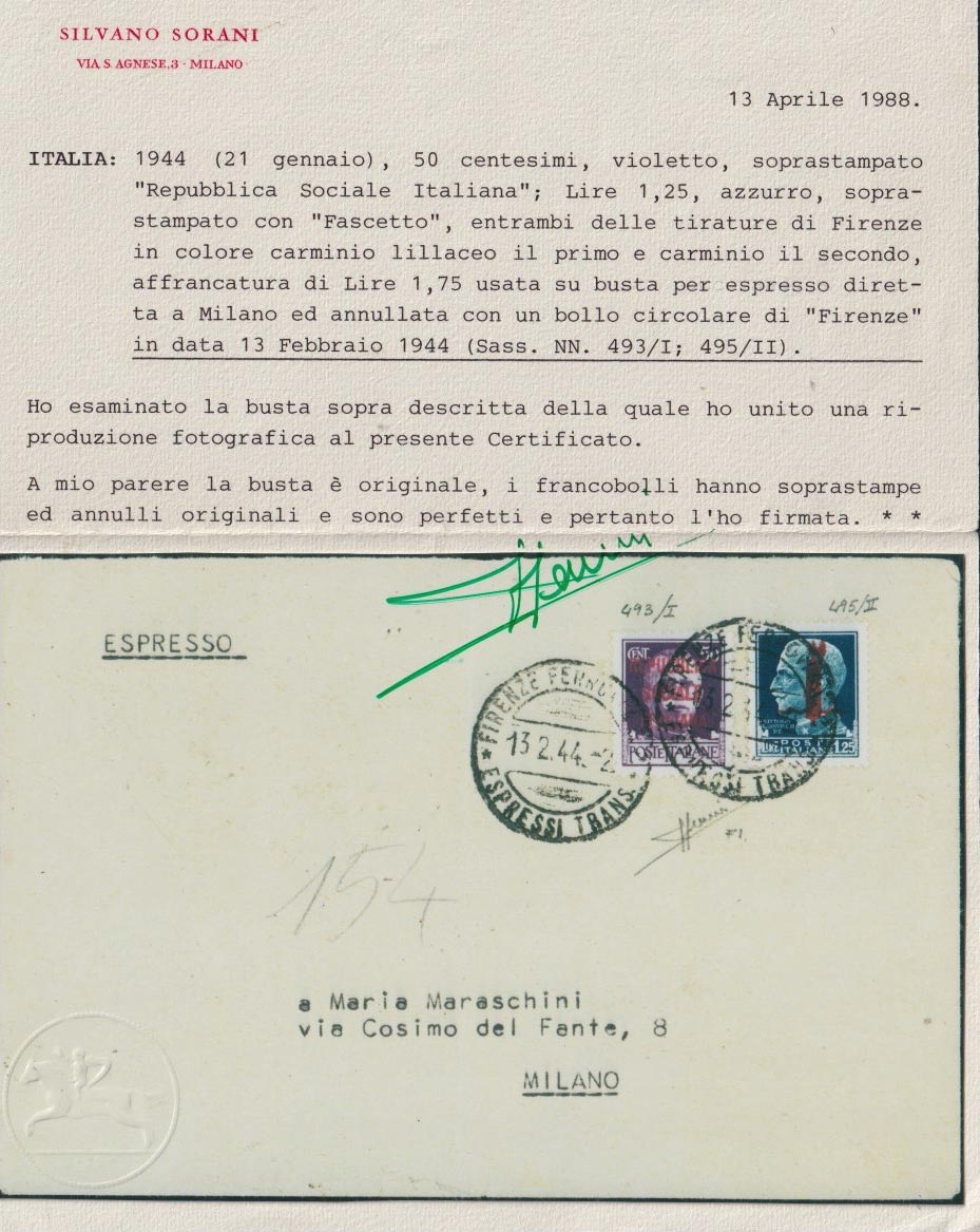 128 L imageTIRATURA DI FIRENZE - VARIETA'. Lettera espresso spedita da Firenze per Milano il 13/2/44 affrancata in tariffa con un francobollo da 50 c. con sioprastampa RSI carminio lillaceo ed un francobollo da 1,25 lire con soprastampa "fascio" rossa. Timbro di arrivo in data 14/2/44. Dettagliato certificato Sorani. (Image) (ImageA) (ImageB)