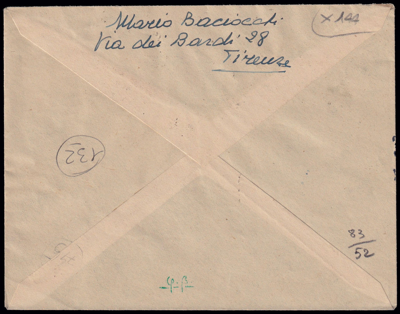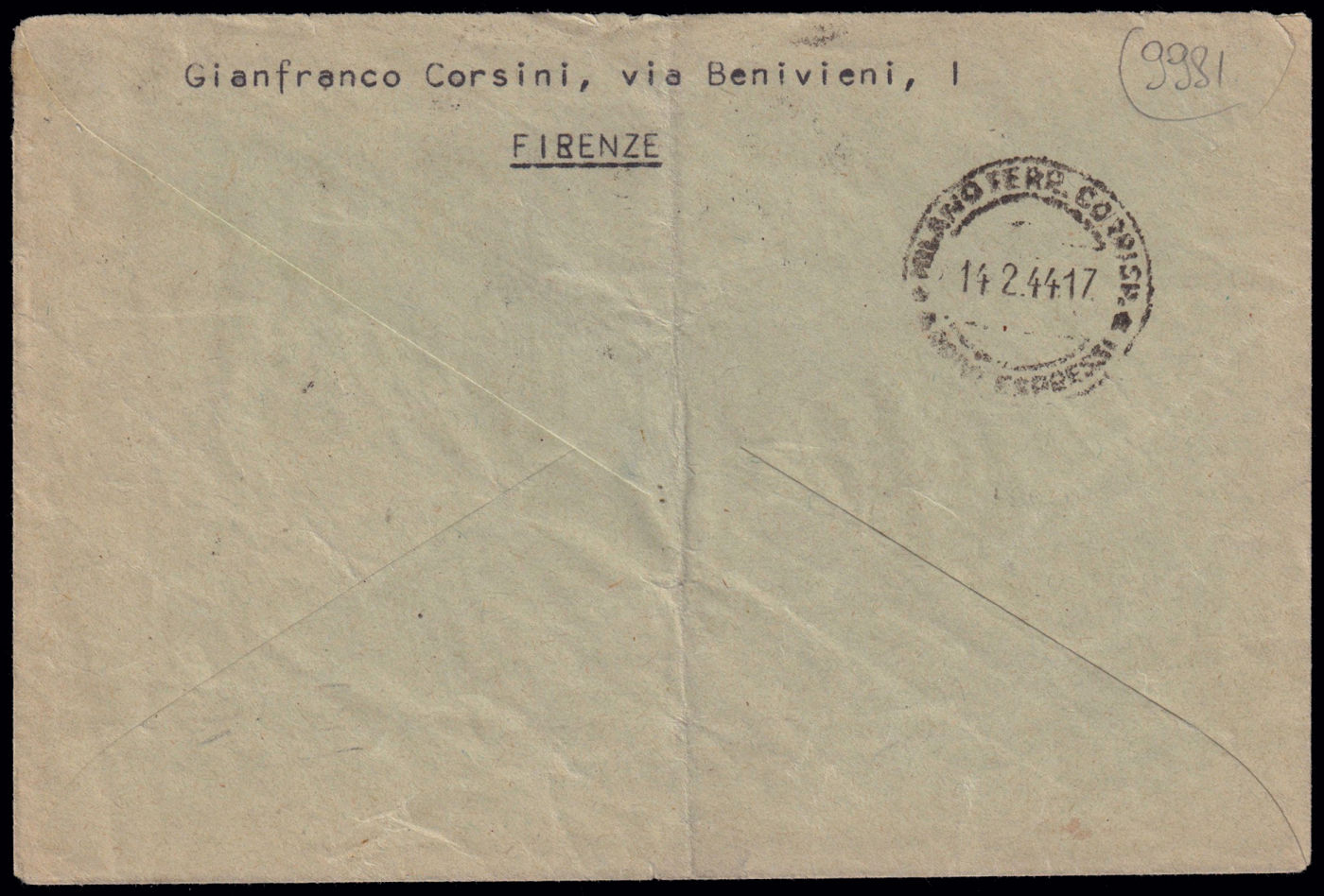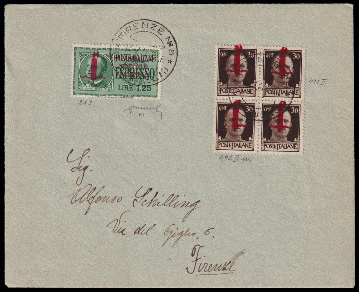128 L imageTIRATURA DI FIRENZE - VARIETA'. Lettera espresso spedita da Firenze per Milano il 13/2/44 affrancata in tariffa con un francobollo da 50 c. con sioprastampa RSI carminio lillaceo ed un francobollo da 1,25 lire con soprastampa "fascio" rossa. Timbro di arrivo in data 14/2/44. Dettagliato certificato Sorani. (Image) (ImageA) (ImageB)