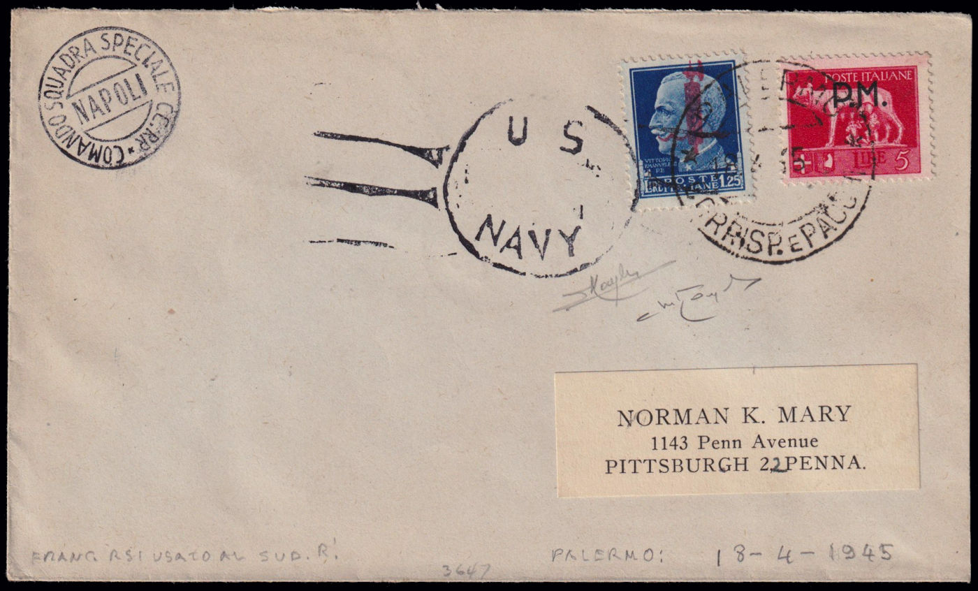 124 L imageAFFRANCATURA MISTA RSI - PM. Busta con timbro "Comando squadra speciale CCRR NAPOLI" affrancata con francobollo da 1,25 lire RSI unitamente a francobollo da 5 lire soprastampato PM annullati col timbro postale di Palermo il 18/4/45 ed a lato il bollo meccanico "US NAVY". Al retri timbro di transito 5/5/45. Firme di garanzia L. Raybaudi e M. Raybaudi. (Image) (ImageA)