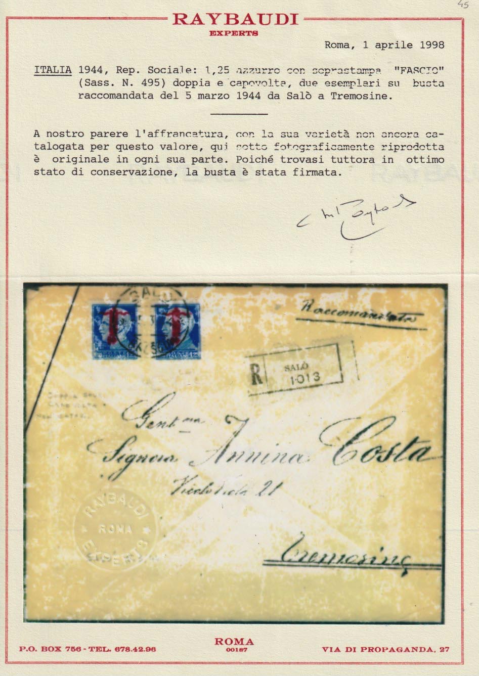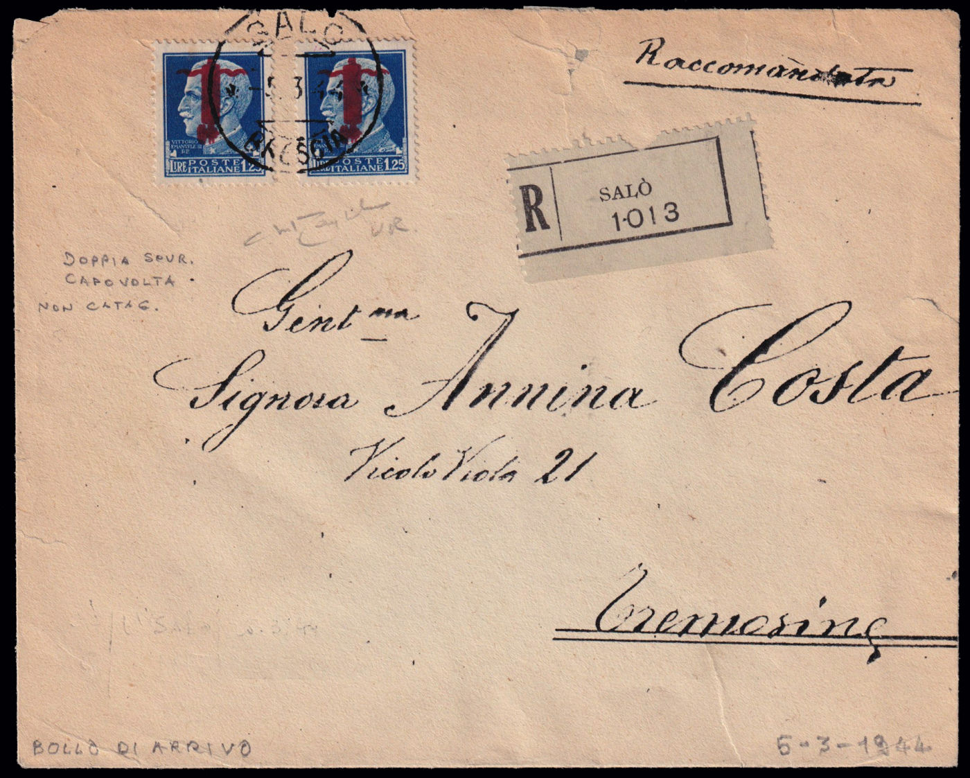 125 L imageDOPPIA SOPRASTAMPA CAPOVOLTA. Lettera raccomandata spedita da Salò per Tremosine il 5/3/44 ed affrancata con due francobolli da lire 1,25 (Sassone 495d) con la vistosa varietà di soprastampa della tiratura di Verona. Timbro di arrivo al retro. Dettagliato certificato di garanzia Raybaudi (1998). Raro multiplo. (Image) (ImageA) (ImageB)