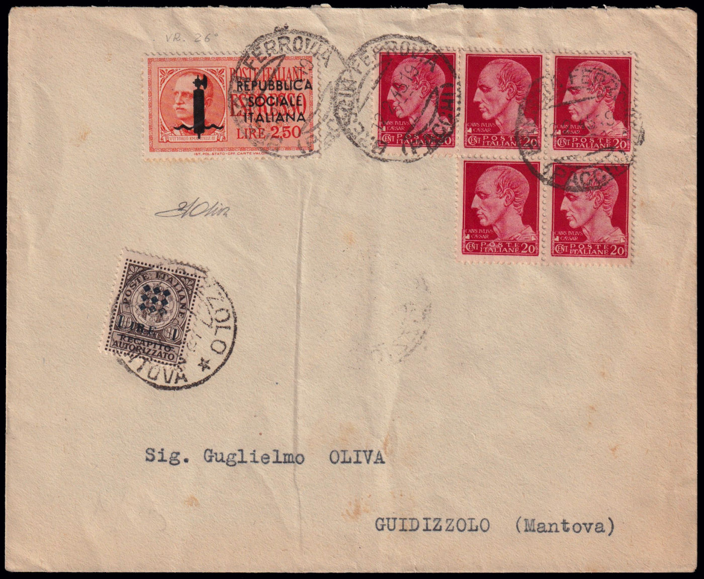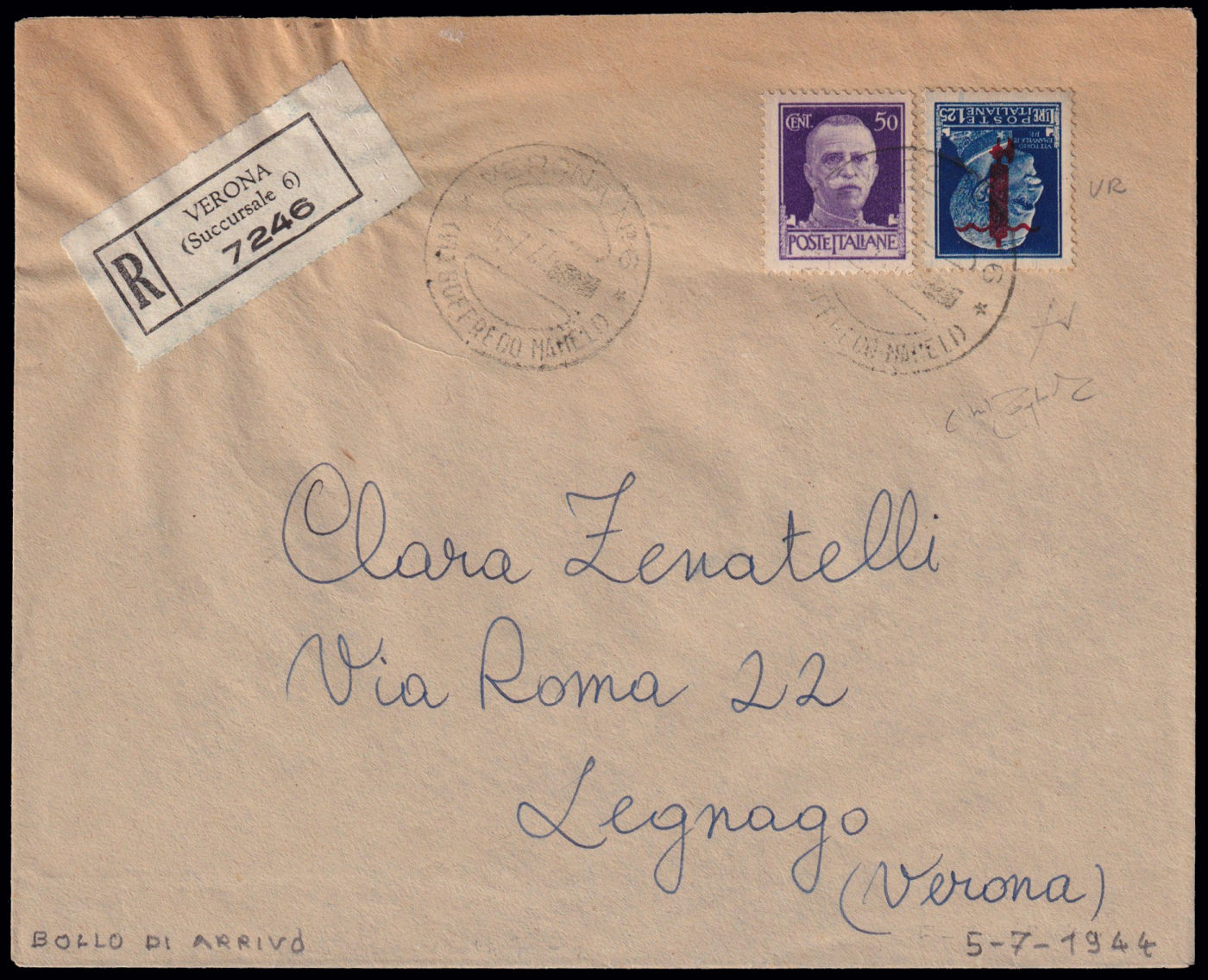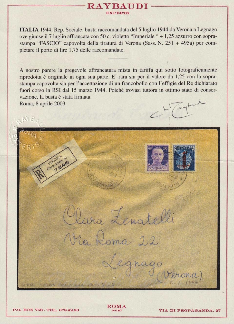 126 L imageSOPRASTAMPA CAPOVOLTA. Lettera raccomandata spedita da Verona per Legnago il 5/7/44 affrancata in tariffa con un francobollo da 50 centesimi Imperiale (fuori validità perchè con l'effigie reale) ed un francobollo da 1,25 lire con varietà della soprastampa. Timbro di arrivo al retro. Dettagliato certificato Raybaudi (2003) e firma di garanzia Fiecchi. (Image) (ImageA) (ImageB)