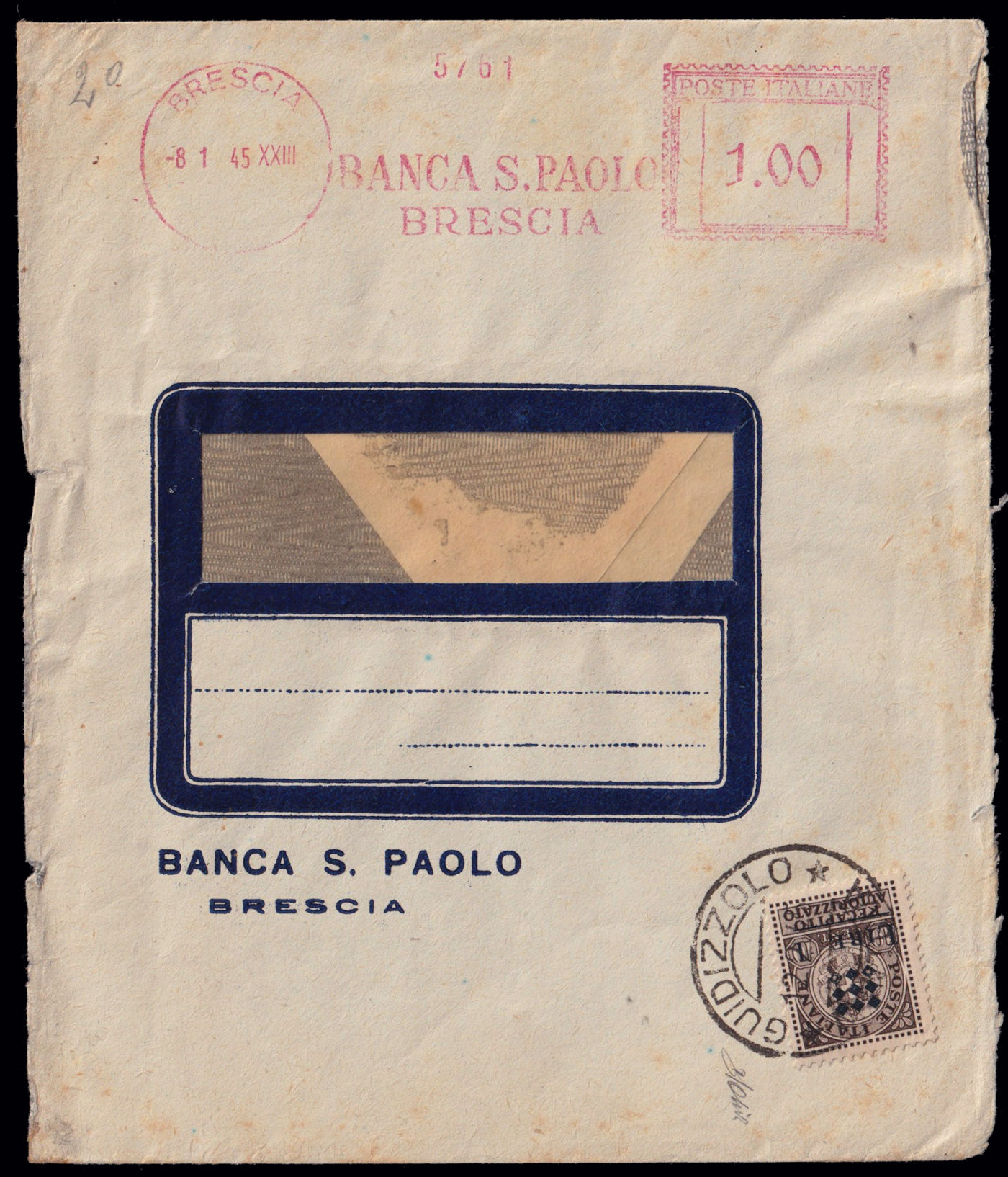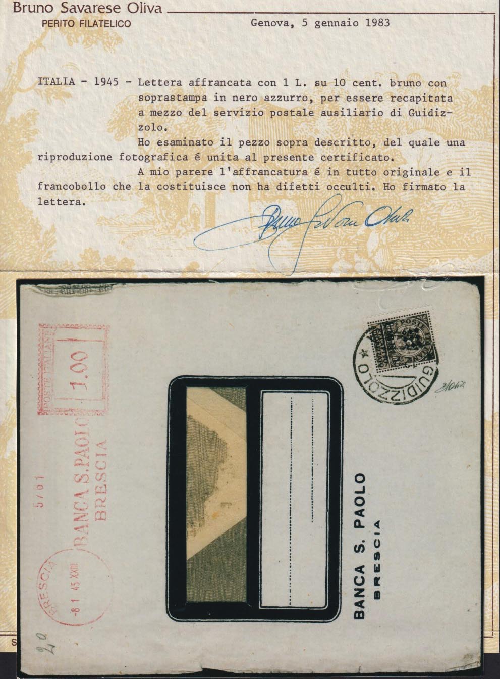 129 L imageAFFRANCATURA MECCANICA ROSSA. Busta della Banca San Paolo affrancata con la affrancatrice meccanica interna alla filiale di Brescia per 1 lira in data 8/1/45 e diretta a Guidizzolo ove venne tassata con la marca per il recapito locale da 1 lira annullata in data 12/2/45. Al retro timbro di arrivo. Dettagliato certificato di garanzia Savarese-Oliva (1983). Ex coll. J.S. Oliva e M. Perani. Massima rarità di tutte le affrancature di emergenza della RSI. (Image) (ImageA) (ImageB)