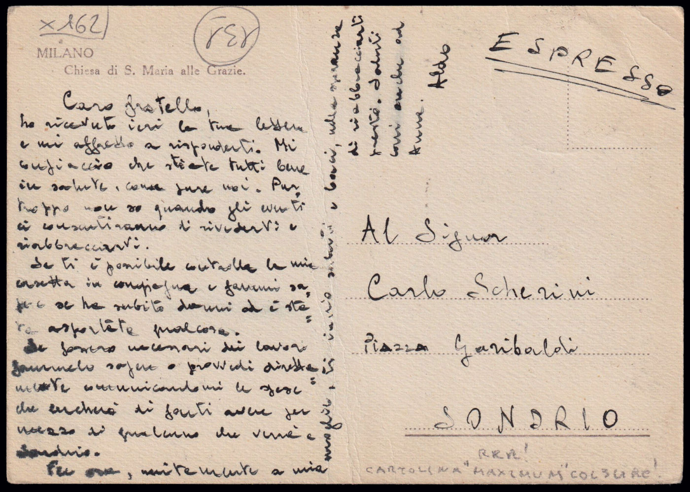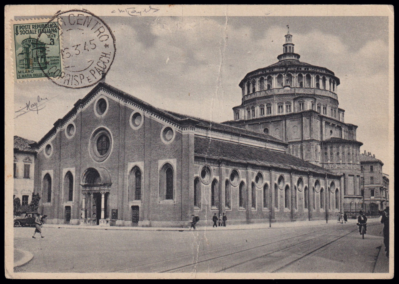 131 L imageMONUMENTI DISTRUTTI. Cartolina "maximum" spedita da Milano per Sondrio il 16/3/45 ed affrancata con l'alto valore da 3 lire isolato. Firme di garanzia L. Raybaudi e M. Raybaudi (Image) (ImageA)