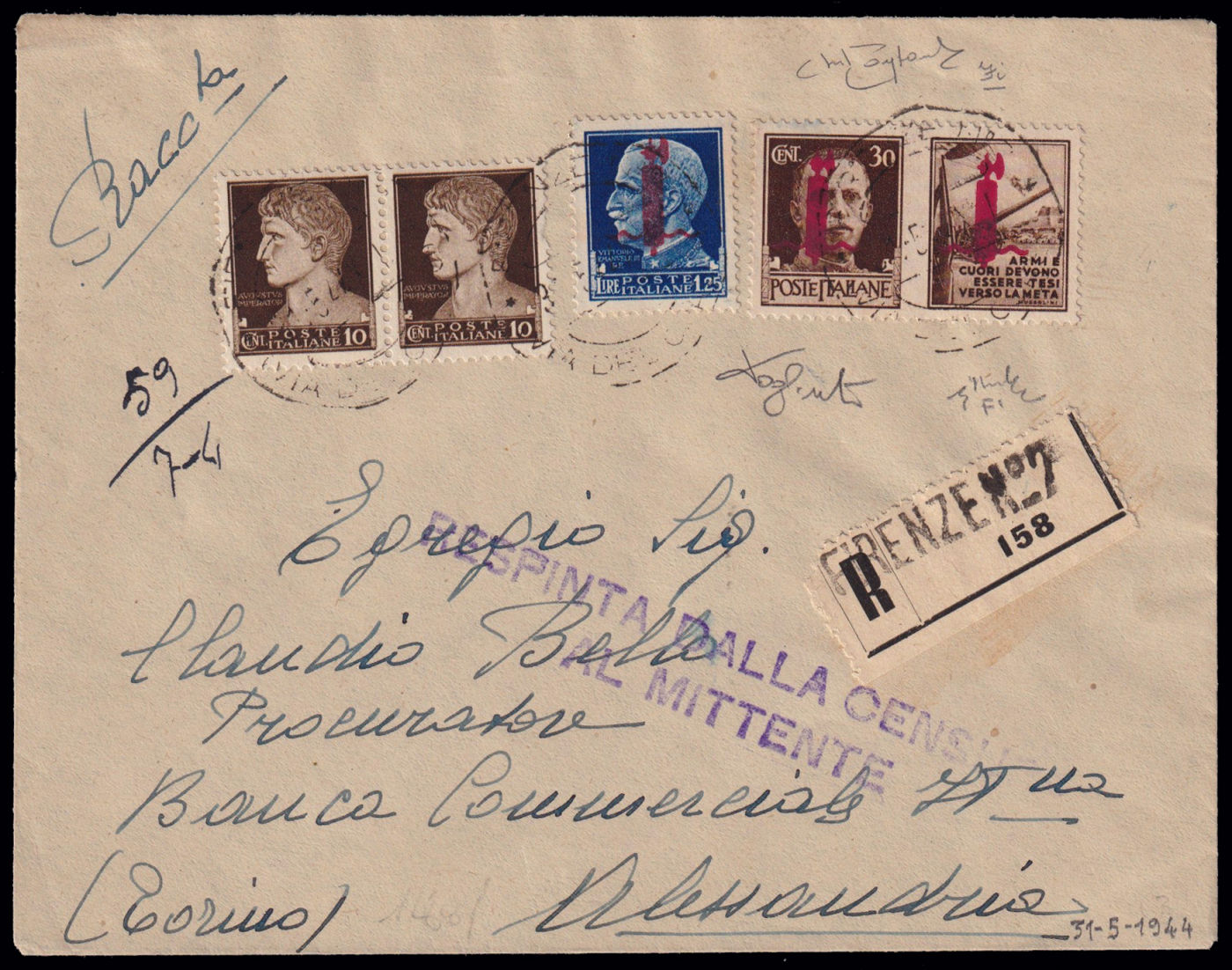 132 L imageSOPRASTAMPA SULLE DUE SEZIONI CARMINIO LILLACEO. Lettera raccomandata spedita da Firenze per Alessandria il 31/5/44 ed affrancata in tariffa con combinazione composta da 2 francobolli Imperiale da 10 centesimi, un francobollo da 1,25 lire RSI e il valore di Propaganda da 30 centesimi "Esercito" (Classici d'Italia 925La, Sassone 42). Firma di garanzia Raybaudi. (Image) (ImageA)