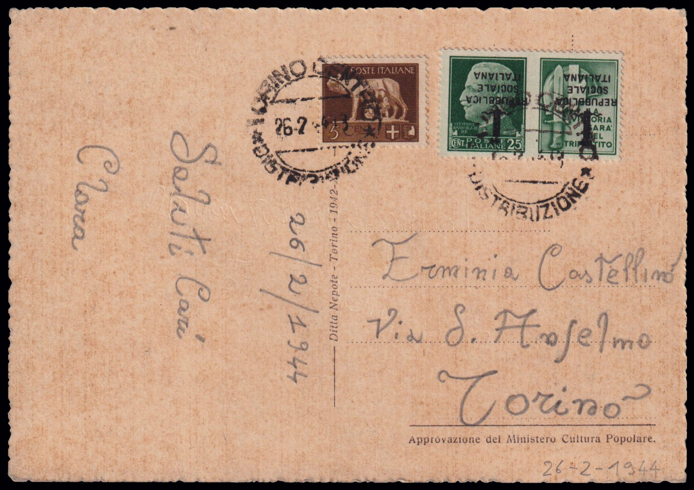 133 L imageSOPRASTAMPA SULLE DUE SEZIONI CAPOVOLTA. Cartolina spedita da Torino per città il 26/2/44 affrancata con un francobollo da 5 centesimi Imperiale e il raro francobollo di Propaganda "Milizia" con varietà di soprastampa. Rara. (Image) (ImageA)