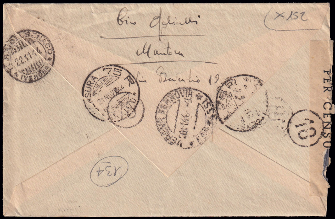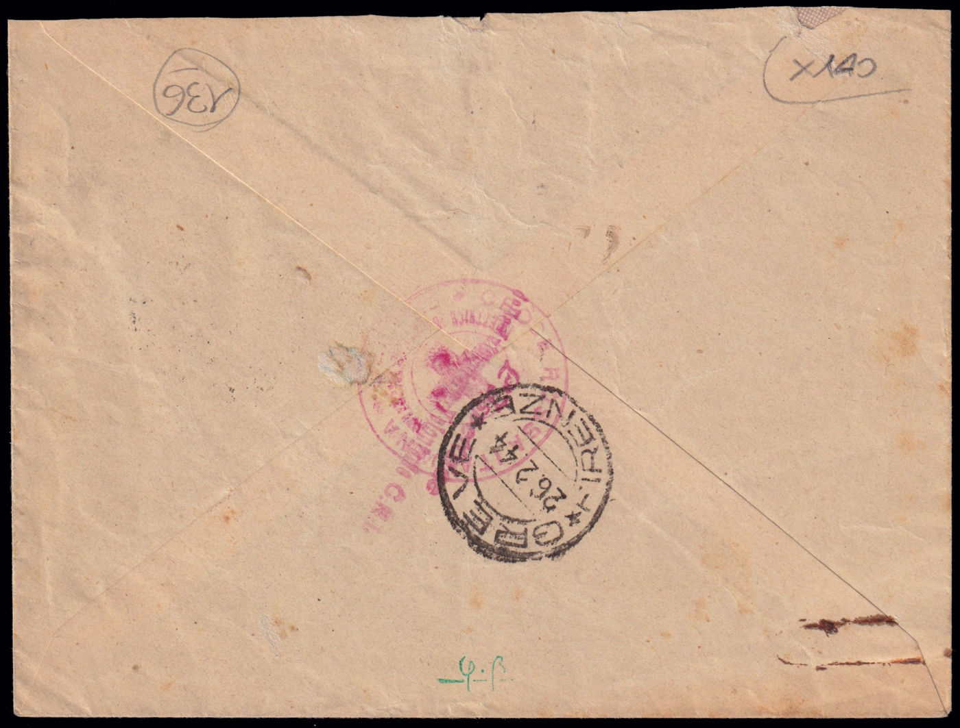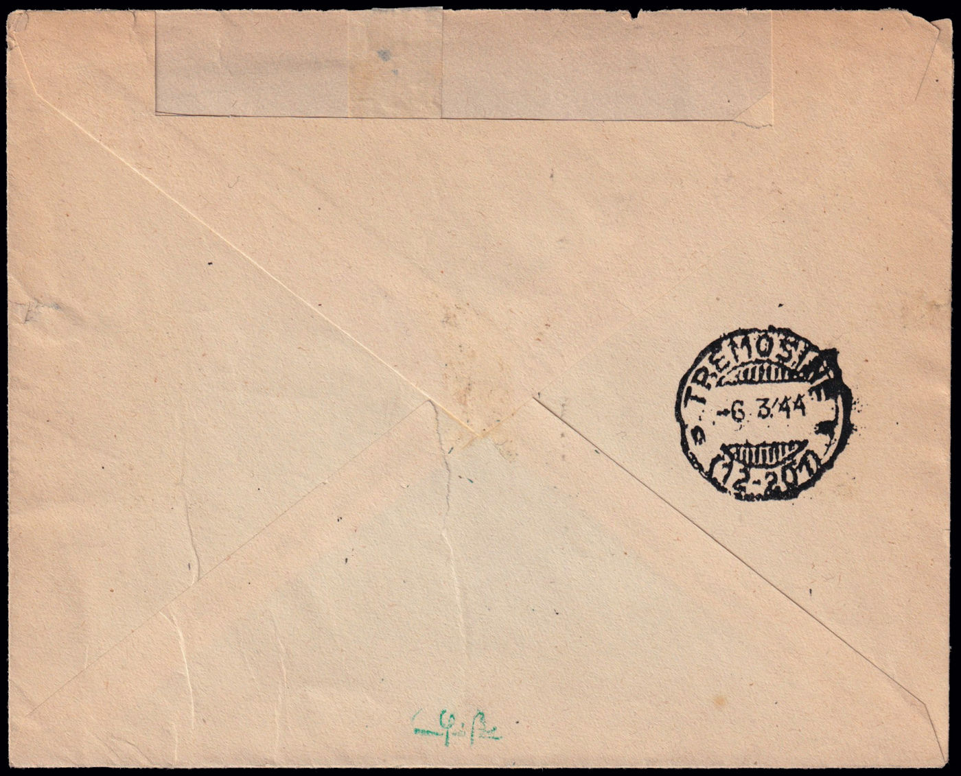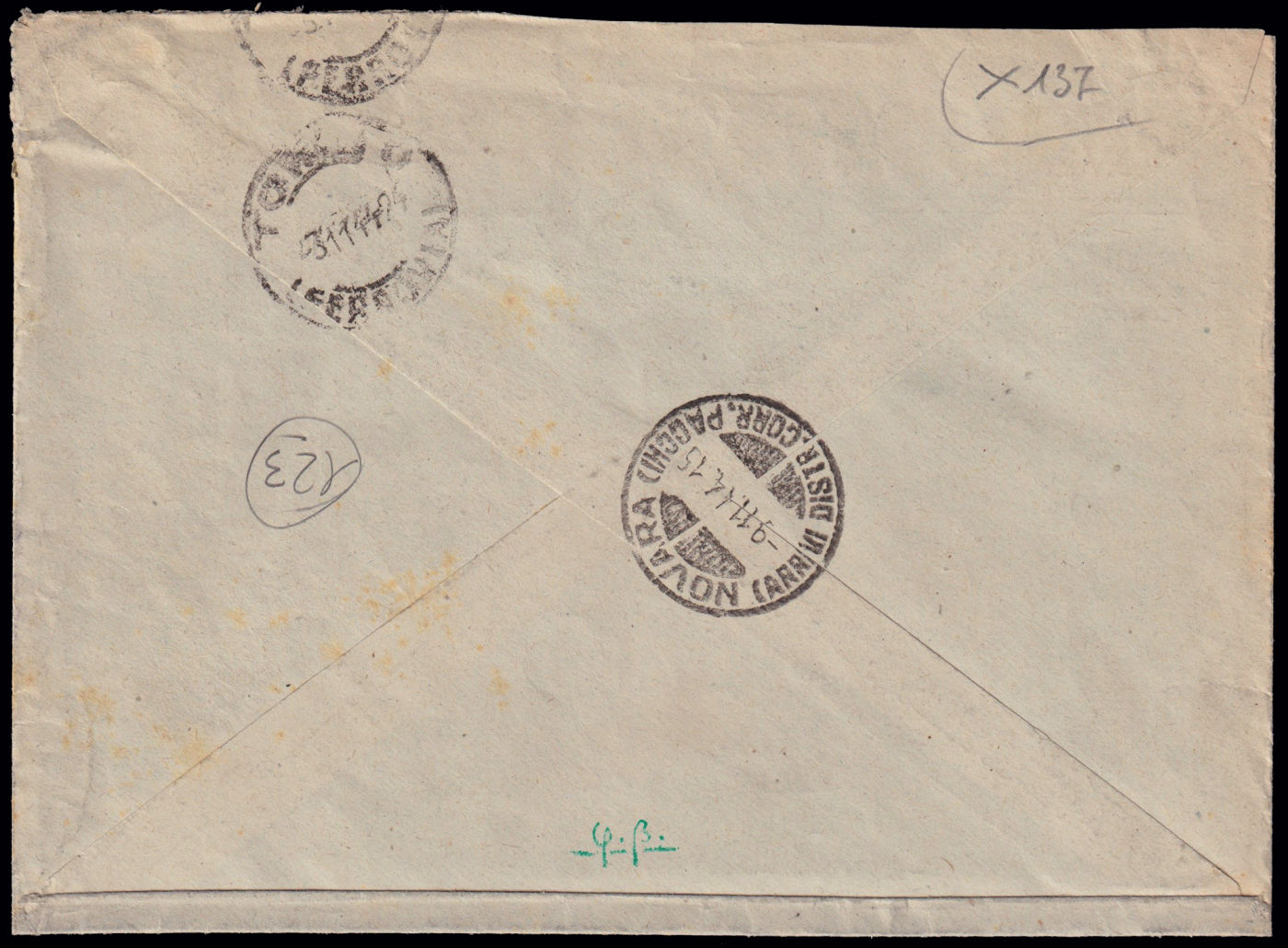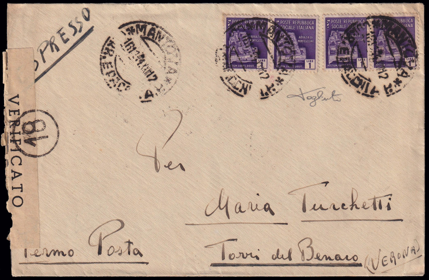 134 L imageESPRESSO FERMO IN POSTA. Busta affrancata con 4 francobolli da 1 lira Mon. Distrutti e spedita da Mantova per Torri del Benaco il 16/11/1944. Fascetta di censura e timbri di transito e arrivo. La tariffa per la corrispondenza "ferma in posta" era di 50 centesimi (oppure 30 se pagato dal mittente )oltre al porto dovuto ma le corrispondenze "espresse" potevano essere indirizzate "fermo posta" senza il pagamento di alcuna soprattassa. In questo caso il mittente pagò tutto per avere la certezza del recapito nel momento più drammatico della II Guerra Mondiale. (Image) (ImageA)