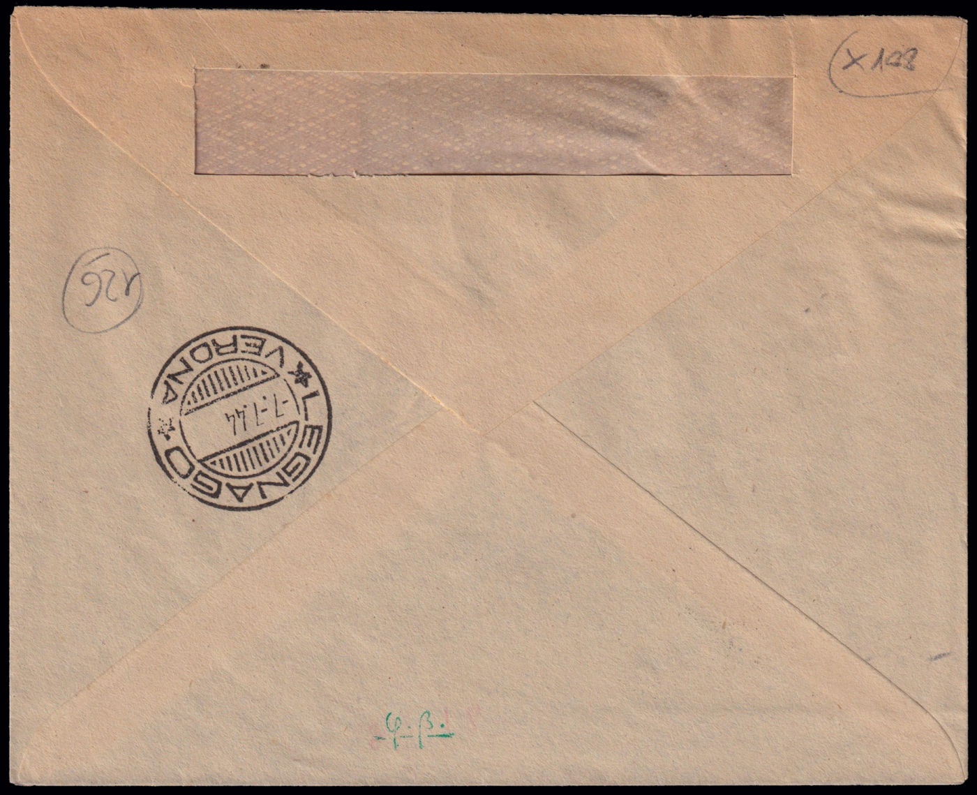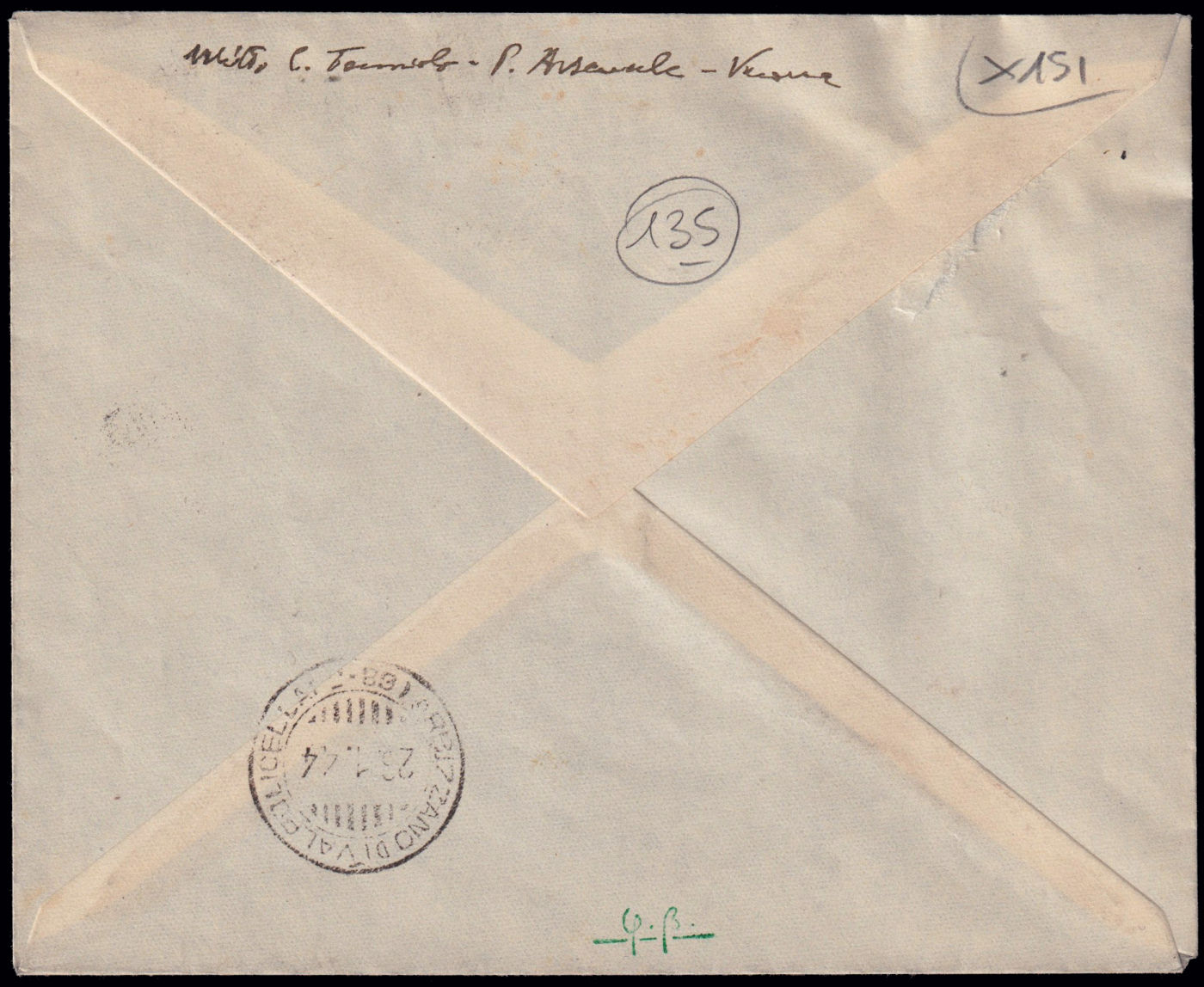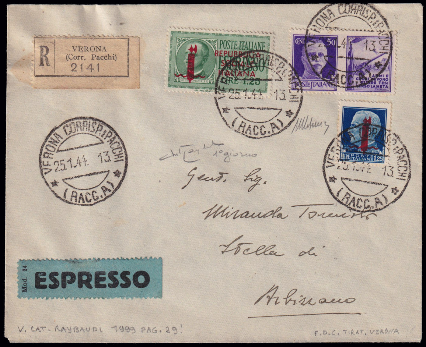 135 L imagePRIMO GIORNO DI EMISSIONE TIRATURA DI VERONA. Busta raccomandata spedita da Verona per Arbizzano il 25/1/44 affrancata con due francobolli soprastampati fra cui l'espresso da 1,25 lire. Timbro di arrivo al retro. Ex Coll. Tomiolo. (Image) (ImageA)
